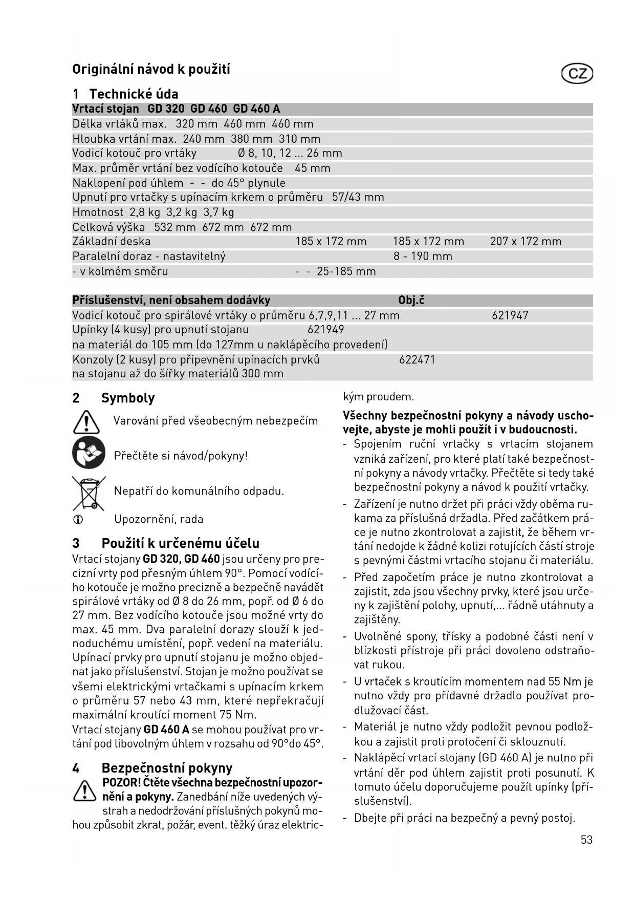 Не выбрасывайте электроинструменты вместе с бытовыми отходами! Передайте инструмент, оснастку и упаковку для экологичной утилиза- ции. Соблюдайте действующие национальные инструкции. Информация по директиве REACh: www.festool.com/reach53 Originální návod k použití 1 Technické úda Vrtací stojan GD 320 GD 460 GD 460 A Délka vrtáků max. 320 mm 460 mm 460 mm Hloubka vrtání max. 240 mm 380 mm 310 mm Vodicí kotouč pro vrtáky Ø 8, 10, 12 ... 26 mm Max. průměr vrtání bez vodícího kotouče 45 mm Naklopení pod úhlem - - do 45° plynule Upnutí pro vrtačky s upínacím krkem o průměru 57/43 mm Hmotnost 2,8 kg 3,2 kg 3,7 kg Celková výška 532 mm 672 mm 672 mm Základní deska 185 x 172 mm 185 x 172 mm 207 x 172 mm Paralelní doraz - nastavitelný 8 - 190 mm - v kolmém směru - - 25-185 mm Příslušenství, není obsahem dodávky Obj.č Vodicí kotouč pro spirálové vrtáky o průměru 6,7,9,11 ... 27 mm 621947 Upínky (4 kusy) pro upnutí stojanu 621949 na materiál do 105 mm (do 127mm u naklápěcího provedení) Konzoly (2 kusy) pro připevnění upínacích prvků 622471 na stojanu až do šířky materiálů 300 mm 2 Symboly Varování před všeobecným nebezpečím Přečtěte si návod/pokyny! Nepatří do komunálního odpadu. Upozornění, rada 3 Použití k určenému účelu Vrtací stojany GD 320, GD 460 jsou určeny pro pre- cizní vrty pod přesným úhlem 90°. Pomocí vodící- ho kotouče je možno precizně a bezpečně navádět spirálové vrtáky od Ø 8 do 26 mm, popř. od Ø 6 do 27 mm. Bez vodícího kotouče jsou možné vrty do max. 45 mm. Dva paralelní dorazy slouží k jed- noduchému umístění, popř. vedení na materiálu. Upínací prvky pro upnutí stojanu je možno objed- nat jako příslušenství. Stojan je možno používat se všemi elektrickými vrtačkami s upínacím krkem o průměru 57 nebo 43 mm, které nepřekračují maximální kroutící moment 75 Nm. Vrtací stojany GD 460 A se mohou používat pro vr- tání pod libovolným úhlem v rozsahu od 90°do 45°. 4 Bezpečnostní pokyny POZOR! Čtěte všechna bezpečnostní upozor- nění a pokyny. Zanedbání níže uvedených vý- strah a nedodržování příslušných pokynů mo- hou způsobit zkrat, požár, event. těžký úraz elektric- kým proudem. Všechny bezpečnostní pokyny anávody uscho- vejte, abyste je mohli použít iv budoucnosti. - Spojením ruční vrtačky s vrtacím stojanem vzniká zařízení, pro které platí také bezpečnost- ní pokyny a návody vrtačky. Přečtěte si tedy také bezpečnostní pokyny a návod k použití vrtačky. - Zařízení je nutno držet při práci vždy oběma ru- kama za příslušná držadla. Před začátkem prá- ce je nutno zkontrolovat a zajistit, že během vr- tání nedojde k žádné kolizi rotujících částí stroje s pevnými částmi vrtacího stojanu či materiálu. - Před započetím práce je nutno zkontrolovat a zajistit, zda jsou všechny prvky, které jsou urče- ny k zajištění polohy, upnutí,... řádně utáhnuty a zajištěny. - Uvolněné spony, třísky a podobné části není v blízkosti přístroje při práci dovoleno odstraňo- vat rukou. - U vrtaček s kroutícím momentem nad 55 Nm je nutno vždy pro přídavné držadlo používat pro- dlužovací část. - Materiál je nutno vždy podložit pevnou podlož- kou a zajistit proti protočení či sklouznutí. - Naklápěcí vrtací stojany (GD 460 A) je nutno při vrtání děr pod úhlem zajistit proti posunutí. K tomuto účelu doporučujeme použít upínky (pří- slušenství). - Dbejte při práci na bezpečný a pevný postoj.54 - Při všech pracích, které slouží přípravě, montá- ži, přestavbě, nastavení, výměně vrtáků či údrž- bě a ošetřování, je nutno vytáhnout zástrčku vr- tačky ze sítě. 5 Ovládací prvky 1 Základová deska 2 Paralelní vodítko 3 Vodicí kotouč pro vrtáky 4 Vodicí tyče 5 Pružiny 6 Dorazová trubka 7 Hloubkové dorazy 8 Vodicí objímka 9 Redukce D 57/43 mm 10 Přídavné držadlo 11 Nástavec přídavného držadla 12 Upínky 13 Konzoly 14 Šroub pro nastavení kolmosti 15 Patky 16 Upínací matice 17 Stupnice 18 Ukazatel 19 Utahovací šroub ukazatele 20 Třmen Zobrazené anebo popsané příslušenství ne musí být součástí dodávky. Uvedené obrázky se nachází na začátku návodu kobsluze. 6 Uvedení do provozu a použití