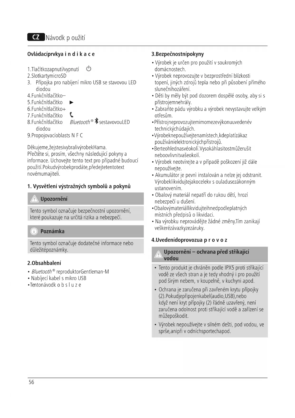 - Výrobek nepoužívejte vsilném dešti, pod vodou, ve sprše, ani přivodních sportech apod. C Návod kpoužití57