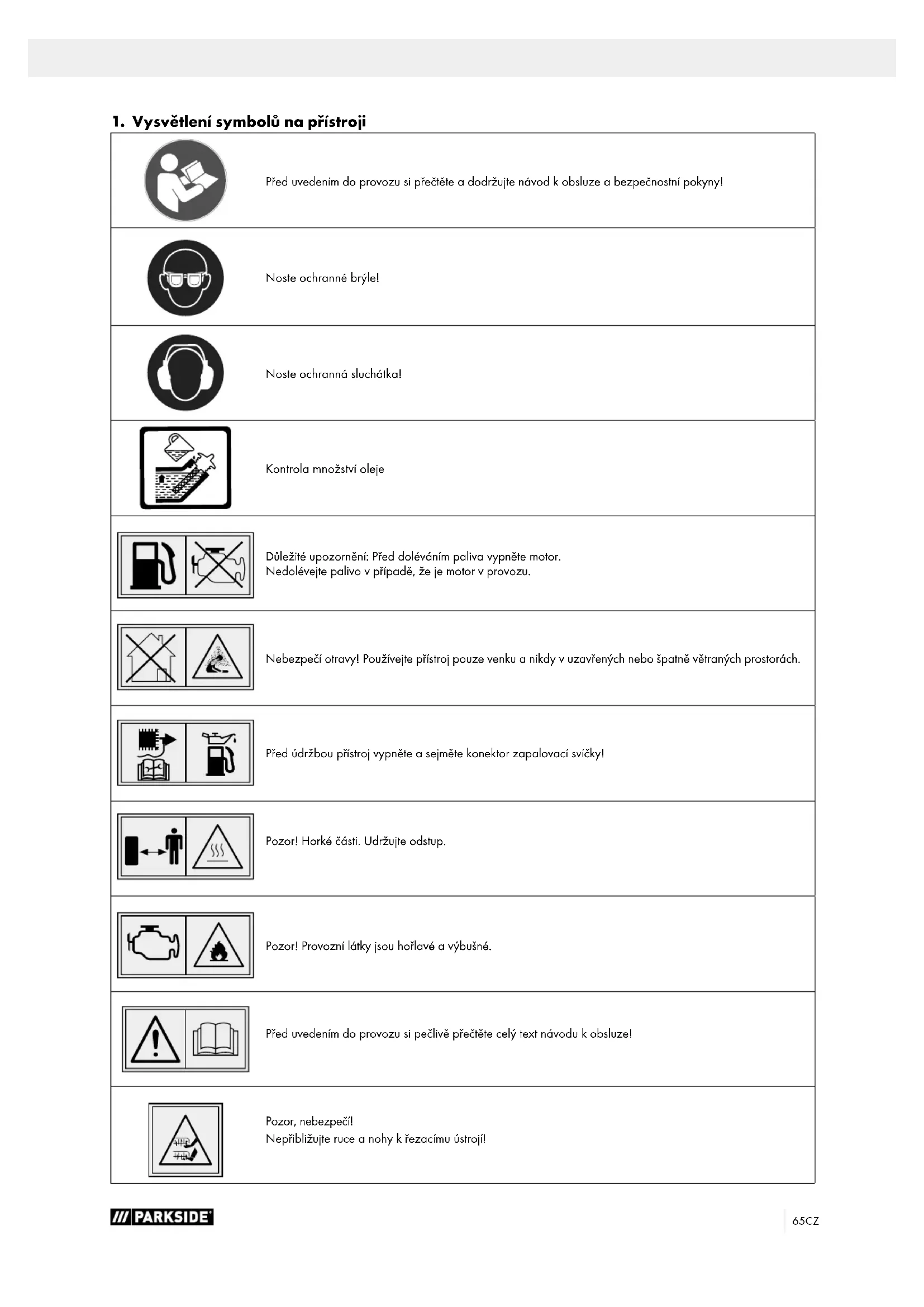 Před uvedením do provozu si přečtěte a dodržujte návod k obsluze a bezpečnostní pokyny! Noste ochranné brýle! Noste ochranná sluchátka! Kontrola množství oleje Důležité upozornění: Před doléváním paliva vypněte motor. Nedolévejte palivo v případě, že je motor v provozu. Nebezpečí otravy! Používejte přístroj pouze venku a nikdy v uzavřených nebo špatně větraných prostorách. Před údržbou přístroj vypněte a sejměte konektor zapalovací svíčky! Pozor! Horké části. Udržujte odstup. Pozor! Provozní látky jsou hořlavé a výbušné. Před uvedením do provozu si pečlivě přečtěte celý text návodu k obsluze! Pozor, nebezpečí! Nepřibližujte ruce a nohy k řezacímu ústrojí!66 CZ Pozor! Nebezpečí zranění vymrštěnými předměty! Garantovaná hladina akustického výkonu přístroje Výrobek odpovídá platným evropským směrnicím. STOP MOTOR Přístroj se zastaví při uvolnění madla bezpečnostního spínače. Místa, která se týkají bezpečnosti, jsme v tomto návodu k obsluze označili touto značkou. Objem záchytného koše Hmotnost v kg Pracovní záběr Objem nádrže Motorový olej NEBEZPEČÍ! Signální slovo označující bezprostředně nastávající nebezpečnou situaci, která může mít za následek smrt nebo vážné zranění, pokud se jí nezabrání.67CZ VAROVÁNÍ! Signální slovo označující potenciálně nebezpečnou situaci, která by mohla mít za následek smrt nebo vážné zranění, pokud se jí nezabrání. OPATRNĚ! Signální slovo označující potenciálně nebezpečnou situaci, která by mohla mít za následek lehké nebo středně těžké zranění, pokud se jí nezabrání. UPOZORNĚNÍ Signální slovo označující potenciálně nebezpečnou situaci, která by mohla mít za následek poškození výrobku nebo vlastnictví/majetku.68 CZ