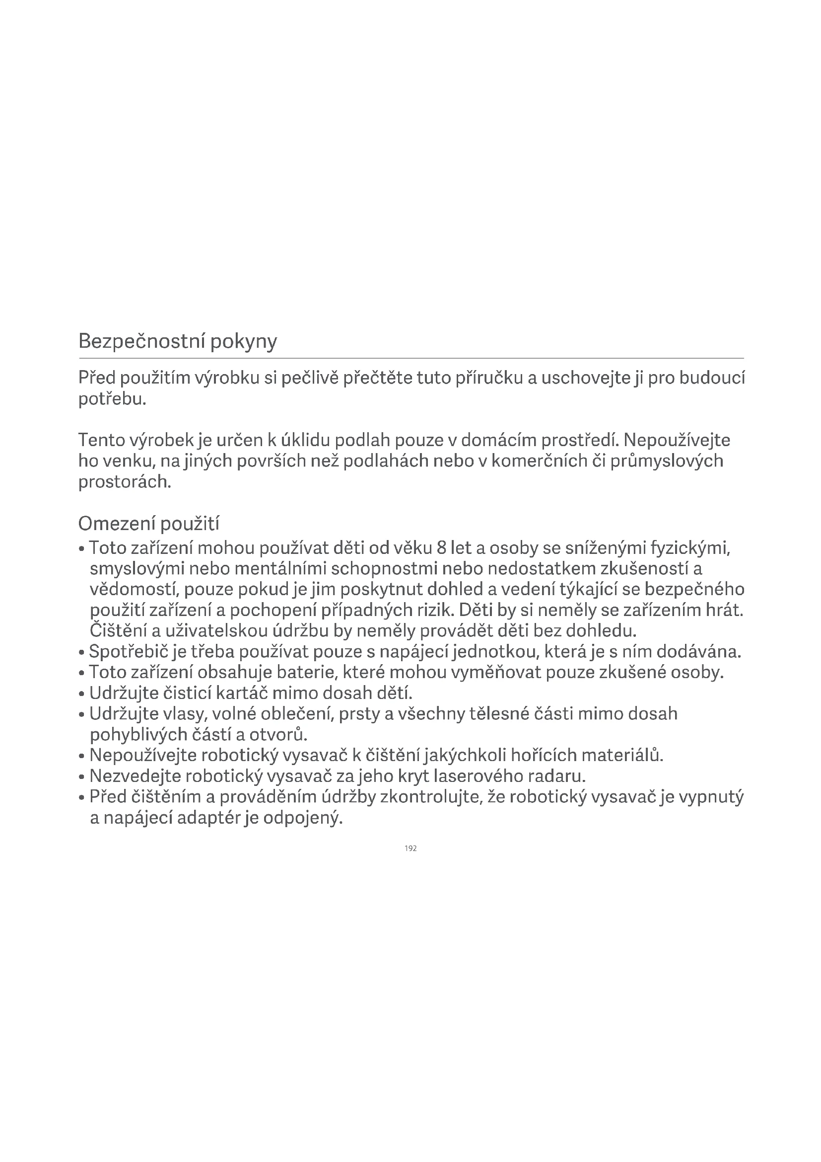 - Před čištěním a prováděním údržby zkontrolujte, že robotický vysavač je vypnutý a napájecí adaptér je odpojený. Před použitím výrobku si pečlivě přečtěte tuto příručku auschovejte ji pro budoucí potřebu. Tento výrobek je určen k úklidu podlah pouze v domácím prostředí. Nepoužívejte ho venku, na jiných površích než podlahách nebo v komerčních či průmyslových prostorách.193