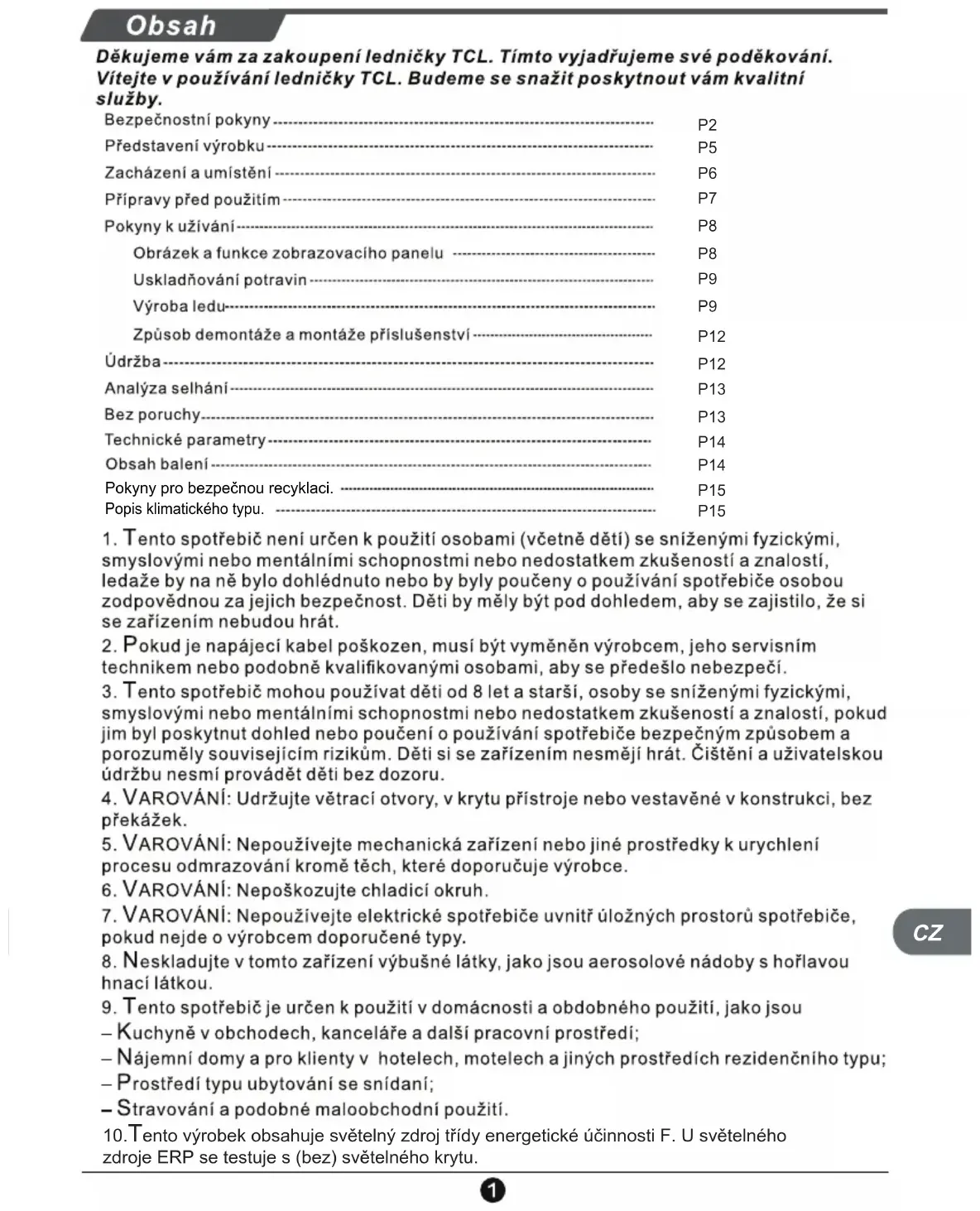 SN + 10 to + 32+ 16 to + 32+ 16 to + 38+ 16 to + 43TTřídaRozšířené mírnéMírnýSubtropickýTropický Tabulka 1 Klimatické třídy Rozšířená teplota: „toto chladicí za řízení je určeno k použití při okolních teplotách v rozmezí od 10 ° C do 32 ° C“; temperate: „toto chladicí zařízení je určeno k použití při okolních teplotách v rozmezí od 16 ° C do 32 ° C“; Subtropické: „toto chladicí zařízení je určeno k použití při okolních teplotách v rozmezí od 16 ° C do 38 ° C“; Tropical: „toto chladicí zařízení je určeno k použití při okolních teplotách v rozmezí od 16 ° C do 43 ° C“; Popis klimatického typu. Vážený zákazníku Vážený zákazníku, pokud potřebujete zákaznický servis, další informace najdete v záručním listu Likvidace:Staré spotřebiče mají stále určitou nadhodnotu. Ekologický přístup zajistí recyklaci cenných surovin.Chladiva použitá ve vaší chladničce a izolační materiály vyžadují speciální postupy zacházení. Před manipulací se ujistěte, že na zadní straně chladničky není žádné poškození potrubí. Aktuální informace o možnostech likvidace staré chladničky a obalů ze starého zařízení lze získat na místním obecním úřadě.Správná likvidace tohoto produktu:Znamená to, že tento produkt by neměl být likvidován s jinými domovními odpady v celé EU. Abyste zabránili možnému poškození životního prostředí nebo lidského zdraví nekontrolovanou likvidací odpadu, recyklujte jej odpovědně, abyste podpořili udržitelné opětovné použití materiálových zdrojů. Chcete-li vrátit použité zařízení, použijte systémy pro vrácení a sběr nebo kontaktujte prodejce, u kterého byl produkt zakoupen. Mohou tento produkt odevzdat k bezpečné recyklaci pro životní prostředí.Pokyny pro bezpečnou recyklaci. 15■Należy uważnie przeczytać instrukcję obsługi przed włączeniem zasilania i odpowiednią ją przechowywać. ■Produkty mogą ulec zmianie bez powiadomienia. Sprzęt AGD TCL (Hefei) Sp. z o.o. Adres: Nr 10 Yunhu Road, Economic Development Zone, Hefei City, prowincja Anhui, Chiny Dwudrzwiowa lodówka do użytku domowego