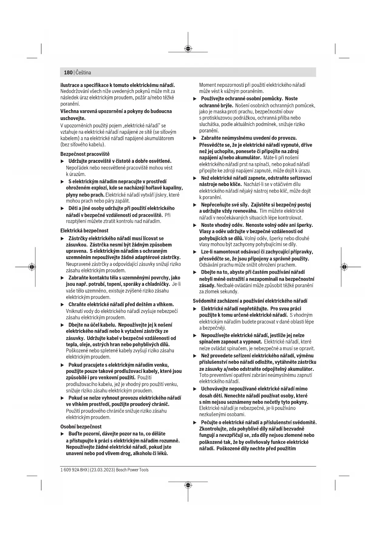 45°; 30°; 22,5°; 15° 15°; 22,5°; 30°; 45° – Povolte zajišťovací knoflík (18), pokud je utažený. – Vytáhněte páčku (19) aotočte stůl pily (14) až kpožadovanému zářezu vlevo nebo vpravo. – Páčku opět uvolněte. Páčka musí znatelně zaskočit do zářezu. – Zajišťovací knoflík (18) opět utáhněte. Nastavení libovolných horizontálních pokosových úhlů (viz obrázek K) Horizontální pokosový úhel lze nastavit vrozsahu od 48° (na levé straně) do 48° (na pravé straně). – Povolte zajišťovací knoflík (18), pokud je utažený. – Vytáhněte páčku (19) asoučasně stiskněte aretační svorku (17), až zaskočí do příslušné drážky. Takto lze stolem pily volně pohybovat. – Otáčejte stůl pily (14) za zajišťovací knoflík doleva nebo doprava, až ukazatel úhlu (58) ukazuje požadovaný horizontální pokosový úhel. – Zajišťovací knoflík (18) opět utáhněte. – Pro opětovné uvolnění páčky (19) (pro nastavení standardních horizontálních pokosových úhlů) vytáhněte páčku nahoru. Aretační svěrka (17) skočí zpátky do své původní polohy apáčka (19) opět může zaskočit do zářezů (22). Nastavení vertikálních pokosových úhlů Vertikální pokosový úhel lze nastavit vrozsahu od 47° (na levé straně) do 47° (na pravé straně). Pro rychlé apřesné nastavení často používaných vertikálních pokosových úhlů jsou určené pevné polohy pro úhly 0°, 22,5° a45°. – Zkontrolujte, zda je namontované aretační kolečko(45) (viz „Montáž aretačního kolečka (viz obrázek A2)“, Stránka185). Nastavení standardních vertikálních pokosových úhlů (viz obrázekL) – Vytáhněte úplně ven nastavitelné dorazové lišty (28), resp. je zcela odstraňte. – Povolte aretační kolečko (45). – Zatáhněte aretační páčku (46) směrem ven anechte ji zaskočit vuvolněné poloze. Tím můžete využívat celý rozsah pokosového úhlu (vlevo avpravo). – Natočte rameno nářadí za rukojeť (9) doleva nebo doprava tak, aby ukazatel úhlu (30) ukazoval požadovaný standardní vertikální pokosový úhel. – Otočte aretační páčku (46). Aretační páčka musí citelně zaskočit vpoloze požadovaného standardního vertikálního pokosového úhlu. – Znovu utáhněte aretační kolečko (45). Nastavení libovolných vertikálních pokosových úhlů – Vytáhněte úplně ven nastavitelné dorazové lišty (28), resp. je zcela odstraňte. – Povolte aretační kolečko (45). – Zatáhněte aretační páčku (46) směrem ven anechte ji zaskočit vuvolněné poloze. Tím můžete využívat celý rozsah pokosového úhlu (vlevo avpravo). – Natočte rameno nářadí za rukojeť (9) doleva nebo doprava tak, aby ukazatel úhlu (30) ukazoval požadovaný vertikální pokosový úhel. – Znovu utáhněte aretační kolečko (45). Uvedení do provozu u Dbejte na správné síťové napětí! Napětí zdroje proudu musí souhlasit súdaji na typovém štítku elektronářadí. u Zajišťovací knoflík (18) aaretační kolečko (45) před řezáním vždy pevně utáhněte. Jinak se může pilový kotouč vobrobku vzpříčit. Bosch Power Tools 1 609 92A 8HX | (23.03.2023)188 | Čeština Zapnutí pracovního světla Pracovní světlo zlepšuje viditelnost vbezprostřední pracovní oblasti. Mimořádně dobrých výsledků řezání můžete dosáhnout tím, že použijete pracovní světlo společně svyznačením čáry řezu pomocí laserových paprsků. – Zapněte pracovní světlo vypínačem (6). u Nedívejte se přímo do pracovního osvětlení, může vás oslnit. Zapnutí (vizobrázekM) – Pro zapnutí elektrického nářadí nejprve přesuňte blokování zapnutí (7) doprostřed apoté stiskněte vypínač (8) adržte ho stisknutý. Upozornění: Zbezpečnostních důvodů nelze spínač (8) zaaretovat, nýbrž musí zůstat během provozu neustále stlačený. Vypnutí – Pro vypnutí uvolněte spínač (8). Soft Start Soft Start omezuje výkon při zapnutí elektrického nářadí aumožňuje provoz spojistkou 16A. Upozornění: Běží-li elektrické nářadí ihned po zapnutí splným počtem otáček, došlo kselhání omezení Soft Startu. Elektrické nářadí musí být neprodleně zasláno do servisu. Řezání Všeobecná upozornění kpile u Zajišťovací knoflík (18) aaretační kolečko (45) před řezáním vždy pevně utáhněte. Jinak se může pilový kotouč vobrobku vzpříčit. u Při všech řezech musíte nejprve zajistit, aby se pilový kotouč vžádné chvíli nemohl dotýkat dorazové lišty, šroubové svěrky nebo ostatních dílů stroje. Odstraňte případné namontované pomocné dorazy nebo je příslušně přizpůsobte. Chraňte pilový kotouč před nárazem aúderem. Nevystavujte pilový kotouč žádnému bočnímu tlaku. Řezejte pouze materiály, pro které je pila určená. Neopracovávejte žádné pokřivené obrobky. Obrobek musí vždy mít rovné hrany pro přiložení na dorazovou lištu. Dlouhé atěžké obrobky musejí být na volném konci podloženy nebo podepřeny. Zajistěte, aby kyvný ochranný kryt náležitě fungoval amohl se volně pohybovat. Při vedení ramena nářadí dolů se kyvný ochranný kryt musí otevřít. Při vedení ramena nářadí nahoru se kyvný ochranný kryt nad pilovým kotoučem musí opět zavřít avnejhornější poloze ramena nářadí se zaaretovat. Postavení obsluhy (viz obrázek N) u Nestůjte přímo před elektronářadím, nýbrž vždy stranou od pilového kotouče. Tím je vaše tělo chráněno před možným zpětným rázem. – Mějte ruce, prsty apaže daleko od rotujícího pilového kotouče. – Nepřekřižujte své ruce před ramenem nářadí. Řezání se zákluzem – Pro řezy pomocí zákluzového vedení (2) (široké obrobky) povolte upevňovací šroub (1), pokud je utažený. – Vpřípadě potřeby nastavte požad