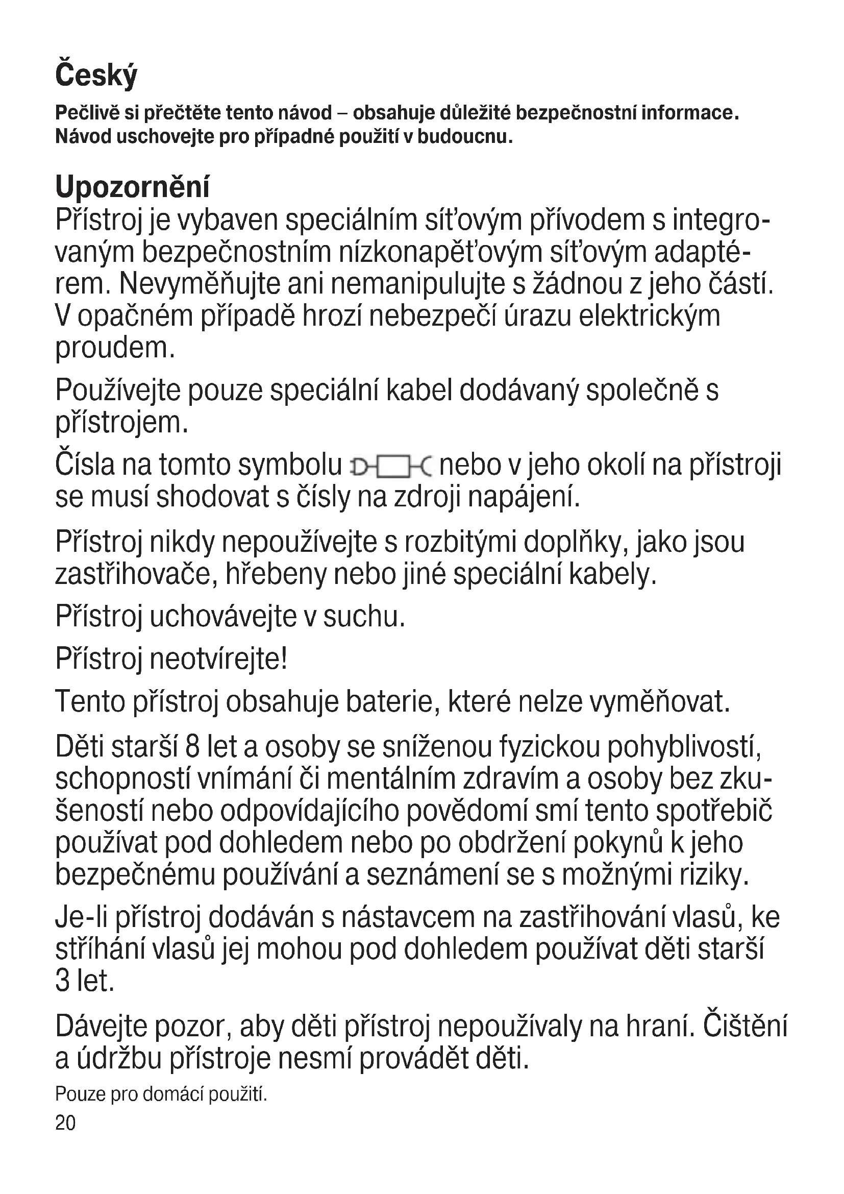 ani nie zawiesza uprawnień Kupującego wynikających z przepisów o rękojmi za wady rzeczy sprzedanej. 90340910_Type5516_BT3421_3420_3411_3410_3400x_CEEMEA.indd 1990340910_Type5516_BT3421_3420_3411_3410_3400x_CEEMEA.indd 19 20.07.22 10:0320.07.22 10:0320 Český Pečlivě si přečtěte tento návod – obsahuje důležité bezpečnostní informace. Návod uschovejte pro případné použití v budoucnu. Upozornění Přístroj je vybaven speciálním síťovým přívodem s integro- vaným bezpečnostním nízkonapěťovým síťovým adapté- rem. Nevyměňujte ani nemanipulujte s žádnou z jeho částí. V opačném případě hrozí nebezpečí úrazu elektrickým proudem. Používejte pouze speciální kabel dodávaný společně s přístrojem. Čísla na tomto symbolu nebo v jeho okolí na přístroji se musí shodovat s čísly na zdroji napájení. Přístroj nikdy nepoužívejte s rozbitými doplňky, jako jsou zastřihovače, hřebeny nebo jiné speciální kabely. Přístroj uchovávejte v suchu. Přístroj neotvírejte! Tento přístroj obsahuje baterie, které nelze vyměňovat. Děti starší 8 let a osoby se sníženou fyzickou pohyblivostí, schopností vnímání či mentálním zdravím a osoby bez zku- šeností nebo odpovídajícího povědomí smí tento spotřebič používat pod dohledem nebo po obdržení pokynů k jeho bezpečnému používání a seznámení se s možnými riziky. Je-li přístroj dodáván s nástavcem na zastřihování vlasů, ke stříhání vlasů jej mohou pod dohledem používat děti starší 3 let. Dávejte pozor, aby děti přístroj nepoužívaly na hraní. Čištění a údržbu přístroje nesmí provádět děti. Pouze pro domácí použití. 90340910_Type5516_BT3421_3420_3411_3410_3400x_CEEMEA.indd 2090340910_Type5516_BT3421_3420_3411_3410_3400x_CEEMEA.indd 20 20.07.22 10:0320.07.22 10:0321 Varování Při nabíjení se ujistěte, že je přístroj vypnutý. Důležité Doporučená okolní teplota pro nabíjení je 5 až 35 °C. Při extrémně nízkých nebo vysokých teplotách se baterie nemusí nabít správně nebo se nenabije vůbec. Doporučená okolní teplota pro holení je 15 až 35 °C. Nevystavujte holicí strojek po delší dobu teplotám přesahujícím 50 °C. Aby zastřihovač správně fungoval, mažte pravidelně zastřihovač a planžety lehkým olejem (není součástí balení). Popis 1a Hlava zastřihovače*/** 1b Hlava zastřihovače v detailu*/** 1c Hlava holicího strojku s miniplanžetou* 2 Nastavení délky 3 Tlačítko zapnutí / vypnutí 4 Napájecí zdířka 5 Zdroj napájení** 6 Kontrolka nabíjení 7 Precizní nástavec na vousy (0,5–10 mm)*/** 8 Precizní nástavec na vlasy (10,5–20 mm)*/**