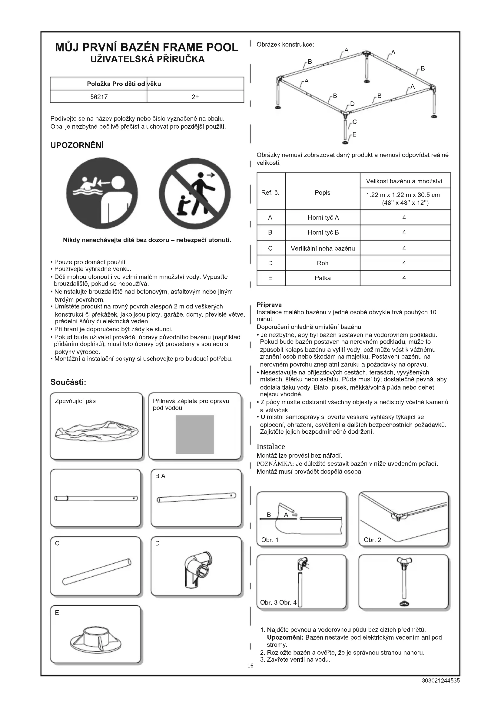 B A Zpevňující pás Přilnavá záplata pro opravu pod vodou Součásti: UPOZORNĚNÍ Nikdy nenechávejte dítě bez dozoru – nebezpečí utonutí.4. Smontujte horní tyče. Připojte horní tyč A k horní tyči B a nasuňte je do kapes na tyče (Obr. 1). Podrobnosti naleznete na fotografii konstrukce. Zkontrolujte, že jsou konce horních tyčí ve správné poloze.