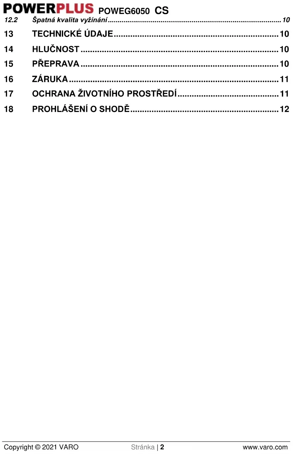 - Nesnažte se dosáhnout příliš daleko. Vždy si udržujte pevný postoj a rovnováhu. To vám umožní mít stroj pod lepší kontrolou v neočekávaných situacích.POWEG6050 CS Copyright © 2021 VARO Stránka | 5 www.varo.com