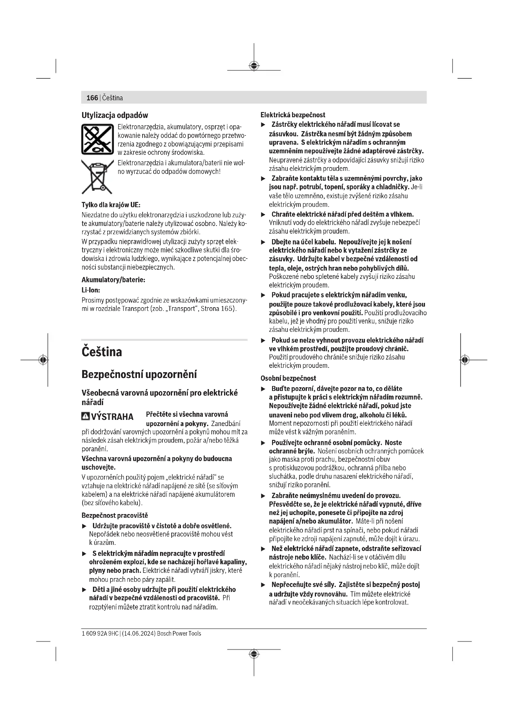 odpowiedniej dla danego zastosowania. Podłoże jest zbyt twarde W przypadku betonu z twardymi wtrąceniami należy spróbo- wać zmienić miejsce zamocowania. W przeciwnym razie należy użyć alternatywnych metod zamo- cowań, np. kołków. Gwóźdź nie trzyma się w stali. Podłoże stalowe jest zbyt cienkie Użyć alternatywnych metod zamocowań, np. śrub. Gwóźdź nie wychodzi z ele- mentu kontaktowego lub ele- ment kontaktowy pozostaje w pozycji wciśniętej. Blokada w elemencie kontak- towym (spowodowana np. przez ciało obce lub zanie- czyszczenia) Usunąć blokadę (zob. „Usuwanie blokad/resetowanie“, Stro- na163). Zbyt duży odsetek błędów Podłoże jest zbyt twarde Użyć alternatywnych metod zamocowań, np. kołków. Stempel udarowy jest zużyty Należy zlecić naprawę elektronarzędzia w autoryzowanym ser- wisie elektronarzędzi Bosch. Gwoździe nie przesuwają się w magazynku. Magazynek jest zanieczysz- czony Należy oczyścić magazynek(12), np. za pomocą pędzelka. Obsługa klienta oraz doradztwo dotyczące użytkowania Ze wszystkimi pytaniami, dotyczącymi naprawy ikonserwa- cji nabytego produktu oraz dostępu do części zamiennych, prosimy zwracać się do punktów obsługi klienta. Rysunki techniczne oraz informacje o częściach zamiennych można znaleźć pod adresem: www.bosch-pt.com Nasz zespół doradztwa dotyczącego użytkowania odpowie na wszystkie pytania związane z produktami firmy Bosch oraz ich osprzętem. Przy wszystkich zgłoszeniach oraz zamówieniach części za- miennych konieczne jest podanie 10‑cyfrowego numeru ka- talogowego, znajdującego się na tabliczce znamionowej pro- duktu. Polska Robert Bosch Sp. z o.o. Serwis Elektronarzędzi Ul. Jutrzenki 102/104 02-230 Warszawa Na www.serwisbosch.com znajdą Państwo wszystkie szcze- góły dotyczące usług serwisowych online. Tel.: 22 7154450 Faks: 22 7154440 E-Mail: bsc@pl.bosch.com www.bosch-pt.pl Pozostałe adresy serwisów znajdują się na stronie: www.bosch-pt.com/serviceaddresses Transport Zalecane akumulatory litowo-jonowe podlegają wymaganiom przepisów dotyczących towarów niebezpiecznych. Akumula- tory mogą być transportowane drogą lądową przez użytkow- nika, bez konieczności spełnienia jakichkolwiek dalszych wa- runków. W przypadku przesyłki przez osoby trzecie (np. transport drogą powietrzną lub za pośrednictwem firmy spedycyjnej) należy dostosować się do szczególnych wymogów dotyczą- cych opakowania i oznakowania towaru. W takim wypadku podczas przygotowywania towaru do wysyłki należy skonsul- tować się z ekspertem ds. towarów niebezpiecznych. Akumulatory można wysyłać tylko wówczas, gdy ich obudo- wa nie jest uszkodzona. Odsłonięte styki należy zakleić, a akumulator zapakować wtaki sposób, aby nie mógł on się poruszać (przesuwać) w opakowaniu. Należy wziąć też pod uwagę ewentualne inne przepisy prawa krajowego. Bosch Power Tools 1 609 92A 9HC | (14.06.2024)166 | Čeština Utylizacja odpadów Elektronarzędzia, akumulatory, osprzęt i opa- kowanie należy oddać do powtórnego przetwo- rzenia zgodnego z obowiązującymi przepisami w zakresie ochrony środowiska. Elektronarzędzia i akumulatora/baterii nie wol- no wyrzucać do odpadów domowych! Tylko dla krajów UE: Niezdatne do użytku elektronarzędzia i uszkodzone lub zuży- te akumulatory/baterie należy utylizować osobno. Należy ko- rzystać z przewidzianych systemów zbiórki. W przypadku nieprawidłowej utylizacji zużyty sprzęt elek- tryczny i elektroniczny może mieć szkodliwe skutki dla śro- dowiska i zdrowia ludzkiego, wynikające z potencjalnej obec- ności substancji niebezpiecznych. Akumulatory/baterie: Li-Ion: Prosimy postępować zgodnie ze wskazówkami umieszczony- mi w rozdziale Transport (zob. „Transport“, Strona165). Čeština Bezpečnostní upozornění Všeobecná varovná upozornění pro elektrické nářadí VÝSTRAHA Přečtěte si všechna varovná upozornění apokyny. Zanedbání při dodržování varovných upozornění apokynů mohou mít za následek zásah elektrickým proudem, požár a/nebo těžká poranění. Všechna varovná upozornění apokyny do budoucna uschovejte. Vupozorněních použitý pojem „elektrické nářadí“ se vztahuje na elektrické nářadí napájené ze sítě (se síťovým kabelem) ana elektrické nářadí napájené akumulátorem (bez síťového kabelu). Bezpečnost pracoviště u Udržujte pracoviště včistotě adobře osvětlené. Nepořádek nebo neosvětlené pracoviště mohou vést kúrazům. u Selektrickým nářadím nepracujte vprostředí ohroženém explozí, kde se nacházejí hořlavé kapaliny, plyny nebo prach. Elektrické nářadí vytváří jiskry, které mohou prach nebo páry zapálit. u Děti ajiné osoby udržujte při použití elektrického nářadí vbezpečné vzdálenosti od pracoviště. Při rozptýlení můžete ztratit kontrolu nad nářadím. Elektrická bezpečnost u Zástrčky elektrického nářadí musí lícovat se zásuvkou. Zástrčka nesmí být žádným způsobem upravena. Selektrickým nářadím sochranným uzemněním nepoužívejte žádné adaptérové zástrčky. Neupravené zástrčky aodpovídající zásuvky snižují riziko zásahu elektrickým proudem. u Zabraňte kontaktu těla suzemněnými povrchy, jako jsou např. potrubí, topení, sporáky achladničky. Je‑li vaše tělo uzemněno, existuje zvýšené riziko zásahu elektrickým proudem. u Chraňte elektrické nářadí před deštěm avlhkem. Vniknutí vody do elektrického nářadí zvyšuje nebezpečí zásahu elektrickým proudem. u Dbejte na účel kabelu. Nepoužívejte jej knošení elektrického nářadí nebo kvytažení zástrčky ze zásuvky. Udržujte kabel vbezpečné vzdálenosti od tepla, oleje, ostrých hran nebo pohyblivých dílů. Poškozené nebo spletené kabely zvyšují riziko zásahu elektrickým proudem. u Pokud pracujete selektrickým nářadím venku, použijte 