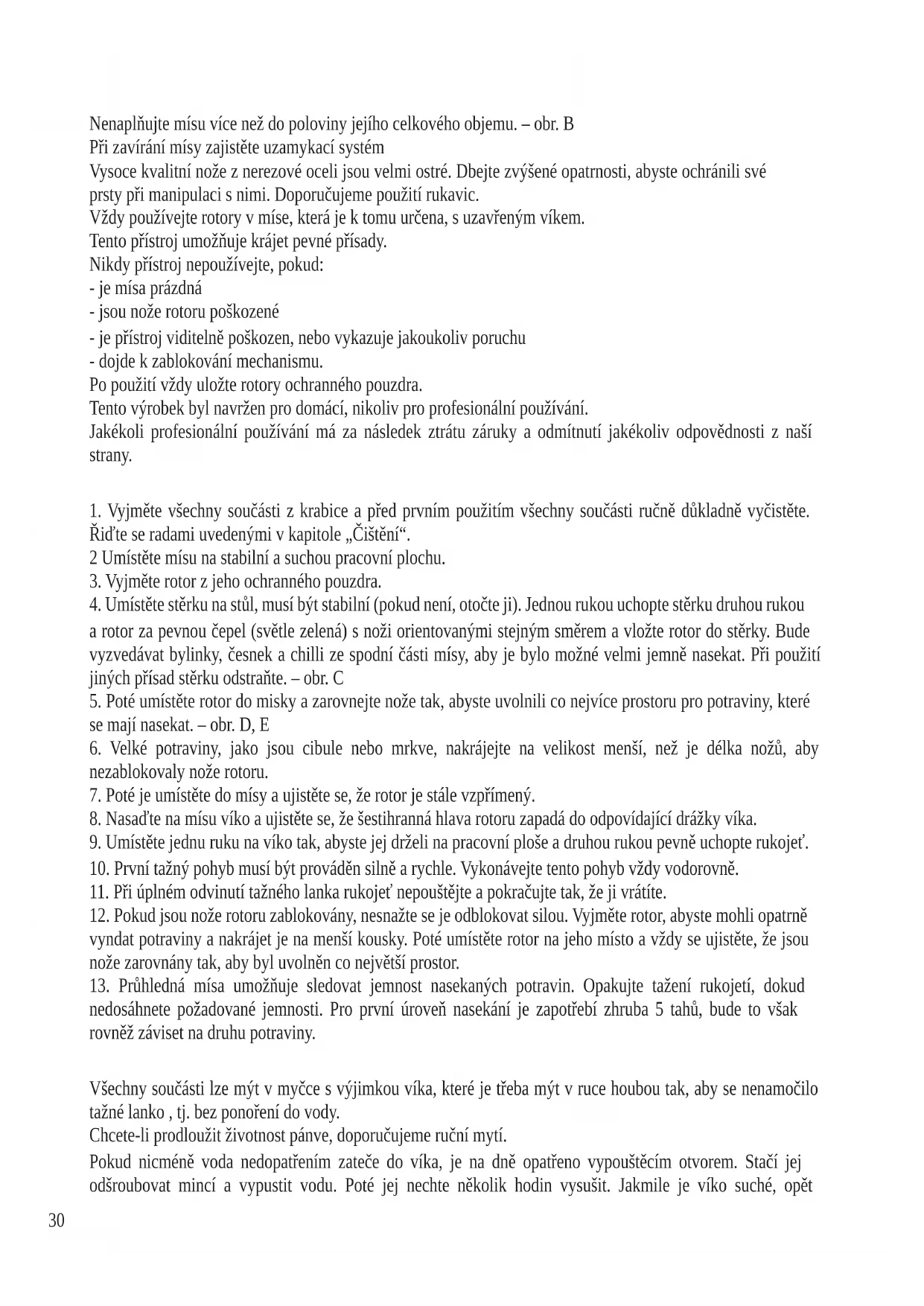 Děkujeme Vám za nákup mixéru Tefal® 5 Seconds. Součástí balení tohoto manuálního mixéru je: obr. A - 1 protiskluzová mísa o objemu 900 ml - 1 víko, jehož součástí je tažný mechanismus a uzamykací systém - 1 patentovaný rotor sestávající ze dvou nezávislých nožů z nerezové oceli - obr. W; pro krájení ovoce, zeleniny, ořechů a bylin (jablka, jahody, rajčata, okurky, ořechy, petržel,...). - 1 stěrka, která se připevňuje pod rotor pro nasekání bylin a provzdušnění receptu – obr. C. Opatření pro použití Pro zajištění nejlepšího výsledku naplňte mísu do poloviny předem nakrájenými kusy zbavenými slupky. Nepoužívejte na maso s kostmi, trvale byste poškodili nože. Bezpečnostní pokyny Tyto nože musejí být používány výlučně s MIXÉREM Tefal® 5 SECONDS 900 ml. Tento přístroj nesmí používat děti nebo osoby se zdravotním postižením v rozporu se zásadami bezpečného používání. Tento přístroj není hračka. Uchovávejte jej mimo dosah dětí. Tento přístroj používejte na stabilní a suché pracovní ploše. CST-13-17-000496D MANUAL_CHOPPER 900 Use&care.indd 29 27/01/2020 15:0430 Nenaplňujte mísu více než do poloviny jejího celkového objemu. – obr. B Při zavírání mísy zajistěte uzamykací systém Vysoce kvalitní nože z nerezové oceli jsou velmi ostré. Dbejte zvýšené opatrnosti, abyste ochránili své prsty při manipulaci s nimi. Doporučujeme použití rukavic. Vždy používejte rotory v míse, která je k tomu určena, s uzavřeným víkem. Tento přístroj umožňuje krájet pevné přísady. Nikdy přístroj nepoužívejte, pokud: - je mísa prázdná - jsou nože rotoru poškozené - je přístroj viditelně poškozen, nebo vykazuje jakoukoliv poruchu - dojde k zablokování mechanismu. Po použití vždy uložte rotory ochranného pouzdra. Tento výrobek byl navržen pro domácí, nikoliv pro profesionální používání. Jakékoli profesionální používání má za následek ztrátu záruky a odmítnutí jakékoliv odpovědnosti z naší strany. Použití
