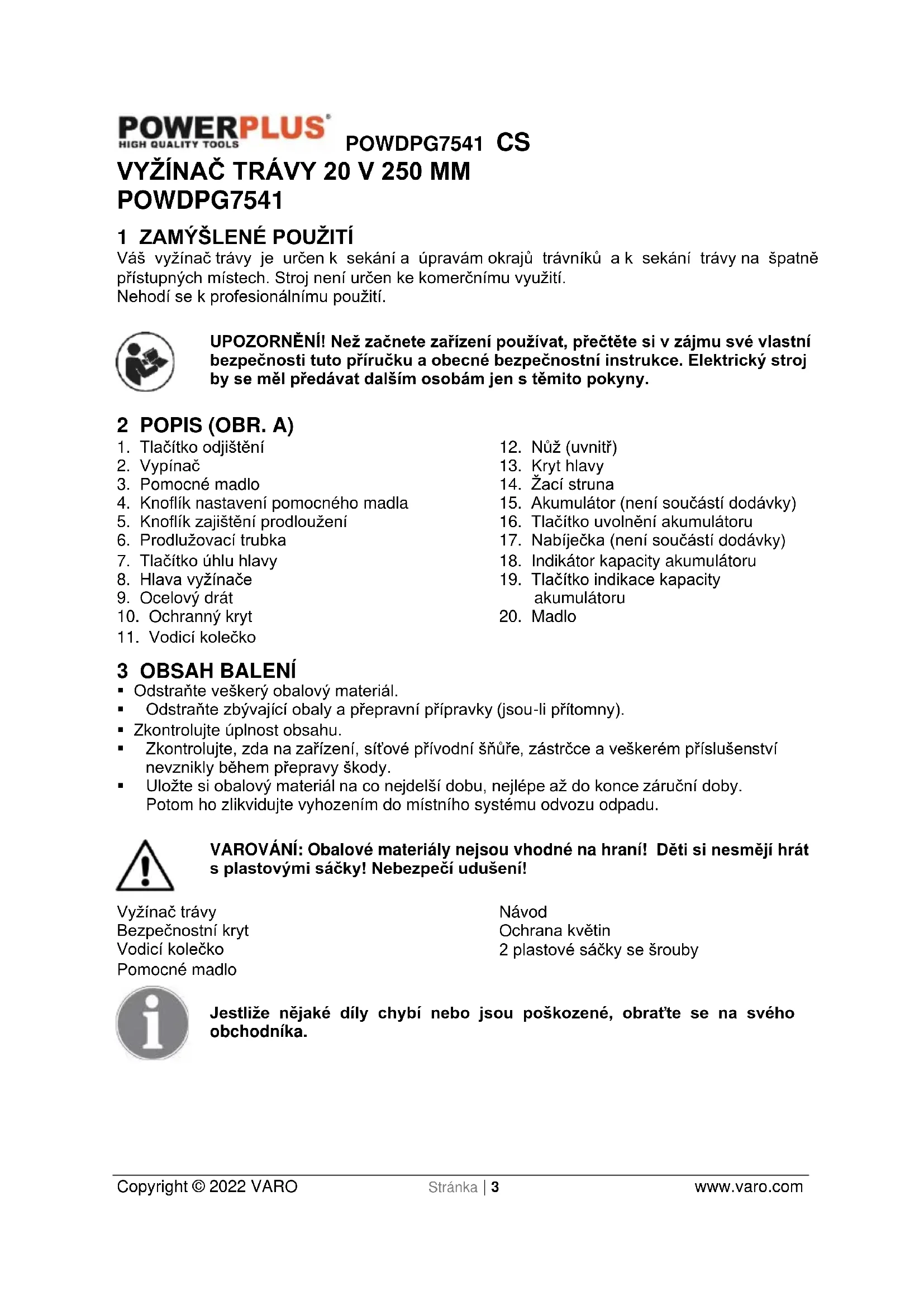 - Pokud akumulátory likvidujete, řiďte se instrukcemi v části „Ochrana životního prostředí“.POWDPG7541 CS Copyright © 2022 VARO Stránka | 7 www.varo.com