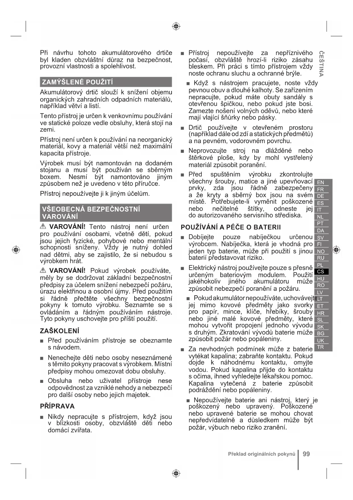 Tłumaczenie instrukcji oryginalnejPři návrhu tohoto akumulátorového drtiče byl kladen obzvláštní důraz na bezpečnost, provozní vlastnosti a spolehlivost.