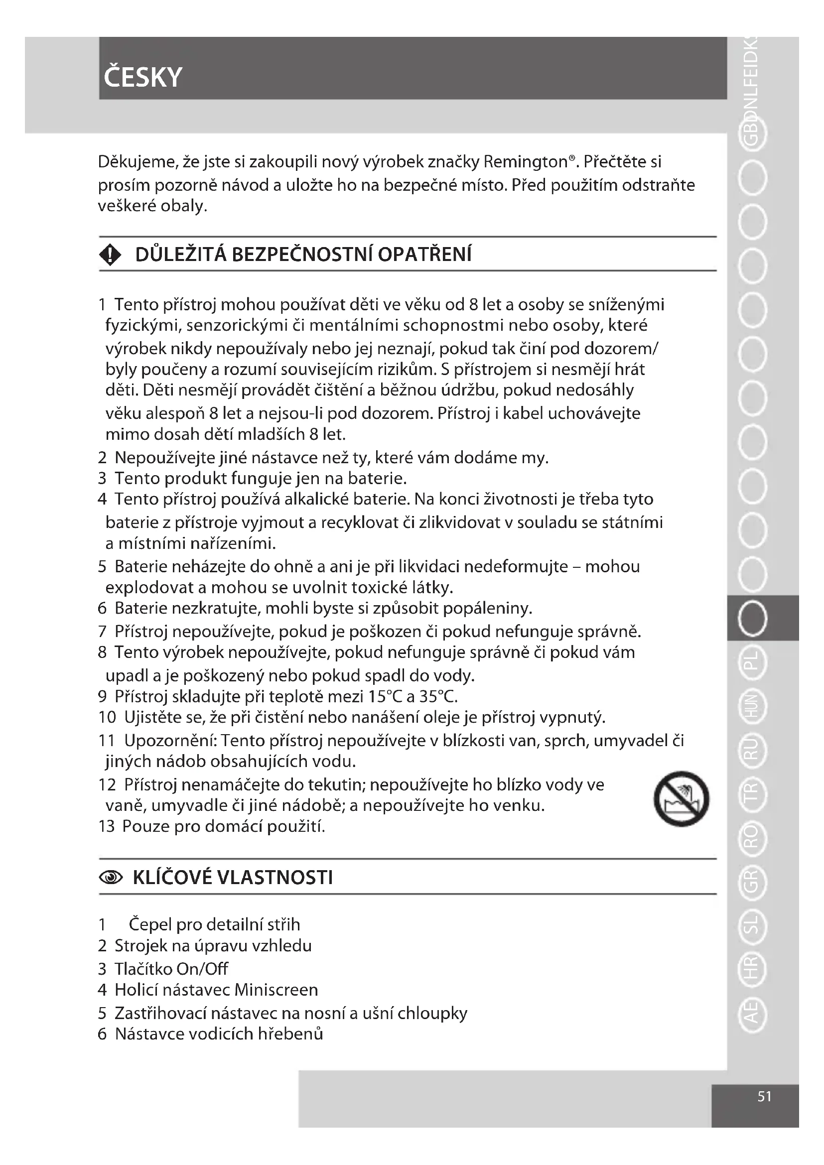 Aby nedochádzalo k ohrozeniu zdravia a životného prostredia vplyvom nebezpečných látok v elektrických a elektronických výrobkoch, nesmú byť spotrebiče označené týmto symbolom likvidované s netriedeným komunálnym odpadom. Je nutné ich triediť, znovu použiť alebo recyklovať. SLOVENČINA51 Děkujeme, že jste si zakoupili nový výrobek značky Remington®. Přečtěte si prosím pozorně návod a uložte ho na bezpečné místo. Před použitím odstraňte veškeré obaly. F DŮLEŽITÁ BEZPEČNOSTNÍ OPATŘENÍ 1 Tento přístroj mohou používat děti ve věku od 8 let a osoby se sníženými fyzickými, senzorickými či mentálními schopnostmi nebo osoby, které výrobek nikdy nepoužívaly nebo jej neznají, pokud tak činí pod dozorem/ byly poučeny a rozumí souvisejícím rizikům. S přístrojem si nesmějí hrát děti. Děti nesmějí provádět čištění a běžnou údržbu, pokud nedosáhly věku alespoň 8 let a nejsou-li pod dozorem. Přístroj i kabel uchovávejte mimo dosah dětí mladších 8 let. 2 Nepoužívejte jiné nástavce než ty, které vám dodáme my. 3 Tento produkt funguje jen na baterie. 4 Tento přístroj používá alkalické baterie. Na konci životnosti je třeba tyto baterie z přístroje vyjmout a recyklovat či zlikvidovat v souladu se státními a místními nařízeními. 5 Baterie neházejte do ohně a ani je při likvidaci nedeformujte – mohou explodovat a mohou se uvolnit toxické látky. 6 Baterie nezkratujte, mohli byste si způsobit popáleniny. 7 Přístroj nepoužívejte, pokud je poškozen či pokud nefunguje správně. 8 Tento výrobek nepoužívejte, pokud nefunguje správně či pokud vám upadl a je poškozený nebo pokud spadl do vody. 9 Přístroj skladujte při teplotě mezi 15°C a 35°C. 10 Ujistěte se, že při čistění nebo nanášení oleje je přístroj vypnutý. 11 Upozornění: Tento přístroj nepoužívejte v blízkosti van, sprch, umyvadel či jiných nádob obsahujících vodu. 12 Přístroj nenamáčejte do tekutin; nepoužívejte ho blízko vody ve vaně, umyvadle či jiné nádobě; a nepoužívejte ho venku. 13 Pouze pro domácí použití.