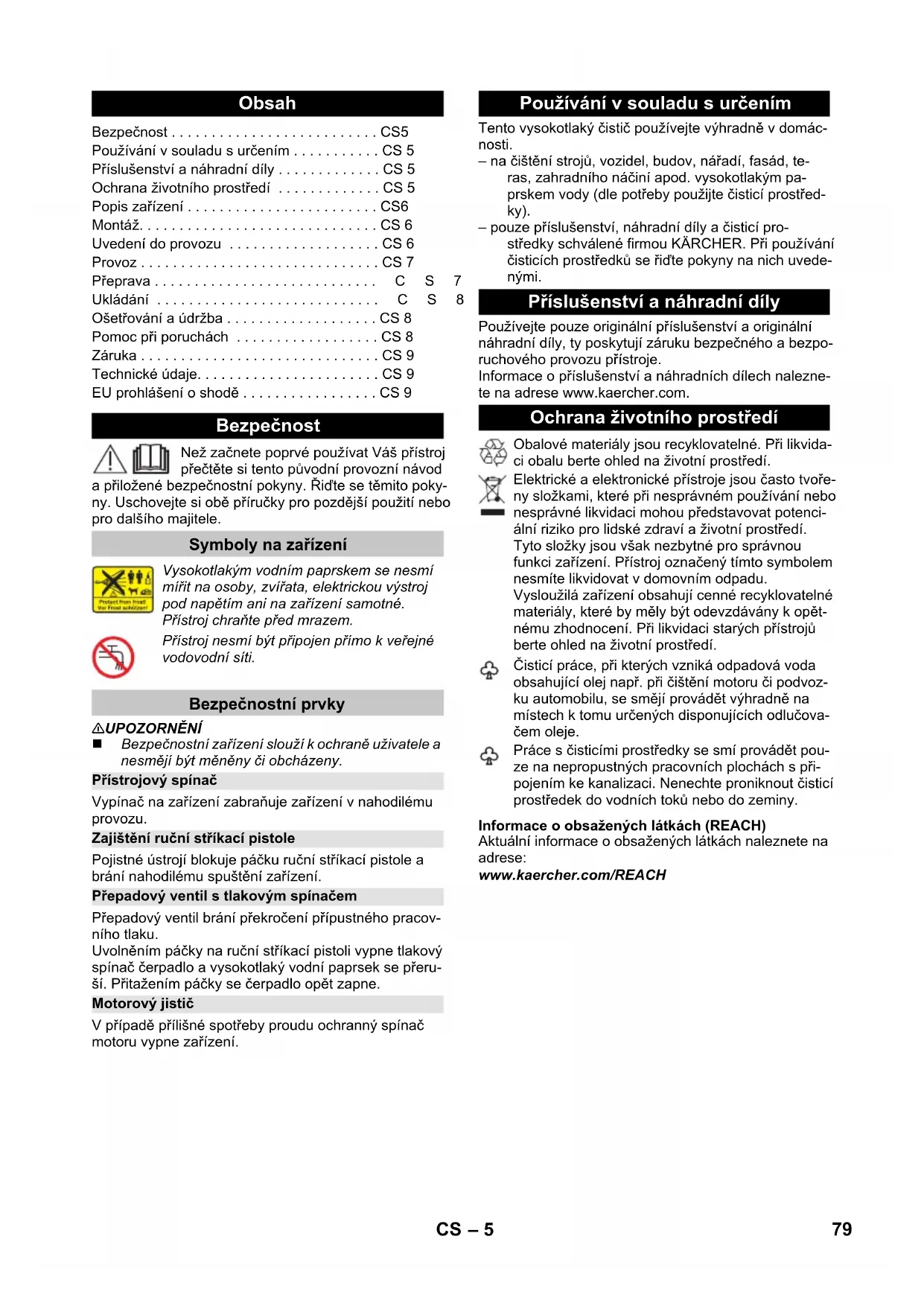 95 dB(A) A kivétel oka az (EU) 2019/1781 rendelet I. mellékleté- nek 2. szakaszának 12. pontja szerint: j) Műszaki változtatások joga fenntartva. EU konformitási nyilatkozat Termék: Nagynyomású tisztító Típus: 1.950-xxx Vonatkozó európai közösségi irányelvek: 2014/30/EU 2006/42/EK (+2009/127/EK) 2011/65/ЕU 2000/14/EK 2009/125/EG Alkalmazott rendszabályok (EU) 2019/1781 Alkalmazott harmonizált szabványok: EN 60335–1 EN 60335–2–79 EN 62233: 2008 EN 55014–1: 2017 EN 55014–2: 2015 EN 61000–3–2: 2014 EN 61000–3–3: 2013 EN IEC 63000: 2018 Követett megfelelés megállapítási eljárás: 2000/14/EK: V. függelék Hangteljesítményszint dB(A) Mért: 92 Garantált: 95 Winnenden, 2021/06/01 Chairman of the Board of Management Director Regulatory Affairs & Certification 78 HU– 5 Než začnete poprvé používat Váš přístroj přečtěte si tento původní provozní návod a přiložené bezpečnostní pokyny. Řiďte se těmito poky- ny. Uschovejte si obě příručky pro pozdější použití nebo pro dalšího majitele. 몇 UPOZORNĚNÍ Bezpečnostní zařízení slouží k ochraně uživatele a nesmějí být měněny či obcházeny. Vypínač na zařízení zabraňuje zařízení v nahodilému provozu. Pojistné ústrojí blokuje páčku ruční stříkací pistole a brání nahodilému spuštění zařízení. Přepadový ventil brání překročení přípustného pracov- ního tlaku. Uvolněním páčky na ruční stříkací pistoli vypne tlakový spínač čerpadlo a vysokotlaký vodní paprsek se přeru- ší. Přitažením páčky se čerpadlo opět zapne. V případě přílišné spotřeby proudu ochranný spínač motoru vypne zařízení. Tento vysokotlaký čistič používejte výhradně v domác- nosti. – na čištění strojů, vozidel, budov, nářadí, fasád, te- ras, zahradního náčiní apod. vysokotlakým pa- prskem vody (dle potřeby použijte čisticí prostřed- ky). – pouze příslušenství, náhradní díly a čisticí pro- středky schválené firmou KÄRCHER. Při používání čisticích prostředků se řiďte pokyny na nich uvede- nými. Používejte pouze originální příslušenství a originální náhradní díly, ty poskytují záruku bezpečného a bezpo- ruchového provozu přístroje. Informace o příslušenství a náhradních dílech nalezne- te na adrese www.kaercher.com. Informace o obsažených látkách (REACH) Aktuální informace o obsažených látkách naleznete na adrese: www.kaercher.com/REACH Obsah Bezpečnost . . . . . . . . . . . . . . . . . . . . . . . . . . CS5 Používání v souladu s určením . . . . . . . . . . . CS 5 Příslušenství a náhradní díly . . . . . . . . . . . . . CS 5 Ochrana životního prostředí . . . . . . . . . . . . . CS 5 Popis zařízení . . . . . . . . . . . . . . . . . . . . . . . . CS6 Montáž. . . . . . . . . . . . . . . . . . . . . . . . . . . . . . CS 6 Uvedení do provozu . . . . . . . . . . . . . . . . . . . CS 6 Provoz . . . . . . . . . . . . . . . . . . . . . . . . . . . . . . CS 7 Přeprava . . . . . . . . . . . . . . . . . . . . . . . . . . . .CS7 Ukládání . . . . . . . . . . . . . . . . . . . . . . . . . . . .CS8 Ošetřování a údržba . . . . . . . . . . . . . . . . . . . CS 8 Pomoc při poruchách . . . . . . . . . . . . . . . . . . CS 8 Záruka . . . . . . . . . . . . . . . . . . . . . . . . . . . . . . CS 9 Technické údaje. . . . . . . . . . . . . . . . . . . . . . . CS 9 EU prohlášení o shodě . . . . . . . . . . . . . . . . . CS 9 Bezpečnost Symboly na zařízení Vysokotlakým vodním paprskem se nesmí mířit na osoby, zvířata, elektrickou výstroj pod napětím ani na zařízení samotné. Přístroj chraňte před mrazem. Přístroj nesmí být připojen přímo k veřejné vodovodní síti. Bezpečnostní prvky Přístrojový spínač Zajištění ruční stříkací pistole Přepadový ventil s tlakovým spínačem Motorový jistič Používání v souladu s určením Příslušenství a náhradní díly Ochrana životního prostředí Obalové materiály jsou recyklovatelné. Při likvida- ci obalu berte ohled na životní prostředí. Elektrické a elektronické přístroje jsou často tvoře- ny složkami, které při nesprávném používání nebo nesprávné likvidaci mohou představovat potenci- ální riziko pro lidské zdraví a životní prostředí. Tyto složky jsou však nezbytné pro správnou funkci zařízení. Přístroj označený tímto symbolem nesmíte likvidovat v domovním odpadu. Vysloužilá zařízení obsahují cenné recyklovatelné materiály, které by měly být odevzdávány k opět- nému zhodnocení. Při likvidaci starých přístrojů berte ohled na životní prostředí. Čisticí práce, při kterých vzniká odpadová voda obsahující olej např. při čištění motoru či podvoz- ku automobilu, se smějí provádět výhradně na místech k tomu určených disponujících odlučova- čem oleje. Práce s čisticími prostředky se smí provádět pou- ze na nepropustných pracovních plochách s při- pojením ke kanalizaci. Nenechte proniknout čisticí prostředek do vodních toků nebo do zeminy. 79CS– 6 Objem dodávky přístroje (v závislosti na modelu) je vy- obrazen na obalu. Tento návod k použití popisuje veš- keré možné volitelné příslušenství. Ilustrace viz stránka 2 1 Vodní přípojka s integrovaným sítkem 2 Spojovací element pro přívod vody 3 Rychlopřípojka pro vysokotlakou hadici 4 Přípojka vysokého tlaku 5 Vypínač na přístroji "0/OFF" / "I/ON" 6 Zásobník na čisticí prostředek 7 Uložení pro ruční stříkací pistoli 8 Sací hadice na čisticí prostředek 9 Přepravní držadlo 10 Uložení pro stříkací trubku 11 Síťové napájecí vedení se zástrčkou 12 Přepravní kolo 13 Ruční stříkací pistole 14 Zajištění ruční stříkací pistole 15 Tlačítko k oddělení vysokotlaké hadice od ruční stříkac
