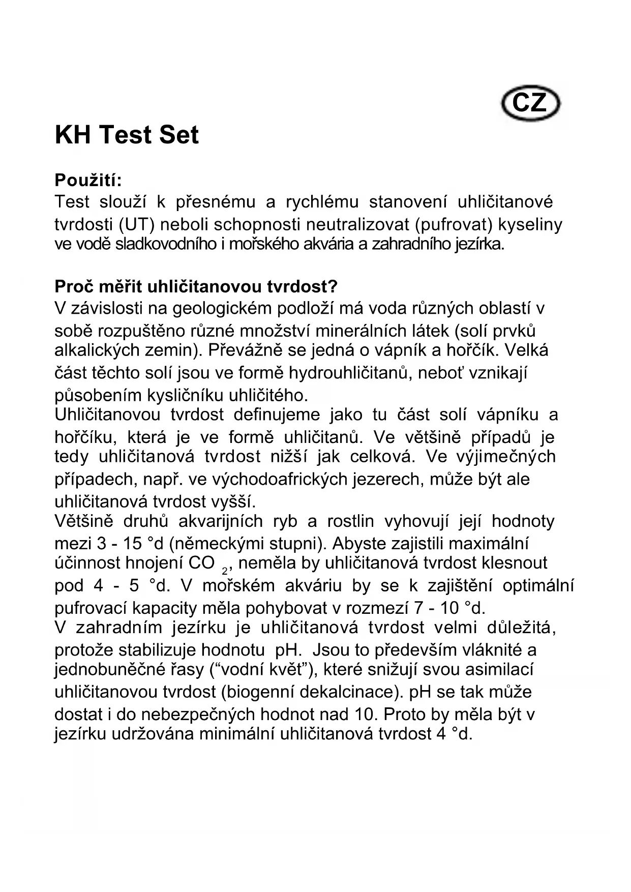 (även håret): Ta omedelbart av alla nedstänkta kläder. Skölj huden med vatten/duscha. P305 + P351 + P338 VID KONTAKT MED ÖGONEN: Skölj försiktigt med vatten i era minuter. Ta ur eventuella kontaktlinser om det går lätt. Fortsätt att skölja. P405 Förvaras inlåst.SE Karbonathårdhet Syrabindande förmåga mmol/l Tysk hårdhetsgrad °dKH Fransk hårdhetsgrad °fKH Vätekarbonat mg/l Syrabindande förmåga mmol/l – 2,78 4,94 61,0 Tysk hårdhetsgrad °dKH 0,36 – 1,78 21,8 Fransk hårdhetsgrad °fKH 0,20 0,56 – 12,3 Vätekarbonat mg/l 0,016 0,046 0,08 –CZ KH Test Set Použití: Test slouží k přesnému a rychlému stanovení uhličitanové tvrdosti (UT) neboli schopnosti neutralizovat (pufrovat) kyseliny ve vodě sladkovodního i mořského akvária a zahradního jezírka. Proč měřit uhličitanovou tvrdost? V závislosti na geologickém podloží má voda různých oblastí v sobě rozpuštěno různé množství minerálních látek (solí prvků alkalických zemin). Převážně se jedná o vápník a hořčík. Velká část těchto solí jsou ve formě hydrouhličitanů, neboť vznikají působením kysličníku uhličitého. Uhličitanovou tvrdost denujeme jako tu část solí vápníku a hořčíku, která je ve formě uhličitanů. Ve většině případů je tedy uhličitanová tvrdost nižší jak celková. Ve výjimečných případech, např. ve východoafrických jezerech, může být ale uhličitanová tvrdost vyšší. Většině druhů akvarijních ryb a rostlin vyhovují její hodnoty mezi 3 - 15 °d (německými stupni). Abyste zajistili maximální účinnost hnojení CO