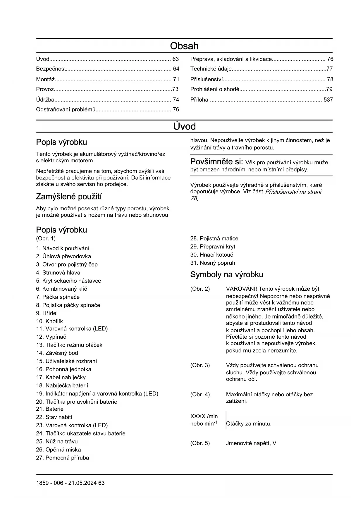 - Příloha Úvod Popis výrobku Tento výrobek je akumulátorový vyžínač/křovinořez selektrickým motorem. Nepřetržitě pracujeme na tom, abychom zvýšili vaši bezpečnost a efektivitu při používání. Další informace získáte usvého servisního prodejce. Zamýšlené použití Aby bylo možné posekat různé typy porostu, výrobek je možné používat snožem na trávu nebo strunovou hlavou. Nepoužívejte výrobek kjiným činnostem, než je vyžínání trávy atravního porostu. Povšimněte si: Věk pro používání výrobku může být omezen národními nebo místními předpisy. Výrobek používejte výhradně spříslušenstvím, které doporučuje výrobce. Viz část Příslušenství na strani p. 537