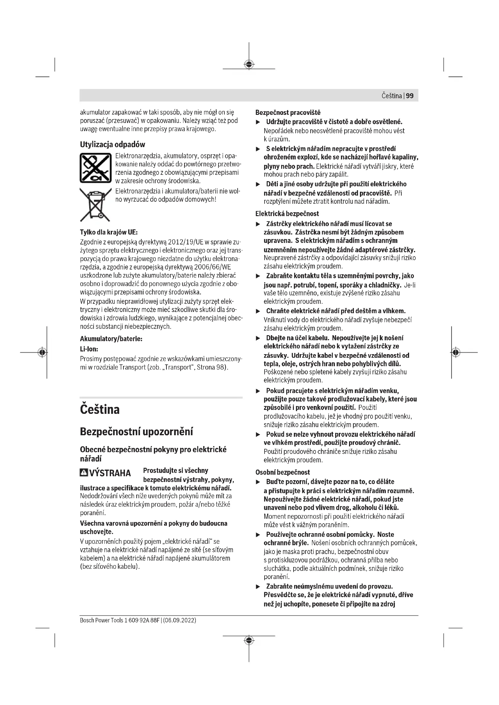 1,5 Úroveň vibrací aúroveň hluku, které jsou uvedené vtěchto pokynech, byly změřeny pomocí normované měřicí metody alze je použít pro vzájemné porovnání elektronářadí. Hodí se ipro předběžný odhad zatížení vibracemi ahlukem. Uvedená úroveň vibrací aúroveň hluku reprezentuje hlavní použití elektronářadí. Pokud se ovšem bude elektronářadí používat pro jiné práce, sjinými nástroji nebo snedostatečnou údržbou, může se úroveň hluku aúroveň vibrací lišit. To může zatížení vibracemi ahlukem po celou pracovní dobu zřetelně zvýšit. Pro přesný odhad zatížení vibracemi ahlukem by měly být zohledněny idoby, kdy je nářadí vypnuté nebo běží, ale ve skutečnosti se nepoužívá. To může zatížení vibracemi ahlukem po celou pracovní dobu výrazně snížit. Stanovte dodatečná bezpečnostní opatření kochraně obsluhy před účinky vibrací, jako je např. údržba elektronářadí anástrojů, udržování teplých rukou, organizace pracovních procesů. Akumulátor Bosch prodává akumulátorové elektrické nářadí ibez akumulátoru. Na obale je uvedené, zda je součástí dodávky elektrického nářadí akumulátor. Nabíjení akumulátoru u Používejte pouze nabíječky uvedené vtechnických údajích. Jen tyto nabíječky jsou přizpůsobené pro lithium-iontový akumulátor používaný svaším elektronářadím. Upozornění: Lithium-iontové akumulátory se na základě mezinárodních dopravních předpisů dodávají částečně nabité. Aby byl zaručen plný výkon akumulátoru, před prvním použitím akumulátor úplně nabijte. Nasazení akumulátoru Vložte nabitý akumulátor do uchycení akumulátoru tak, aby citelně zaskočil. Vyjmutí akumulátoru Pro vyjmutí akumulátoru stiskněte odjišťovací tlačítko avytáhněte akumulátor. Nepoužívejte přitom násilí. Ukazatel stavu nabití akumulátoru Ukazatel stavu nabití akumulátoru signalizuje při zapnutém elektrickém nářadí několik sekund zbývající kapacitu akumulátoru, resp. přetížení. Ukazatel stavu nabití akumulátoru signalizuje při zapnutém elektrickém nářadí zbývající kapacitu akumulátoru nebo přetížení. LED Kapacita Trvale svítí 3zelené 75–100% Trvale svítí 2zelené 40–75% Trvale svítí 1zelená 15–40% Pomalu bliká 1zelená 0–15% Tři LED ukazatele stavu nabití rychle blikají, když je teplota akumulátoru mimo rozsah provozní teploty a/nebo zareagovala ochrana proti přetížení. Upozornění pro optimální zacházení s akumulátorem Akumulátor chraňte před vlhkostí a vodou. Akumulátor skladujte pouze v teplotním rozmezí od −20 °C do 50 °C. Nenechávejte akumulátor ležet např. v létě v autě. Výrazně kratší doba chodu po nabití ukazuje, že je akumulátor opotřebovaný a musí se vyměnit. Dodržujte pokyny pro likvidaci. Montáž u Před každou prací na elektronářadí (např. údržba, výměna nástrojů) apři jeho přepravě auskladnění vyjměte akumulátor. Při neúmyslném stisknutí vypínače hrozí nebezpečí poranění. Odsávání prachu/třísek Prach zmateriálů, jako jsou nátěry sobsahem olova, některé druhy dřeva, minerály akov, může být zdraví škodlivý. Kontakt sprachem nebo vdechnutí mohou upracovníka nebo osob nacházejících se vblízkosti vyvolat alergické reakce a/nebo onemocnění dýchacích cest. Určitý prach, jako dubový nebo bukový prach, je pokládán za karcinogenní, zvláště ve spojení spřídavnými látkami pro ošetření dřeva (chromát, ochranné prostředky na dřevo). Materiál obsahující azbest smějí opracovávat pouze specialisté. – Pokud možno používejte pro daný materiál vhodné odsávání prachu. – Zajistěte dobré větrání pracoviště. – Je doporučeno nosit ochrannou dýchací masku střídou filtruP2. Dodržujte předpisy pro obráběné materiály platné vpříslušné zemi. 1 609 92A 88F | (06.09.2022) Bosch Power ToolsČeština | 103 u Zabraňte hromadění prachu na pracovišti. Prach se může lehce vznítit. Interní odsávání s boxem na prach (viz obrázky A1–A4) Box na prach (7) nasaďte na výfukové hrdlo (14). Naplnění boxu na prach (7) lze snadno kontrolovat díky průhledné nádobě. Pro vyprázdnění boxu na prach (7) ho mírně otáčivým pohybem vytáhněte směrem dozadu. Odšroubujte filtrační vložku (6) z boxu na prach (7). Vyprázdněte prachový box. Filtrační vložkou (6) lehce poklepejte o pevný podklad, aby se uvolnil prach. Vyčistěte lamely filtrační vložky (6) měkkým kartáčem. Upozornění: Aby bylo zabezpečeno optimální odsávání prachu, box na prach (7) včas vyprázdněte a pravidelně čistěte filtrační vložku (6). Při práci na svislých plochách držte elektronářadí tak, aby box na prach (7) směřoval dolů. Externí odsávání (vizobrázekB) Nasaďte odsávací adaptér(16) (příslušenství) na odsávací hadici(15) (příslušenství) tak, aby slyšitelně zaskočil. Spojte odsávací adaptér(16) sodsávacím hrdlem(14) na elektrickém nářadí aodsávací hadici(15) svysavačem (příslušenství). Přehled připojení krůzným vysavačům najdete na konci tohoto návodu. Vysavač musí být vhodný pro broušený materiál. Při odsávání obzvlášť zdraví škodlivého, karcinogenního nebo suchého prachu použijte speciální vysavač. Výměna brusného papíru (viz obrázekC) Před nasazením nového brusného papíru odstraňte zbrusné desky nečistoty aprach, např. štětcem. Pro zabezpečení optimálního odsávání prachu dbejte na to, aby se otvory vbrusném papíru kryly sotvory vbrusné desce. Brusná deska je opatřená suchým zipem pro rychlé ajednoduché upevňování brusného papíru. Aby bylo dosaženo optimální přilnavosti, vyklepejte suchý zip brusné desky před nasazením brusného papíru. Nasaďte brusný papír(17) na jedné