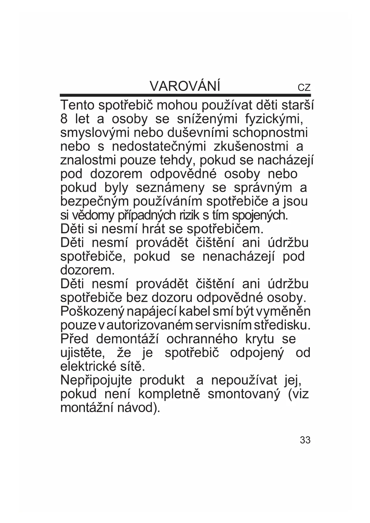 UPOZORNĚNÍ: Pečlivě si přečtěte tento návod k obsluze, který obsahuje důležité pokyny týkající se bezpečné instalace, použití a údržby spotřebiče. Uschovejte tento návod pro případné použití v budoucnu. Děti si nesmí hrát se spotřebičem. Tento spotřebič smí být používán pouze k účelům, ke kterým byl navržen; jakékoliv použití, které není v souladu s pokyny obsaženými v tomto návodu k obsluze, se považuje za nevhodné a nebezpečné. Výrobce nenese odpovědnost za možné škody způsobené nevhodným a/nebo nepřiměřeným použitím. Tento spotřebič NENÍ vhodný k použití v prostředí, kde hrozí nebezpečí výbuchu (tam, kde se vyskytují hořlavé látky, jako je plyn, pára, mlha nebo prach, za atmosférických podmínek, kdy se spaliny po zapálení šíří ve vzduchu). Obalové materiály (igelitové sáčky, polystyren atd.) musíte uchovávat mimo dosah dětí nebo zdravotně postižených osob, protože představují potenciální zdroj nebezpečí. Instalace/montáž spotřebiče musí být provedena podle pokynů výrobce. Špatný postup může způsobit poranění osob či zvířat nebo poškození předmětů, za které výrobce nenese žádnou odpovědnost. Umístěte spotřebič na horizontální a stabilní povrch. Před prvním použitím spotřebiče zkontrolujte, zda nedošlo k poškození napájecího kabelu nebo samotného spotřebiče během přepravy. Pokud si nejste jistí, obraťte se na kvalikovanou osobu. Před prvním připojením spotřebiče k elektrické síti se ujistěte, že jmenovitý výkon (napětí a frekvence) spotřebiče odpovídá Vaší elektrické síti a že zásuvka je vhodná pro zástrčku spotřebiče. Ujistěte se, že napájecí systém je vybaven vhodnou ochranou podle platných zákonů. NEPŘIPOJUJTE spotřebič k vícenásobné zásuvce. Pokud je to možné, vyvarujte se použití adaptérů a/nebo prodlužovacích kabelů; pokud je jejich použití naprosto nezbytné, používejte pouze materiály, které odpovídají současným bezpečnostním předpisům a vyhovují elektrickým parametrům spotřebiče. Nepoužívejte spotřebič spolu s externím časovačem a/nebo jiným zařízením dálkového ovládání, které není doporučeno v tomto návodu k použití. NEPOUŽÍVEJTE spotřebič ani ho neskladujte v blízkosti tepelných zdrojů (ohřívačů, kamen atd.). NIKDY neponořujte spotřebič do vody nebo jiných kapalin; pokud dojde k náhodnému pádu do vody, NEPOKOUŠEJTE se spotřebič vytáhnout z vody, nýbrž nejprve vytáhněte síťovou zástrčku ze zásuvky.35 Před prvním použitím spotřebiče nezapomeňte odstranit veškeré štítky nebo ochranné fólie, které brání ve správném fungování spotřebiče. Zapojujte a odpojujte napájecí kabel suchýma rukama a držte ho přitom pevně. Před připojením spotřebiče k elektrické síti se ujistěte, že se tlačítko startu spotřebiče nachází v poloze “OFF” (vypnuto). Vždy odpojte napájecí kabel, abyste zabránili přehřátí spotřebiče. Netahejte za napájecí kabel (netahejte za kabel, neodpojujte spotřebič od elektrické sítě ani ho nepřemísťujte tahem za kabel). Neveďte napájecí kabel po drsném nebo ostrém povrchu nebo místy, kde by mohlo dojít k jeho poškození. NEBLOKUJTE zcela ani zčásti ventilační otvory spotřebiče ani do nich nevkládejte žádné předměty. Během provozu se nedotýkejte spotřebiče mokrými částmi těla. V každém případě Vám doporučujeme mít mezi sebou a stojanem spotřebiče izolační prvek (např. nosit obuv s gumovou podrážkou). Během používání musíte udržovat spotřebič v bezpečné vzdálenosti od jakéhokoliv předmětu a/nebo hořlavých či potenciálně výbušných látek. V případě poruchy nebo neobvyklého chování během provozu okamžitě vypněte spotřebič, odpojte ho od elektrické sítě a zjistěte příčinu poruchy. Pokud je to možné, obraťte se na kvalikovanou osobu. Neprovádějte úkony, které nejsou uvedeny v tomto návodu k obsluze (například demontáž a/nebo úpravy spotřebiče). Pokud spotřebič nebudete delší dobu používat, chcete ho uložit, vyčistit nebo provést jakoukoliv údržbu, odpojte ho nejprve od elektrické sítě. Uchovávejte a používejte spotřebič pouze v interiéru nebo v prostoru chráněném před povětrnostními vlivy, jako je např. déšť, přímé sluneční záření nebo prach. Spotřebič není určen k použití nebo skladování v exteriéru. Děti NESMÍ provádět čištění ani údržbu spotřebiče bez dozoru dospělé osoby. Před vytažením zástrčky ze zásuvky nejprve vypněte spotřebič stiskem správného tlačítka na ovládacím panelu. NEZAVĚŠUJTE ventilátor na stěnu nebo strop, pokud tento typ instalace není uveden a popsán v tomto návodu k obsluze. Umístěte spotřebič ve správné vzdálenosti od předmětů nebo okolních stěn. Ujistěte se, že jeho provoz nepovede k náhodným škodám. NEPOUŽÍVEJTE spotřebič v blízkosti plynových sporáků nebo otevřeného ohně. NEPOUŽÍVEJTE spotřebič v blízkosti závěsů nebo textilií. NEZAVĚŠUJTE ventilátor na stěnu nebo strop, pokud tento typ instalace není uveden a popsán v tomto návodu k obsluze. NEZAKRÝVEJTE spotřebič během provozu. NEVKLÁDEJTE dovnitř ochranné mřížky ventilátoru žádné předměty ani36 části těla. NENECHÁVEJTE spotřebič během provozu delší dobu bez dozoru. NEVYSTAVUJTE SE delší dobu proudění vzduchu, které vzniká provozem ventilátoru, neboť by mohlo dojít k poškození zdraví. Pokud ventilátor delší dobu nebudete používat nebo ho nepoužíváte pravidelně, umístěte ho do původního obalu a skladujte ho na suchém místě. Před prvním použitím ventilátoru po dlouhé době nečinnosti se ujistěte, že je ventilátor čistý a jeho lopatky se volně otáčejí (při 