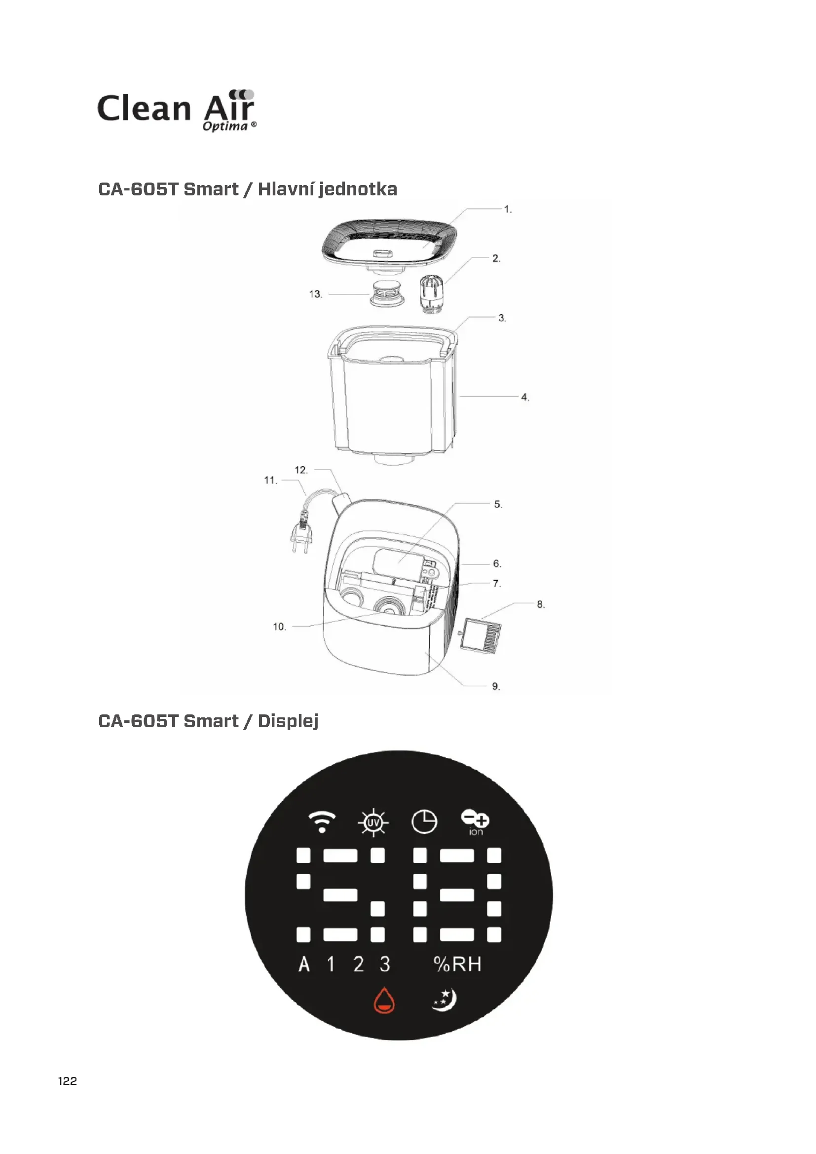 CA-605T Smart / Displej123 Čeština Děkujeme Vám, že jste zakoupili ultrazvukový zvlhčovač vzduchu Clean Air Optima® CA-605T Smart. Přejeme Vám, aby Vám tento účinný a efektivní výrobek po mnoho let sloužil jako zdroj zdravého vzduchu uvnitř budov. Tento návod popisuje bezpečnostní opatření, která je třeba při provozu tohoto zařízení dodržovat. Jejich cílem je prevence úrazů a poškození zařízení. Popis zařízení Zařízení sestává z následujících hlavních součástí: