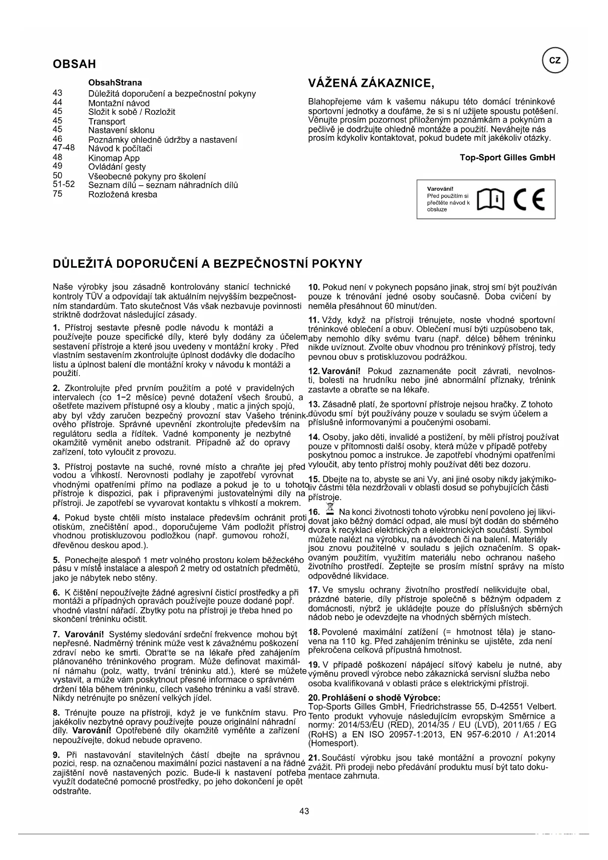 OBSAH VÁŽENÁ ZÁKAZNICE, Blahopřejeme vám k vašemu nákupu této domácí tréninkové sportovní jednotky a doufáme, že si s ní užijete spoustu potěšení. Věnujte prosím pozornost přiloženým poznámkám a pokynům a pečlivě je dodržujte ohledně montáže a použití. Neváhejte nás prosím kdykoliv kontaktovat, pokud budete mít jakékoliv otázky. Top-Sport Gilles GmbH ObsahStrana Varování! Před použitím si přečtěte návod k obsluze DŮLEŽITÁ DOPORUČENÍ A BEZPEČNOSTNÍ POKYNY Naše výrobky jsou zásadně kontrolovány stanicí technické kontroly TÜV a odpovídají tak aktuálním nejvyšším bezpečnost- ním standardům. Tato skutečnost Vás však nezbavuje povinnosti striktně dodržovat následující zásady.