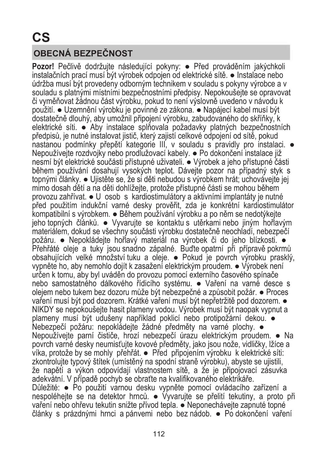 Pozor! Pečlivě dodržujte následující pokyny: ● Před prováděním jakýchkoli instalačních prací musí být výrobek odpojen od elektrické sítě. ● Instalace nebo údržba musí být provedeny odborným technikem v souladu s pokyny výrobce a v souladu s platnými místními bezpečnostními předpisy. Nepokoušejte se opravovat či vyměňovat žádnou část výrobku, pokud to není výslovně uvedeno v návodu k použití. ● Uzemnění výrobku je povinné ze zákona. ● Napájecí kabel musí být dostatečně dlouhý, aby umožnil připojení výrobku, zabudovaného do skříňky, k elektrické síti. ● Aby instalace splňovala požadavky platných bezpečnostních předpisů, je nutné instalovat jistič, který zajistí celkové odpojení od sítě, pokud nastanou podmínky přepětí kategorie III, v souladu s pravidly pro instalaci. ● Nepoužívejte rozdvojky nebo prodlužovací kabely. ● Po dokončení instalace již nesmí být elektrické součásti přístupné uživateli. ● Výrobek a jeho přístupné části během používání dosahují vysokých teplot. Dávejte pozor na případný styk s topnými články. ● Ujistěte se, že si děti nebudou s výrobkem hrát; uchovávejte jej mimo dosah dětí a na děti dohlížejte, protože přístupné části se mohou během provozu zahřívat. ● U osob s kardiostimulátory a aktivními implantáty je nutné před použitím indukční varné desky prověřit, zda je konkrétní kardiostimulátor kompatibilní s výrobkem. ● Během používání výrobku a po něm se nedotýkejte jeho topných článků. ● Vyvarujte se kontaktu s utěrkami nebo jiným hořlavým materiálem, dokud se všechny součásti výrobku dostatečně neochladí, nebezpečí požáru. ● Nepokládejte hořlavý materiál na výrobek či do jeho blízkosti. ● Přehřáté oleje a tuky jsou snadno zápalné. Buďte opatrní při přípravě pokrmů obsahujících velké množství tuku a oleje. ● Pokud je povrch výrobku prasklý, vypněte ho, aby nemohlo dojít k zasažení elektrickým proudem. ● Výrobek není určen k tomu, aby byl uváděn do provozu pomocí externího časového spínače nebo samostatného dálkového řídicího systému. ● Vaření na varné desce s olejem nebo tukem bez dozoru může být nebezpečné a způsobit požár. ● Proces vaření musí být pod dozorem. Krátké vaření musí být nepřetržitě pod dozorem. ● NIKDY se nepokoušejte hasit plameny vodou. Výrobek musí být naopak vypnut a plameny musí být udušeny například poklicí nebo protipožární dekou. ● Nebezpečí požáru: nepokládejte žádné předměty na varné plochy. ● Nepoužívejte parní čističe, hrozí nebezpečí úrazu elektrickým proudem. ● Na povrch varné desky neumisťujte kovové předměty, jako jsou nože, vidličky, lžíce a víka, protože by se mohly přehřát. ● Před připojením výrobku k elektrické síti: zkontrolujte typový štítek (umístěný na spodní straně výrobku), abyste se ujistili, že napětí a výkon odpovídají vlastnostem sítě, a že je připojovací zásuvka adekvátní. V případě pochyb se obraťte na kvalifikovaného elektrikáře. Důležité: ● Po použití varnou desku vypněte pomocí ovládacího zařízení a nespoléhejte se na detektor hrnců. ● Vyvarujte se přelití tekutiny, a proto při vaření nebo ohřevu tekutin snižte přívod tepla. ● Neponechávejte zapnuté topné články s prázdnými hrnci a pánvemi nebo bez nádob. ● Po dokončení vaření 112vypněte příslušnou varnou zónu. ● Nikdy k vaření nepoužívejte alobal a nikdy přímo neumísťujte výrobky zabalené v hliníkové fólii. Alobal by se mohl roztavit a došlo by k vážnému poškození vašeho výrobku. ● Nikdy neohřívejte ještě zavřené potravinové konzervy či plechovky: mohly by vybouchnout! Tato upozornění jsou platná i pro všechny ostatní typy varných desek. ● Použití vysokého výkonu, jako při funkci Booster, není vhodné pro ohřev určitých typů tekutin, jako například oleje na smažení. Přílišná teplota by mohla být nebezpečná. V těchto případech doporučujeme používat nižší výkon. ● Nádoby musí být umístěny přímo na varnou desku a musí být vystředěny. V žádném případě nevkládejte mezi hrnce a varnou desku jiné předměty. ● V případě vysokých teplot výrobek automaticky snižuje stupeň výkonu varných zón. ● Před jakýmkoliv úkonem čištění nebo údržby odpojte výrobek od elektrické sítě vytažením zástrčky nebo vypnutím hlavního vypínače bytu/domu. ● Při všech instalacích a údržbě používejte pracovní rukavice. ● Výrobek mohou používat děti ve věku nejméně 8 let a osoby se sníženými fyzickými, smyslovými nebo mentálními schopnostmi nebo bez zkušeností či potřebných znalostí, za předpokladu, že jsou pod dohledem nebo poté, co obdržely pokyny týkající se bezpečného používání výrobku a pochopily s tím související nebezpečí. ● Děti by měly být pod dohledem, aby si s výrobkem nehrály. ● Čištění a údržbu nesmí provádět děti bez dozoru. ● Pokud je výrobek používán současně s jinými spotřebiči na plyn nebo jiná paliva, místnost musí být dostatečně větraná. ● Výrobek musí být často čištěn zevnitř i zvenku (ALESPOŇ JEDNOU MĚSÍČNĚ), v každém případě dodržujte to, co je výslovně uvedeno v pokynech pro údržbu. ● Nedodržení postupů čištění výrobku a výměny a čištění filtrů vede k nebezpečí požáru. ● Vaření plamenem (flambování) je přísně zakázáno. ● Použití volných plamenů je nebezpečné pro filtry a mohlo by způsobit požár, a proto je třeba se ho v každém případě vyvarovat. ● Smažení se musí provádět pod kontrolou, aby se zabránilo vzplanutí přehřátého oleje. ● Pozor! Když
