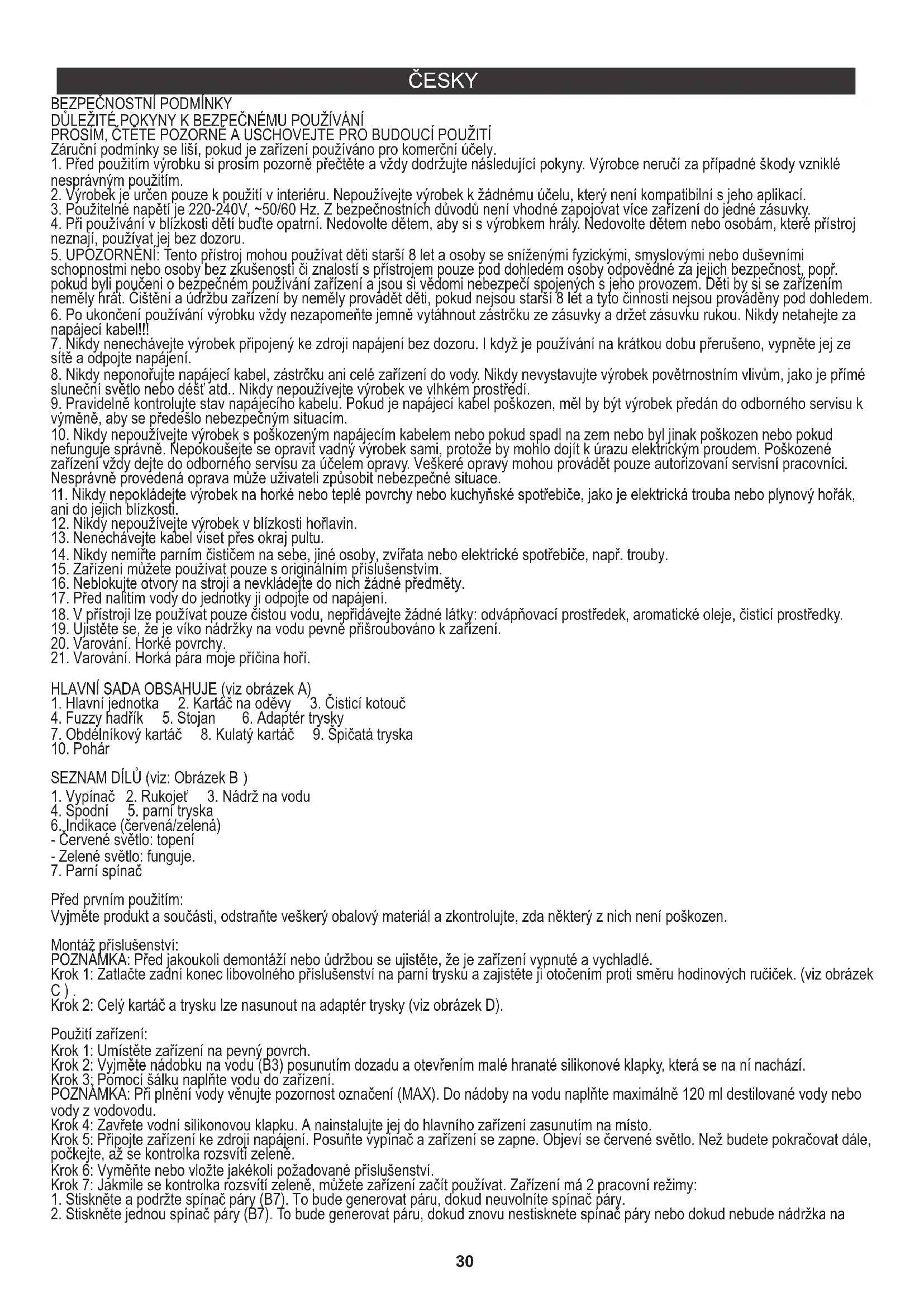 Před prvním použitím: Vyjměte produkt a součásti, odstraňte veškerý obalový materiál a zkontrolujte, zda některý z nich není poškozen. Montáž příslušenství: POZNÁMKA: Před jakoukoli demontáží nebo údržbou se ujistěte, že je zařízení vypnuté a vychladlé. Krok 1: Zatlačte zadní konec libovolného příslušenství na parní trysku a zajistěte ji otočením proti směru hodinových ručiček. (viz obrázek C ) . Krok 2: Celý kartáč a trysku lze nasunout na adaptér trysky (viz obrázek D). Použití zařízení: Krok 1: Umístěte zařízení na pevný povrch. Krok 2: Vyjměte nádobku na vodu (B3) posunutím dozadu a otevřením malé hranaté silikonové klapky, která se na ní nachází. Krok 3: Pomocí šálku naplňte vodu do zařízení. POZNÁMKA: Při plnění vody věnujte pozornost označení (MAX). Do nádoby na vodu naplňte maximálně 120 ml destilované vody nebo vody z vodovodu. Krok 4: Zavřete vodní silikonovou klapku. A nainstalujte jej do hlavního zařízení zasunutím na místo. Krok 5: Připojte zařízení ke zdroji napájení. Posuňte vypínač a zařízení se zapne. Objeví se červené světlo. Než budete pokračovat dále, počkejte, až se kontrolka rozsvítí zeleně. Krok 6: Vyměňte nebo vložte jakékoli požadované příslušenství. Krok 7: Jakmile se kontrolka rozsvítí zeleně, můžete zařízení začít používat. Zařízení má 2 pracovní režimy: