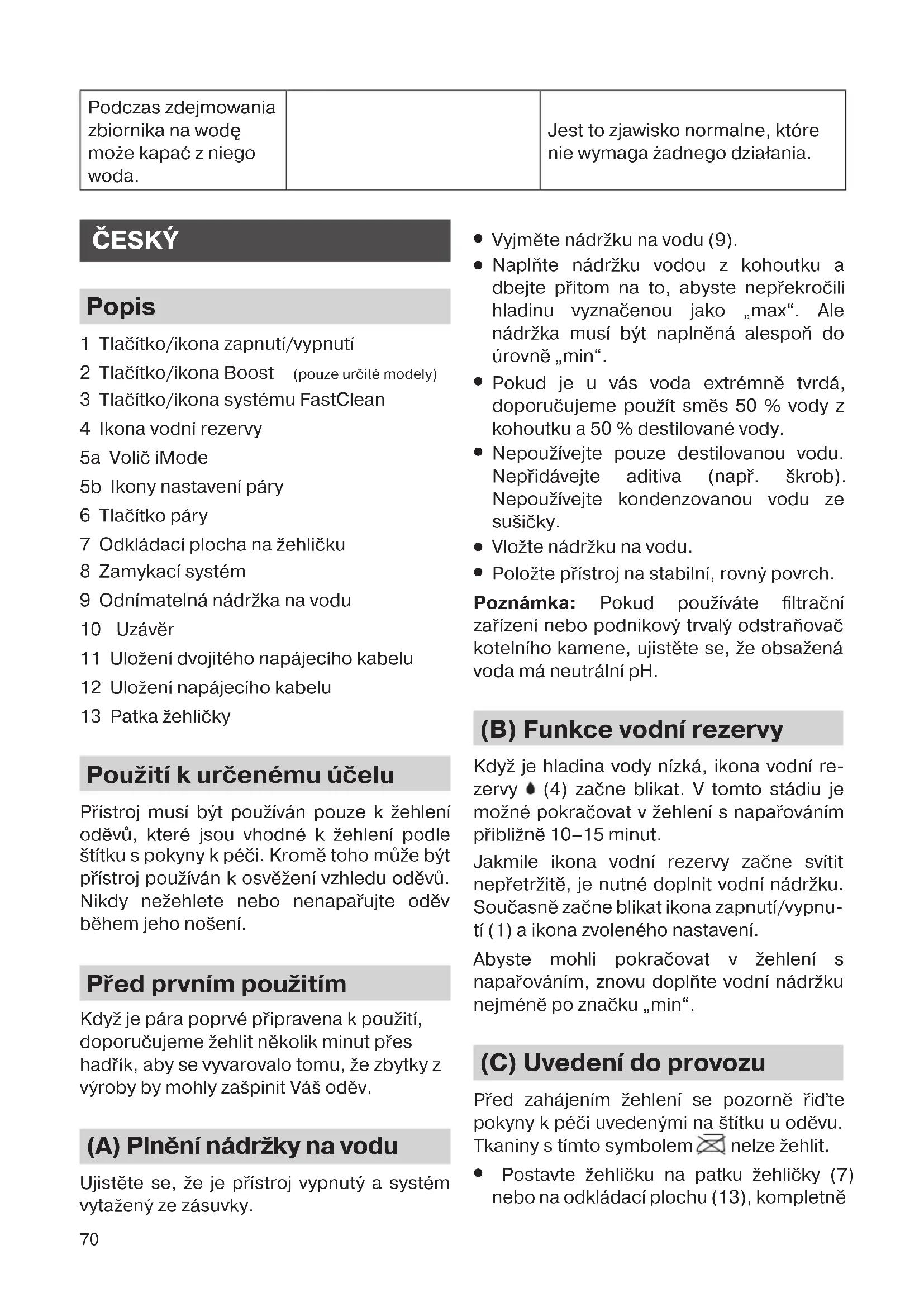 Pro odemknutí žehličky stiskněte tlačítko na posunovači (snadné zamčení). Žehlička se uvolní. Uskladnění Odpojte žehličku, vyprázdněte nádržku na vodu a nechte přístroj vychladnout, až pak smotejte kabely pro uložení. Pohodlné skladování napájecího kabelu naj- dete v části „Ergonomická certifikace“. Záruka a servis Podrobné informace najdete v samostat- ném záručním a servisním dokumentu, nebo navštivte www.braunhousehold.com. Průvodce odstraňováním poruch Problém Příčina Řešení Přístroj se nezapíná. Přístroj není zapojený do zásuvky. Ujistěte se, že je zapojený do zá- suvky, a stiskněte tlačítko zapnutí/ vypnutí. Zpod základní jednot- ky vychází pára. Otevřel se bezpečnostní systém „maximálního“ tlaku. Neprodleně zařízení vypněte a kontaktujte autorizovaný záka- znický servis Braun. Z děr na spodní straně žehlicí plochy vy- cházejí kapky vody. Voda v trubkách konden- zovala, protože se pára používá poprvé nebo protože se nějakou dobu nepoužívala. Mimo plochu žehlicího prkna několikrát stiskněte tlačítko páry. To odstraní chladnou vodu z okruhu páry. Z žehlicí plochy uniká hnědá tekutina. Do nádržky na vodu byly přidány chemické změkčovače vody nebo přísady. Nikdy nelijte žádné produkty do nádržky s vodou. Očistěte žehlicí plo- chu vlhkou tkaninou a vypláchněte ohřívač vody. Při prvním zapnutí přístroje si všimnete kouře nebo zápachu. Některé části byly ošetřeny impregnačním nátěrem/ mazivem, který se vypaří při prvním zahřátí žehličky. Jde o běžný jev a po několika použitích žehličky vymizí. Je-li kouř/ zápach po vypnutí přístroje stále přítomen, kontaktujte autorizovaný zákaznický servis Braun. Přístroj vydává přerušovaný zvuk spojený s vibracemi. Do ohřívače vody se pum- puje voda. To je normální a není potřebný žádný zásah. Uzávěr lze obtížně odšroubovat. Vápencový povlak znesnadňuje otevření uzávěru. Otočte víčkem silou. Abyste se problému vyhnuli, často systém odvápňujte. Ohřívač vody je stále pod tlakem. Nikdy neotevírejte uzávěr, když je ohřívač vody stále pod tlakem nebo je horký. Počkejte alespoň 2,5 hodiny, než otevřete uzávěr. 5712812451_IS72xx_INT.indd 735712812451_IS72xx_INT.indd 73 08.11.21 08:3008.11.21 08:3074 Ikona po doplnění nádržky na vodu nez- hasne. Vodní plovák nepracuje správně. Vyprázdněte nádržku na vodu, vypláchněte ji a znovu naplňte. Nádržka na vodu není správně umístěná. Umístěte nádržku na vodu správně. Všechny LED blikají. Systémová chyba. Odpojte přístroj ze zásuvky, znovu zapojte a stiskněte tlačítko zapnutí/vypnutí. Pokud problém přetrvává, neprodleně přístroj vypněte, odpojte jej ze zásuvky a kontaktujte autorizovaný zákaz- nický servis Braun. Ikona páry trvale svítí, z žehlicí plochy však nevystupuje žádná pára. Plovák nádržky na vodu je zamčený nebo nádržka na vodu není správně vložena. Vypněte a odpojte přístroj. Vyjměte a vyprázdněte nádržku na vodu, vypláchněte ji a znovu naplňte. Vložte nádržku na vodu. Počkejte, dokud přístroj nevych- ladne (minimálně 2,5 hodiny). Pak to zkuste znovu. Pokud problém přetrvává, kontaktujte autorizo- vaný zákaznický servis Braun. Pára nebo voda uniká ven z uzávěru. Uzávěr není řádně dotažen. Vypněte přístroj, odpojte ze zá- suvky a nechte jej vychladnout (na alespoň 2,5 hodiny). Odšroubujte uzávěr a našroubujte jej řádně zpět na přístroj. Poznámka: Může vytékat nějaká voda, když odšroubováváte uzávěr. Dvojitý kabel je během použití horký. To je normální. Je to zapříčiněno párou vychá- zející přes kabel během žehlení. Umístěte dvojitý kabel na protější stranu, takže se během žehlení nemůžete dotýkat kabelu. Při demontáži nádržky na vodu ukápne pár kapek vody. To je normální a není potřebný žádný zásah. SLOVENSKÝ Popis 1 Tlačidlo/ikona vypínača 2 Tlačidlo/ikona prúdu (iba niektoré modely) 3 Tlačidlo/ikona systému FastClean 4 Ikona rezervy vody 5a Volič režimov iMode 5b Ikony nastavenia pary 6 Tlačidlo pary 7 Opierka žehličky 8 Uzamykací systém 9 Odnímateľná nádržka na vodu 10 Uzáver 11 Dvojitý kábel/úložný priestor 5712812451_IS72xx_INT.indd 745712812451_IS72xx_INT.indd 74 08.11.21 08:3008.11.21 08:3075 12 Napájací kábel/úložný priestor 13 Opierka päty Určené použitie Spotrebič sa smie používať iba na žehlenie odevov, ktoré sú vhodné na žehlenie podľa údajov na štítku o starostlivosti. Okrem toho sa spotrebič smie používať na obnovovanie. Nikdy nežehlite, ani nenaparujte odevy, ktoré máte oblečené. Pred prvým použitím Ak sa chystáte prvýkrát naparovať, od- porúčame vám pár minút žehliť cez látku, aby výrobné zvyšky neznečistili vaše odevy. (A) Naplnenie nádržky na vodu Uistite sa, že spotrebič je vypnutý a systém je odpojený.