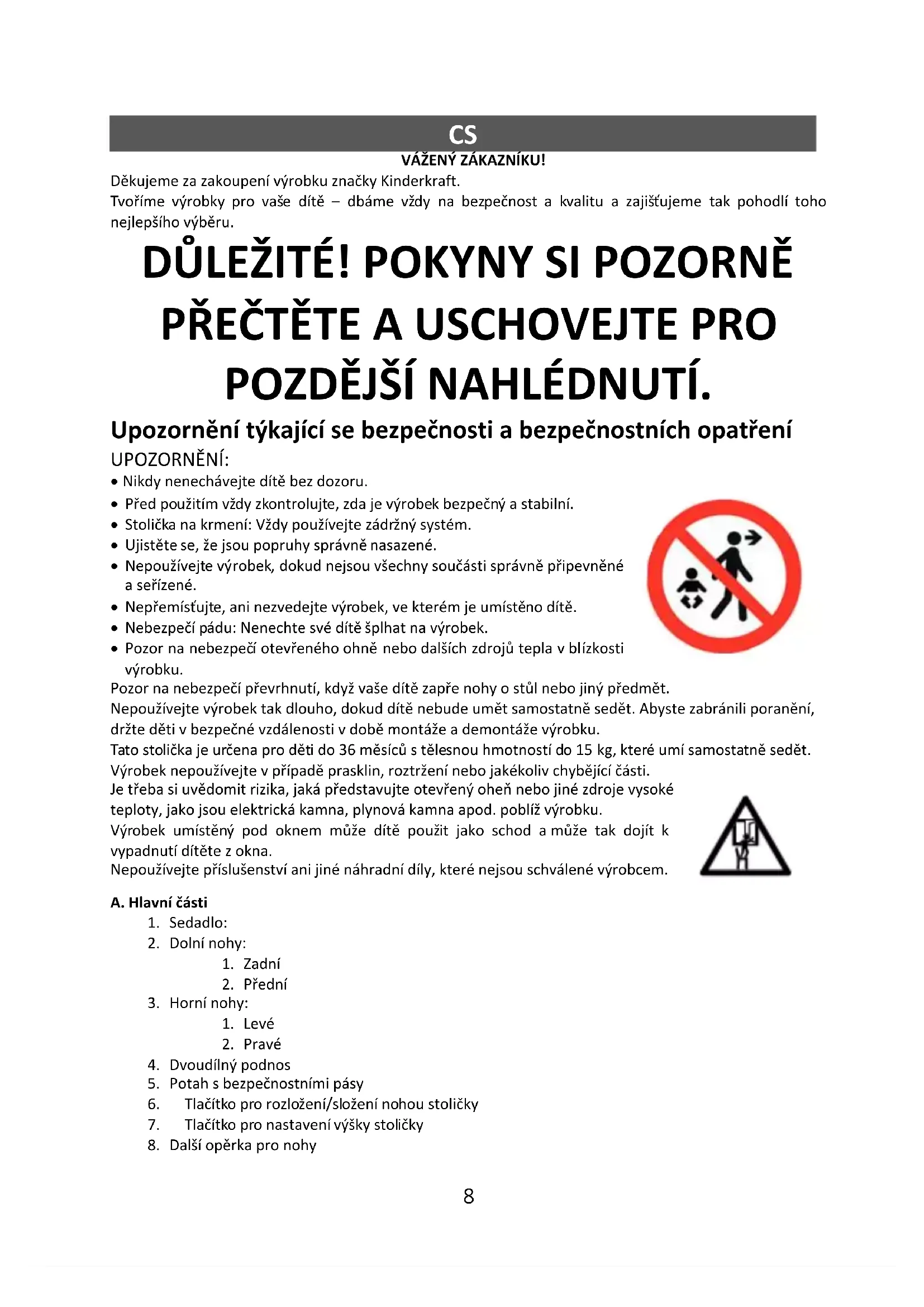 - Pozor na nebezpečí otevřeného ohně nebo dalších zdrojů tepla v blízkosti výrobku. Pozor na nebezpečí převrhnutí, když vaše dítě zapře nohy o stůl nebo jiný předmět. Nepoužívejte výrobek tak dlouho, dokud dítě nebude umět samostatně sedět. Abyste zabránili poranění, držte děti v bezpečné vzdálenosti v době montáže a demontáže výrobku. Tato stolička je určena pro děti do 36 měsíců s tělesnou hmotností do 15 kg, které umí samostatně sedět. Výrobek nepoužívejte v případě prasklin, roztržení nebo jakékoliv chybějící části. Je třeba si uvědomit rizika, jaká představujte otevřený oheň nebo jiné zdroje vysoké teploty, jako jsou elektrická kamna, plynová kamna apod. poblíž výrobku. Výrobek umístěný pod oknem může dítě použit jako schod a může tak dojít k vypadnutí dítěte z okna. Nepoužívejte příslušenství ani jiné náhradní díly, které nejsou schválené výrobcem. A. Hlavní části