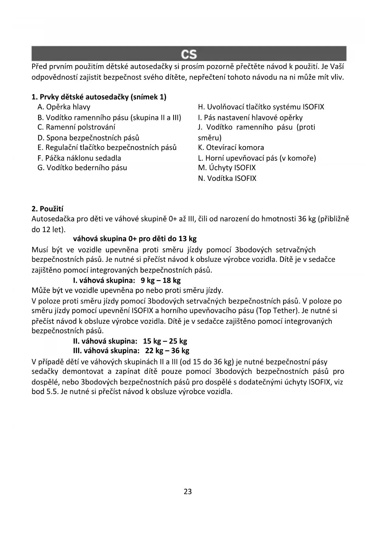 23 Před prvním použitím dětské autosedačky si prosím pozorně přečtěte návod k použití. Je Vaší odpovědností zajistit bezpečnost svého dítěte, nepřečtení tohoto návodu na ni může mít vliv.