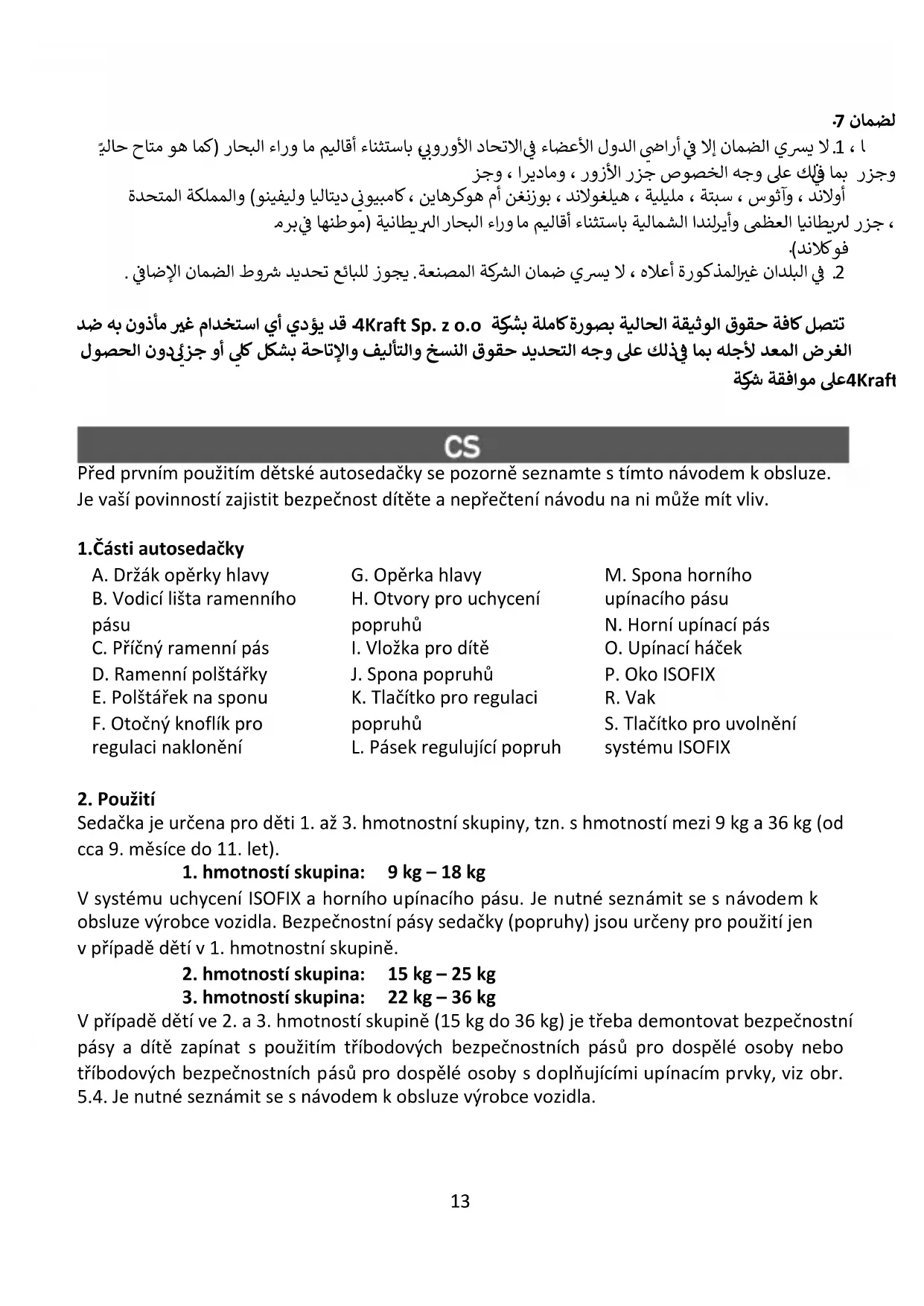 4Kraft Sp. z o.o Před prvním použitím dětské autosedačky se pozorně seznamte s tímto návodem k obsluze. Je vaší povinností zajistit bezpečnost dítěte a nepřečtení návodu na ni může mít vliv. 1.Části autosedačky A. Držák opěrky hlavy B. Vodicí lišta ramenního pásu C. Příčný ramenní pás D. Ramenní polštářky E. Polštářek na sponu F. Otočný knoflík pro regulaci naklonění G. Opěrka hlavy H. Otvory pro uchycení popruhů
