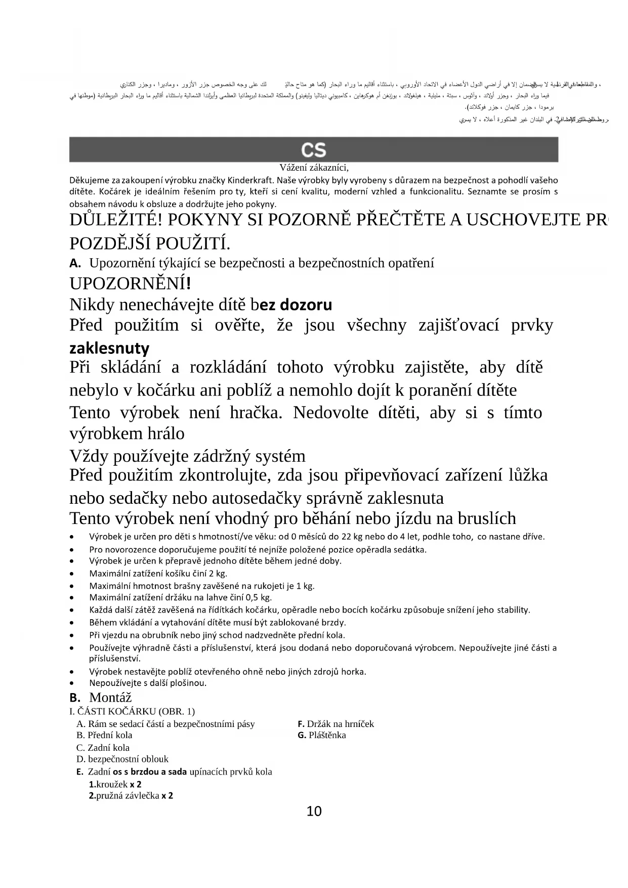 Vážení zákazníci, Děkujeme za zakoupení výrobku značky Kinderkraft. Naše výrobky byly vyrobeny s důrazem na bezpečnost a pohodlí vašeho dítěte. Kočárek je ideálním řešením pro ty, kteří si cení kvalitu, moderní vzhled a funkcionalitu. Seznamte se prosím s obsahem návodu k obsluze a dodržujte jeho pokyny. DŮLEŽITÉ! POKYNY SI POZORNĚ PŘEČTĚTE A USCHOVEJTE PRO POZDĚJŠÍ POUŽITÍ. A. Upozornění týkající se bezpečnosti a bezpečnostních opatření UPOZORNĚNÍ! Nikdy nenechávejte dítě bez dozoru Před použitím si ověřte, že jsou všechny zajišťovací prvky zaklesnuty Při skládání a rozkládání tohoto výrobku zajistěte, aby dítě nebylo v kočárku ani poblíž a nemohlo dojít k poranění dítěte Tento výrobek není hračka. Nedovolte dítěti, aby si s tímto výrobkem hrálo Vždy používejte zádržný systém Před použitím zkontrolujte, zda jsou připevňovací zařízení lůžka nebo sedačky nebo autosedačky správně zaklesnuta Tento výrobek není vhodný pro běhání nebo jízdu na bruslích