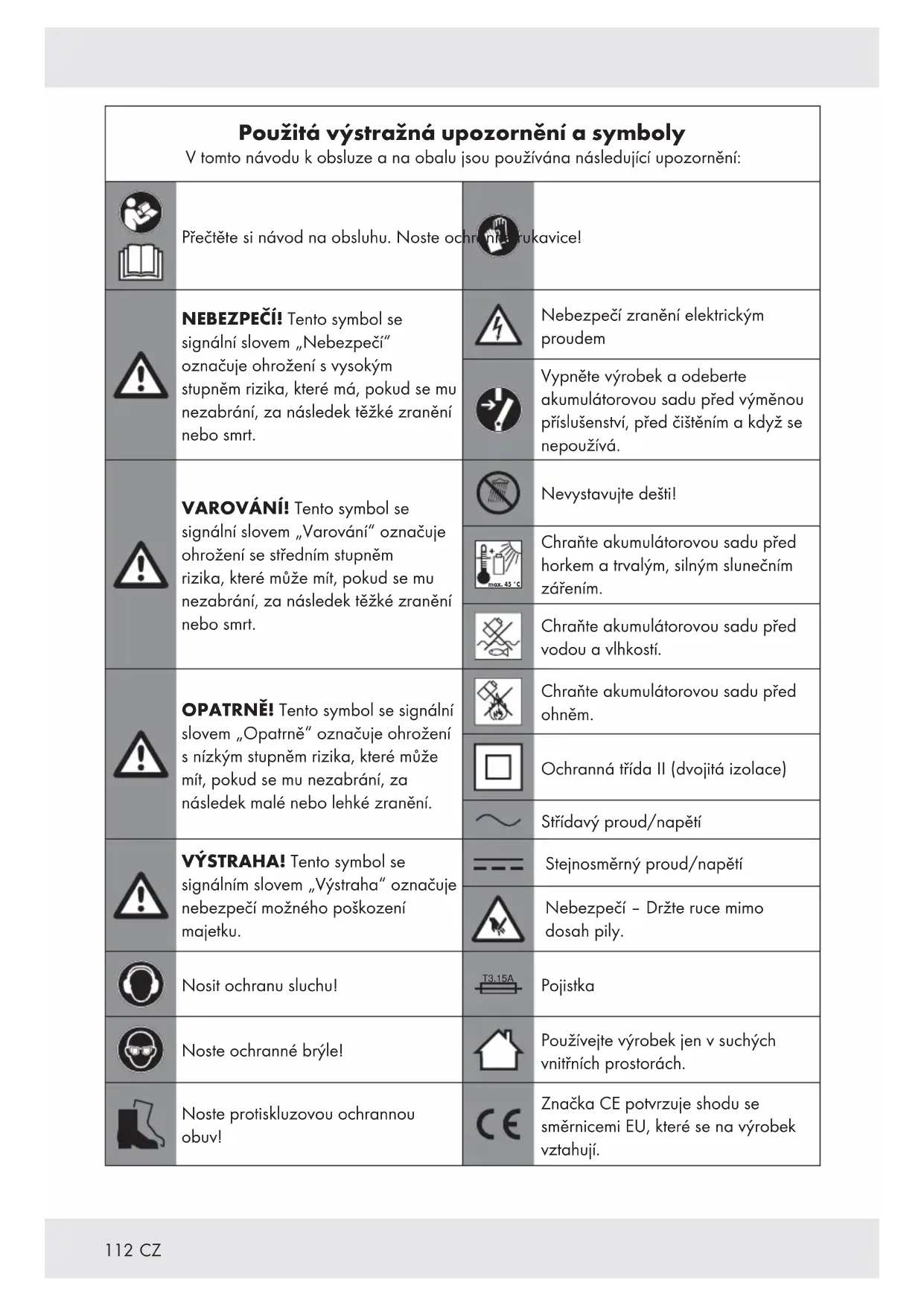 Použitá výstražná upozornění a symboly V tomto návodu k obsluze a na obalu jsou používána následující upozornění: Přečtěte si návod na obsluhu. Noste ochranné rukavice! NEBEZPEČÍ! Tento symbol se signální slovem „Nebezpečí“ označuje ohrožení s vysokým stupněm rizika, které má, pokud se mu nezabrání, za následek těžké zranění nebo smrt. Nebezpečí zranění elektrickým proudem Vypněte výrobek a odeberte akumulátorovou sadu před výměnou příslušenství, před čištěním a když se nepoužívá. VAROVÁNÍ! Tento symbol se signální slovem „Varování“ označuje ohrožení se středním stupněm rizika, které může mít, pokud se mu nezabrání, za následek těžké zranění nebo smrt. Nevystavujte dešti! max. 45°C Chraňte akumulátorovou sadu před horkem a trvalým, silným slunečním zářením. Chraňte akumulátorovou sadu před vodou a vlhkostí. OPATRNĚ! Tento symbol se signální slovem „Opatrně“ označuje ohrožení s nízkým stupněm rizika, které může mít, pokud se mu nezabrání, za následek malé nebo lehké zranění. Chraňte akumulátorovou sadu před ohněm. Ochranná třídaII (dvojitá izolace) Střídavý proud/napětí VÝSTRAHA! Tento symbol se signálním slovem „Výstraha“ označuje nebezpečí možného poškození majetku. Stejnosměrný proud/napětí Nebezpečí–Držte ruce mimo dosah pily. Nosit ochranu sluchu! T3.15A Pojistka Noste ochranné brýle! Používejte výrobek jen v suchých vnitřních prostorách. Noste protiskluzovou ochrannou obuv! Značka CE potvrzuje shodu se směrnicemi EU, které se na výrobek vztahují.113