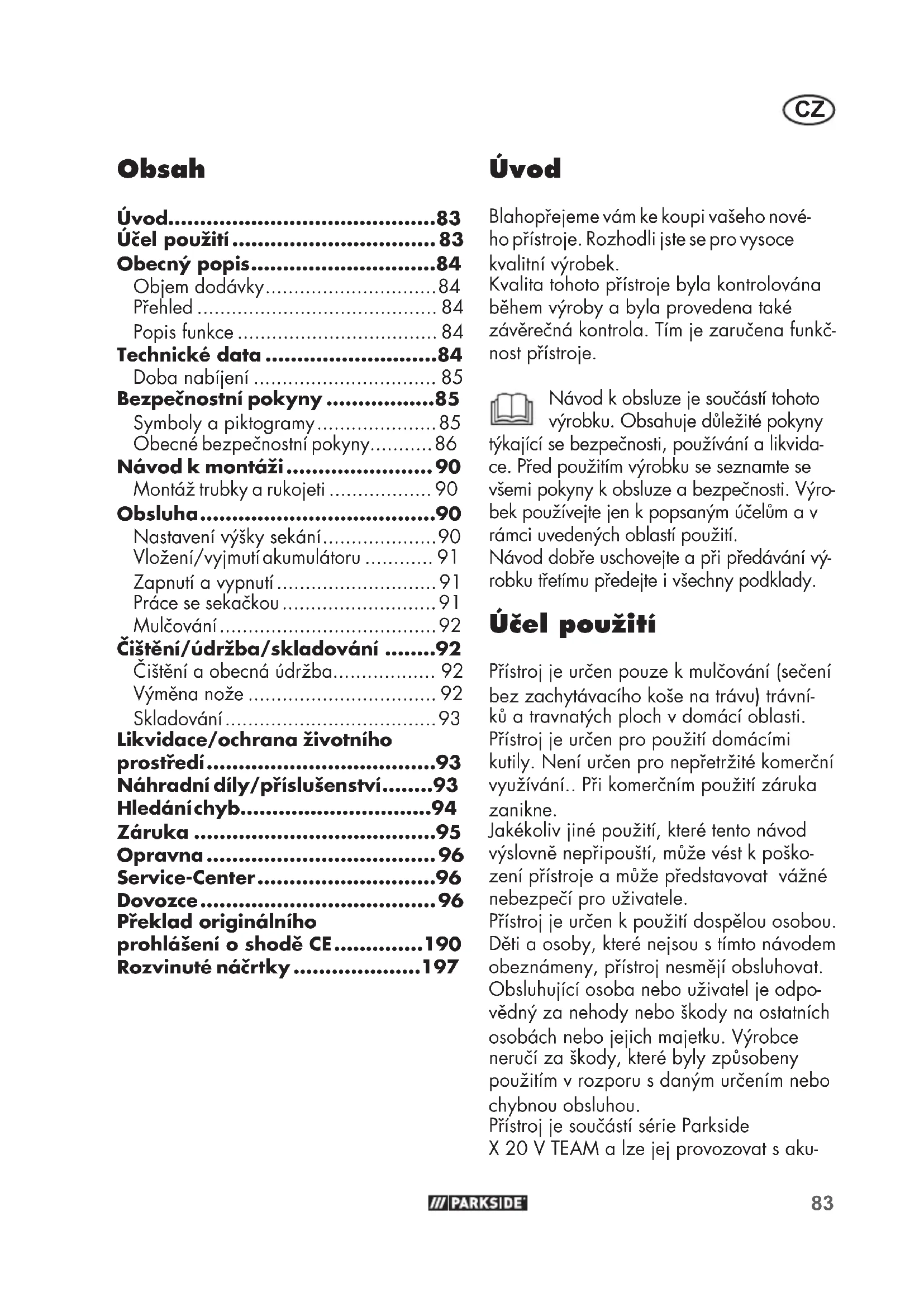 - Při komerčním použití záruka zanikne. Jakékoliv jiné použití, které tento návod výslovně nepřipouští, může vést k poško- zení přístroje a může představovat vážné nebezpečí pro uživatele. Přístroj je určen k použití dospělou osobou. Děti a osoby, které nejsou s tímto návodem obeznámeny, přístroj nesmějí obsluhovat. Obsluhující osoba nebo uživatel je odpo- vědný za nehody nebo škody na ostatních osobách nebo jejich majetku. Výrobce neručí za škody, které byly způsobeny použitím v rozporu s daným určením nebo chybnou obsluhou. Přístroj je součástí série Parkside X20VTEAM a lze jej provozovat s aku- Překlad originálního prohlášení o shodě CE p. 190