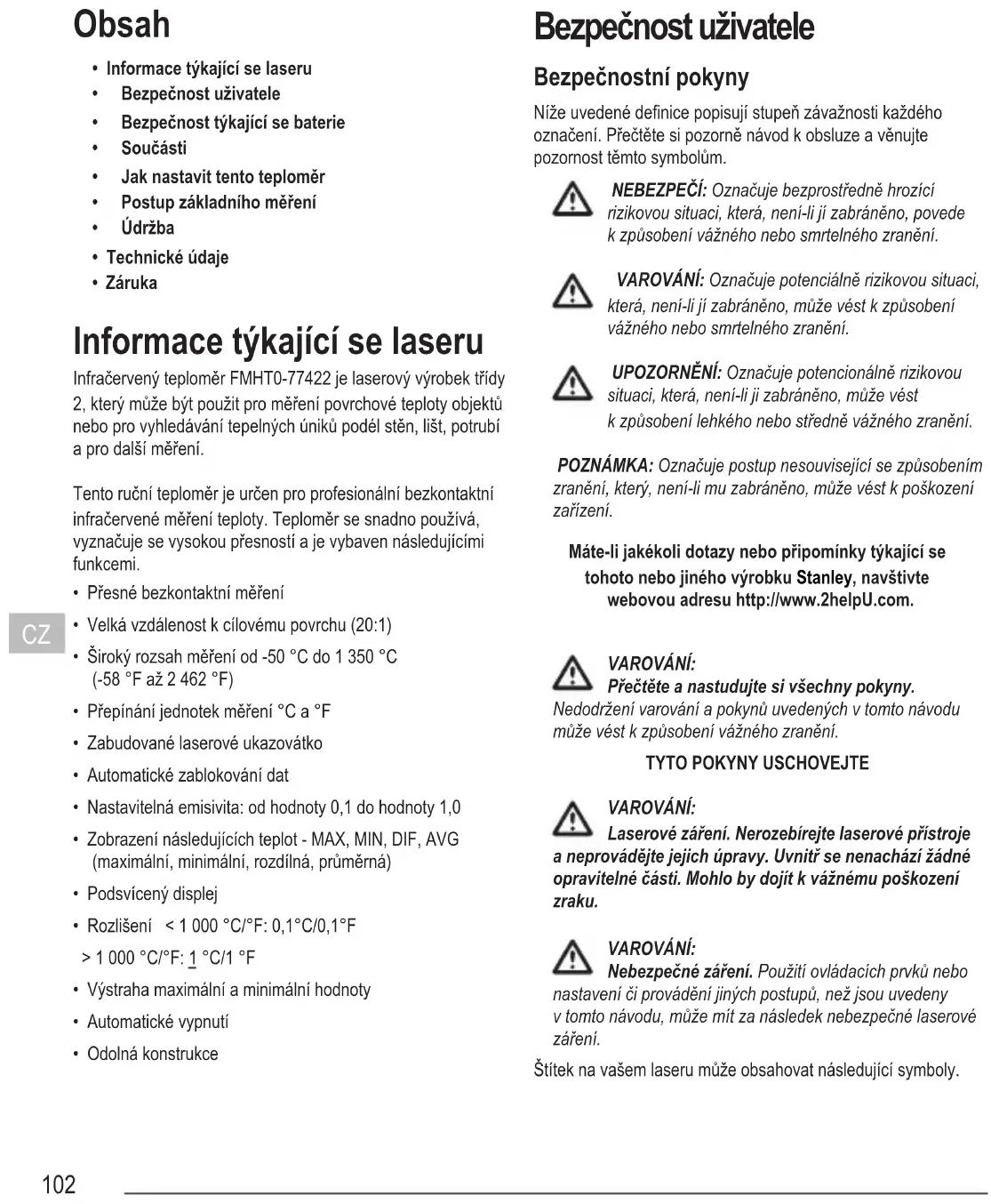Tato záruka se nevztahuje na škody způsobené náhodným poškozením, opotřebováním, použitím odlišným od pokynů výrobce nebo provedením oprav či úprav, které nebyly schváleny společností Stanley. Oprava nebo výměna provedená v rámci této záruky nebude mít žádný vliv na dobu platnosti záruky. V rozsahu povoleném zákonem nenese společnost Stanley v rámci této záruky odpovědnost za nepřímé nebo následné ztráty vyplývající z nedostatků tohoto výrobku. Tato záruka se nesmí měnit bez schválení společnosti Stanley. Tato záruka nemá žádný vliv na zákonná práva spotřebitelů kupujících tento výrobek. Tato záruka se bude řídit a interpretovat podle zákonů země, kde byl výrobek Stanley prodán a kupující neodvolatelně souhlasí s tím, že se podřídí výlučné pravomoci soudů tohoto státu při jakákoli reklamaci nebo záležitosti vyplývající z této záruky nebo související s touto zárukou. Tato záruka se nevztahuje na kalibraci a péči o tento výrobek. POZNÁMKA: Zákazník odpovídá za správné použití a za péči o tento přístroj. Mimoto zákazník také zcela odpovídá za pravidelnou kontrolu přesnosti laserové jednotky a za kalibraci přístroje. V tomto návodu mohou být provedeny změny bez předchozího upozornění.109