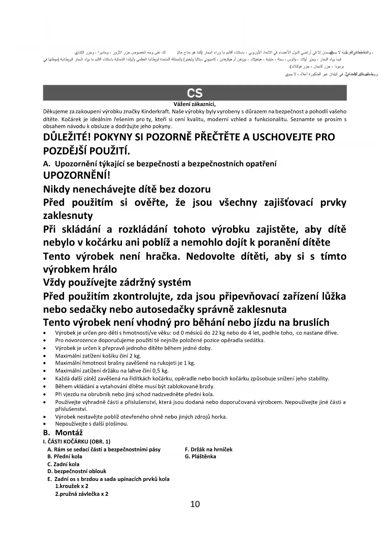 Vážení zákazníci, Děkujeme za zakoupení výrobku značky Kinderkraft. Naše výrobky byly vyrobeny s důrazem na bezpečnost a pohodlí vašeho dítěte. Kočárek je ideálním řešením pro ty, kteří si cení kvalitu, moderní vzhled a funkcionalitu. Seznamte se prosím s obsahem návodu k obsluze a dodržujte jeho pokyny. DŮLEŽITÉ! POKYNY SI POZORNĚ PŘEČTĚTE A USCHOVEJTE PRO POZDĚJŠÍ POUŽITÍ. A. Upozornění týkající se bezpečnosti a bezpečnostních opatření UPOZORNĚNÍ! Nikdy nenechávejte dítě bez dozoru Před použitím si ověřte, že jsou všechny zajišťovací prvky zaklesnuty Při skládání a rozkládání tohoto výrobku zajistěte, aby dítě nebylo v kočárku ani poblíž a nemohlo dojít k poranění dítěte Tento výrobek není hračka. Nedovolte dítěti, aby si s tímto výrobkem hrálo Vždy používejte zádržný systém Před použitím zkontrolujte, zda jsou připevňovací zařízení lůžka nebo sedačky nebo autosedačky správně zaklesnuta Tento výrobek není vhodný pro běhání nebo jízdu na bruslích