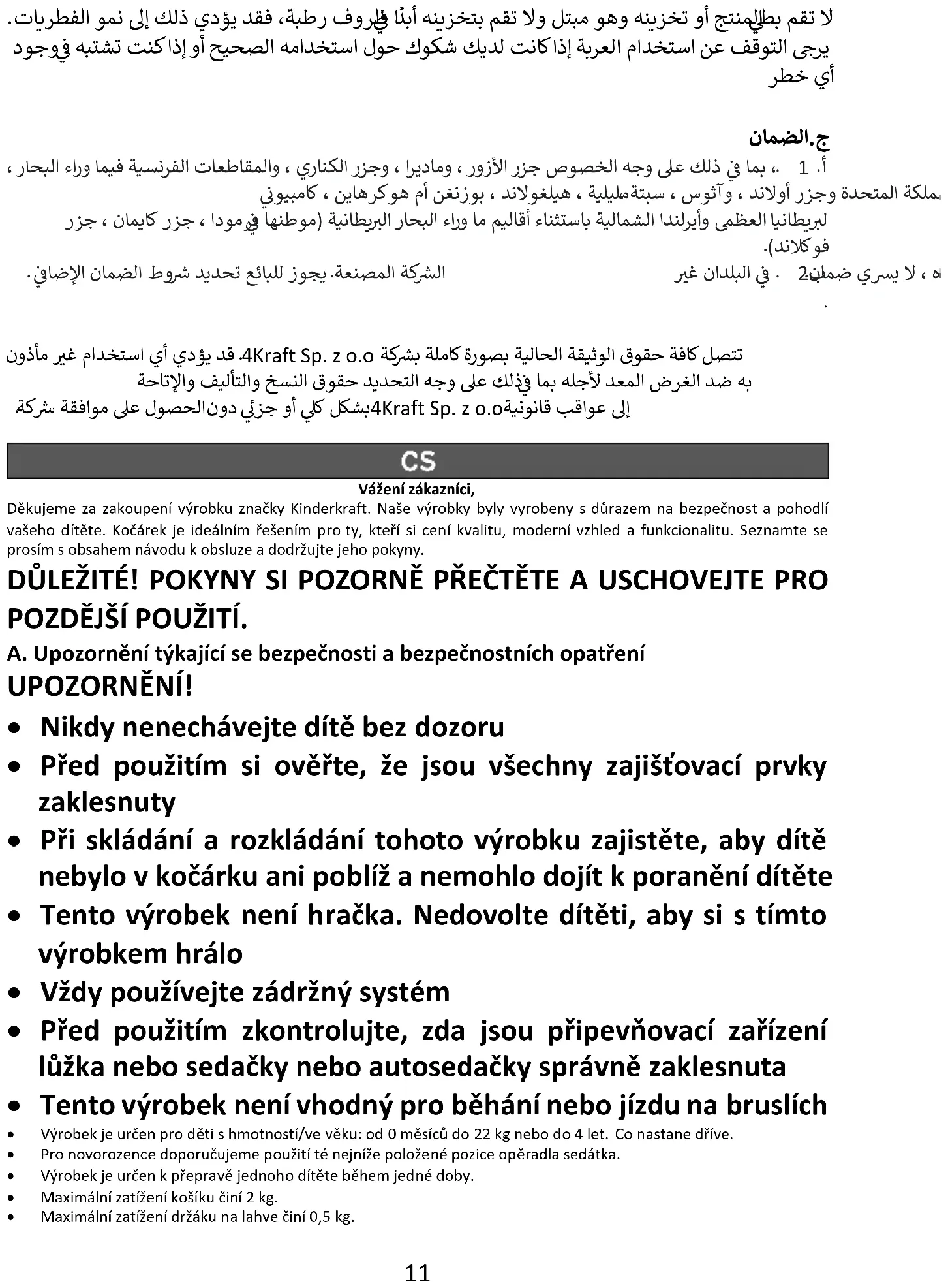 4Kraft Sp. z o.o Vážení zákazníci, DěkujemeىzaىzakoupeníىvýrobkuىznačkyىKinderkraft.ىNašeىvýrobkyىbylyىvyrobenyىs důrazemىnaىbezpečnostىaىpohodlíى vašehoى dítěte.ىKočárekىjeى ideálnímىřešenímى pro ty,ىkteří siى ceníىkvalitu,ى moderníى vzhledى aىfunkcionalitu.ى Seznamteىseى prosímىsىobsahemىnávoduىkىobsluzeىaىdodržujteىjehoىpokyny. DŮLEŽITÉ! POKYNY SI POZORNĚ PŘEČTĚTE A USCHOVEJTE PRO POZDĚJŠÍ POUŽITÍ. A. Upozornění týkající se bezpečnosti a bezpečnostních opatření UPOZORNĚNÍ!