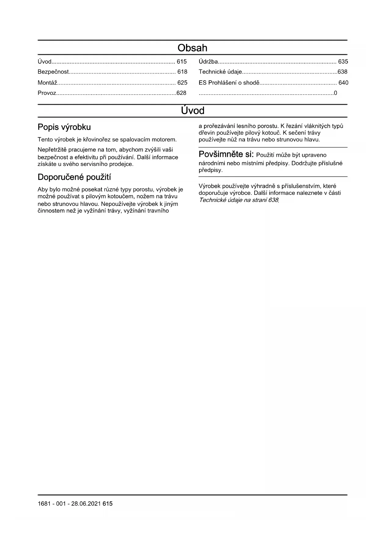 Symboly na výrobku VAROVÁNÍ! Tento výrobek je nebezpečný. Pokud není výrobek používán obezřetně a řádně, může dojít k zranění nebo usmrcení obsluhy či osob v okolí. Aby se zabránilo zranění obsluhy a osob v okolí, přečtěte si a dodržujte všechny bezpečnostní pokyny uvedené v návodu k používání. 616 1681 - 001 - 28.06.2021Před použitím si pozorně prostudujte tento návod k používání a nepoužívejte výrobek, pokud návodu zcela nerozumíte. Používejte ochrannou přilbu v místech, kde hrozí pád předmětů. Vždy používejte schválenou ochranu sluchu. Vždy používejte schválenou ochranu očí. Používejte schválené ochranné rukavice. Používejte odolnou obuv s protiskluzovou podrážkou. Výrobek může způsobit vymrštění předmětů a následné zranění. Maximální otáčky výstupního hřídele.