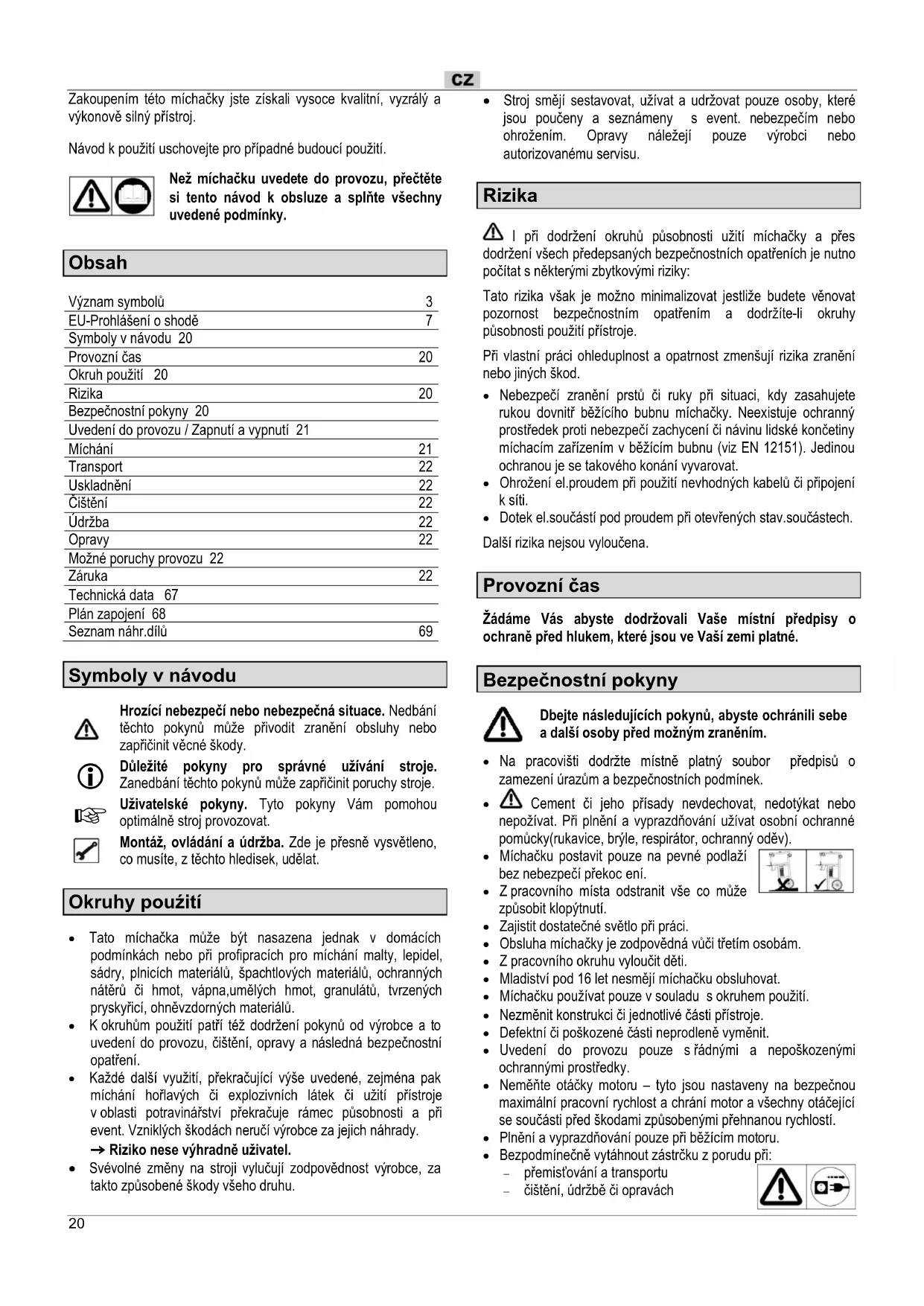 Obsah Význam symbolů 3 EU-Prohlášení o shodě 7 Symboly v návodu 20 Provozní čas 20 Okruh použití 20 Rizika 20 Bezpečnostní pokyny 20 Uvedení do provozu / Zapnutí a vypnutí 21 Míchání 21 Transport 22 Uskladnění 22 Čištění 22 Údržba 22 Opravy 22 Možné poruchy provozu 22 Záruka 22 Technická data 67 Plán zapojení 68 Seznam náhr.dílů 69 Symboly v návodu