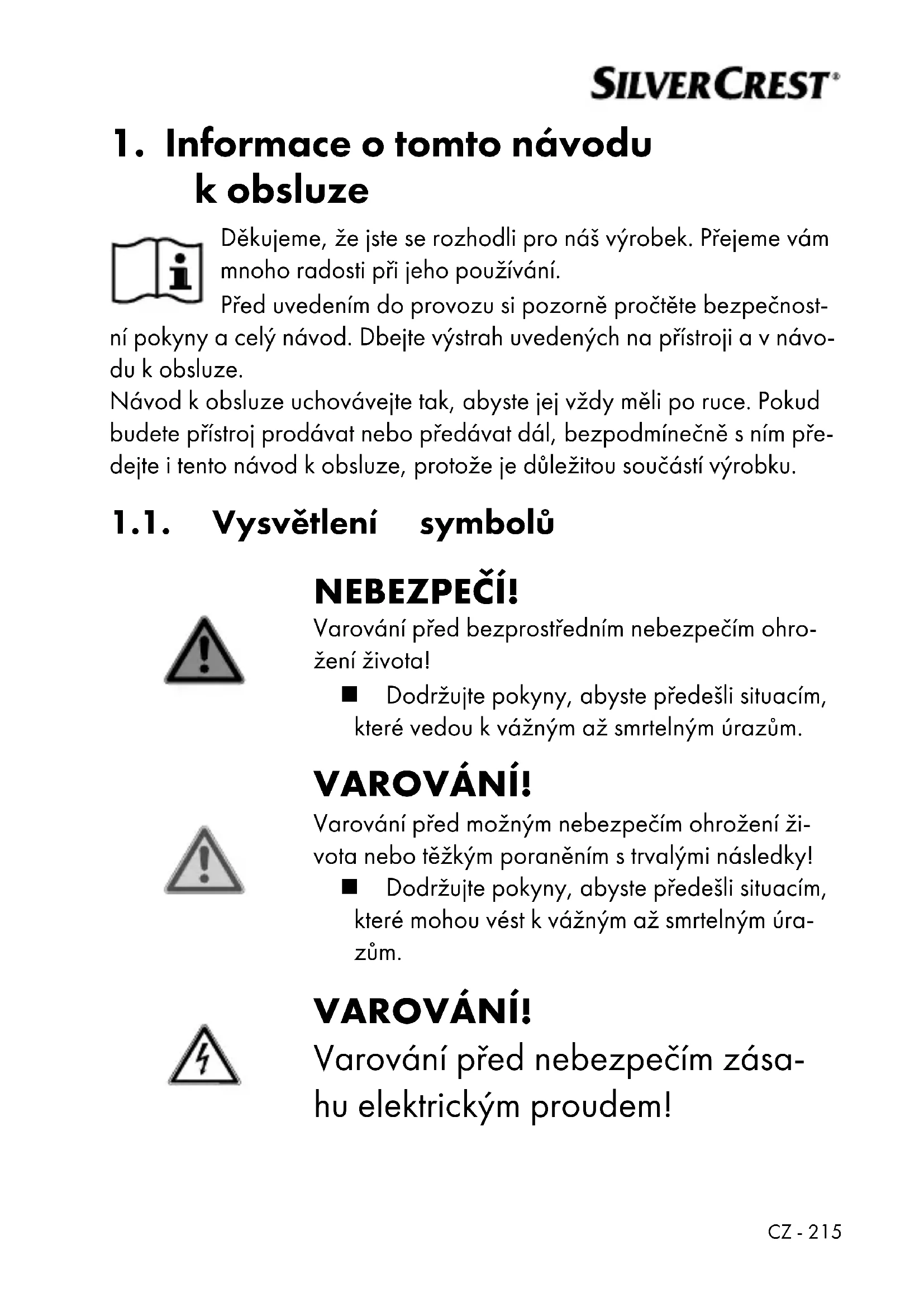 kobsluze Děkujeme, že jste se rozhodli pro náš výrobek. Přejeme vám mnoho radosti při jeho používání. Před uvedením do provozu si pozorně pročtěte bezpečnost- ní pokyny acelý návod. Dbejte výstrah uvedených na přístroji avnávo- du kobsluze. Návod kobsluze uchovávejte tak, abyste jej vždy měli po ruce. Pokud budete přístroj prodávat nebo předávat dál, bezpodmínečně sním pře- dejte itento návod kobsluze, protože je důležitou součástí výrobku. 1.1. Vysvětlení symbolů NEBEZPEČÍ! Varování před bezprostředním nebezpečím ohro- žení života! Dodržujte pokyny, abyste předešli situacím, které vedou kvážným až smrtelným úrazům. VAROVÁNÍ! Varování před možným nebezpečím ohrožení ži- vota nebo těžkým poraněním strvalými následky! Dodržujte pokyny, abyste předešli situacím, které mohou vést kvážným až smrtelným úra- zům. VAROVÁNÍ! Varování před nebezpečím zása- hu elektrickým proudem!216 - CZ VAROVÁNÍ! Varování před nebezpečím vdů- sledku příliš velké hlasitosti! UPOZORNĚNÍ! Varování před možným středně závažným nebo lehkým poraněním! Dodržujte pokyny, abyste předešli situacím, které mohou vést kdrobným nebo lehkým po- raněním. OZNÁMENÍ! Chcete-li předejít hmotným škodám, dbejte uve- dených pokynů! Dodržujte pokyny, abyste předešli situacím, které mohou vést ke hmotným škodám. Pokyny a tipy kobsluze zařízení. Dbejte upozornění uvedených vnávodu kobslu- ze! Symbol stejnosměrného proudu Symbol střídavého prouduCZ - 217 Označení CE Výrobky označené tímto symbolem splňují poža- davky směrnic EU (viz kapitolu „Informace osho- dě“). Značení obalových materiálů při třídění odpa- du. Značení pomocí zkratek (a) ačísel (b) snásle- dujícím významem: 1–7: plasty/ 20–22: papír akarton/ 80–98: kompozitní materiály Likvidaci přístroje proveďte ekologickým způso- bem (viz kapitolu „Likvidace“)