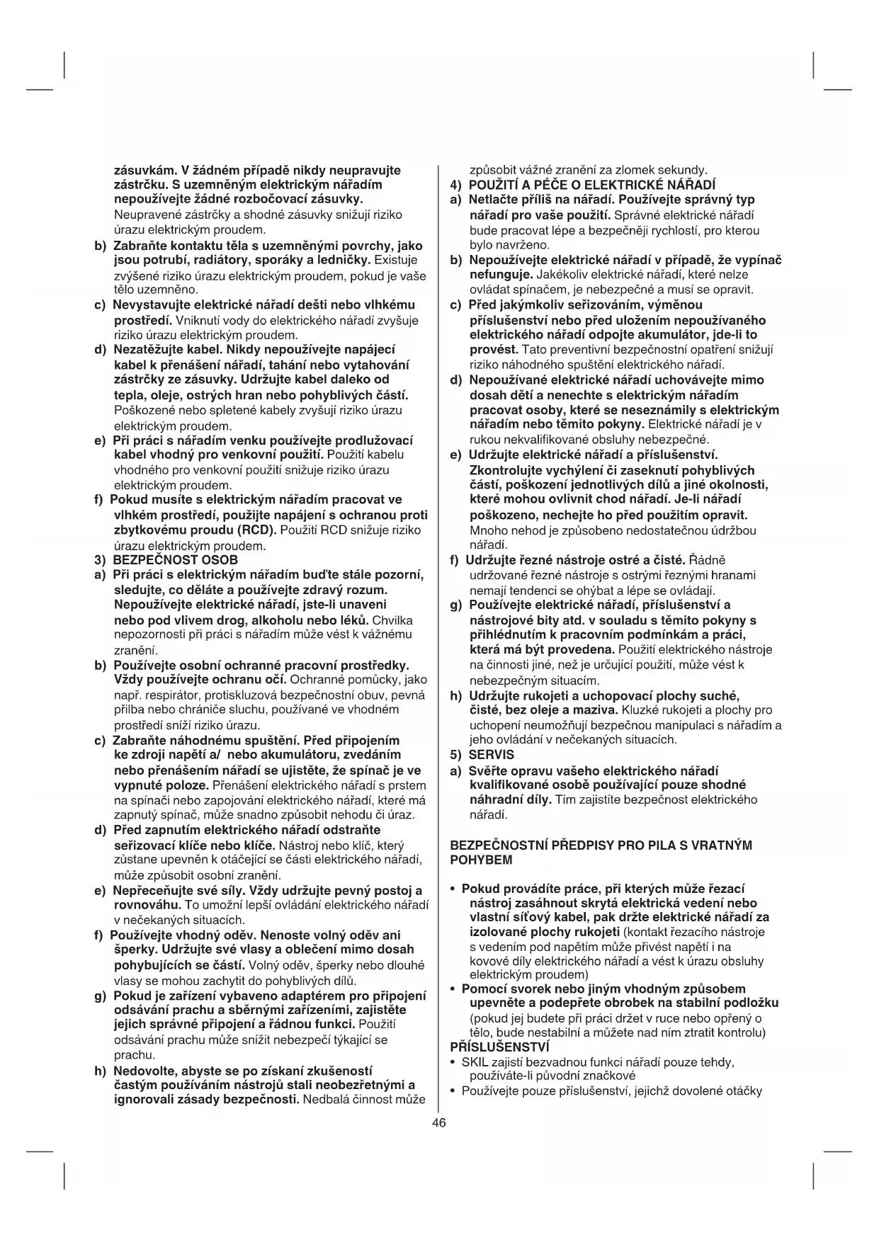 a) Netlačtepřílišnanářadí.Používejtesprávnýtyp nářadíprovašepoužití. Správné elektrické nářadí bude pracovat lépe a bezpečněji rychlostí, pro kterou bylo navrženo. b) Nepoužívejteelektrickénářadívpřípadě,ževypínač nefunguje. Jakékoliv elektrické nářadí, které nelze ovládat spínačem, je nebezpečné a musí se opravit. c) Předjakýmkolivseřizováním,výměnou příslušenstvínebopředuloženímnepoužívaného elektrickéhonářadíodpojteakumulátor,jde-lito provést. Tato preventivní bezpečnostní opatření snižují riziko náhodného spuštění elektrického nářadí. d) Nepoužívanéelektrickénářadíuchovávejtemimo dosahdětíanenechteselektrickýmnářadím pracovat osoby, které se neseznámily s elektrickým nářadímnebotěmitopokyny. Elektrické nářadí je v rukou nekvalikované obsluhy nebezpečné. e) Udržujteelektrickénářadíapříslušenství. Zkontrolujtevychýleníčizaseknutípohyblivých částí,poškozeníjednotlivýchdílůajinéokolnosti, kterémohouovlivnitchodnářadí.Je-linářadí poškozeno,nechejtehopředpoužitímopravit. Mnoho nehod je způsobeno nedostatečnou údržbou nářadí. f) Udržujteřeznénástrojeostréačisté. Řádně udržované řezné nástroje s ostrými řeznými hranami nemají tendenci se ohýbat a lépe se ovládají. g) Používejteelektrickénářadí,příslušenstvía nástrojovébityatd.vsouladustěmitopokynys přihlédnutímkpracovnímpodmínkámapráci, která má být provedena. Použití elektrického nástroje na činnosti jiné, než je určující použití, může vést k nebezpečným situacím. h) Udržujterukojetiauchopovacíplochysuché, čisté,bezolejeamaziva. Kluzké rukojeti a plochy pro uchopení neumožňují bezpečnou manipulaci s nářadím a jeho ovládání v nečekaných situacích.