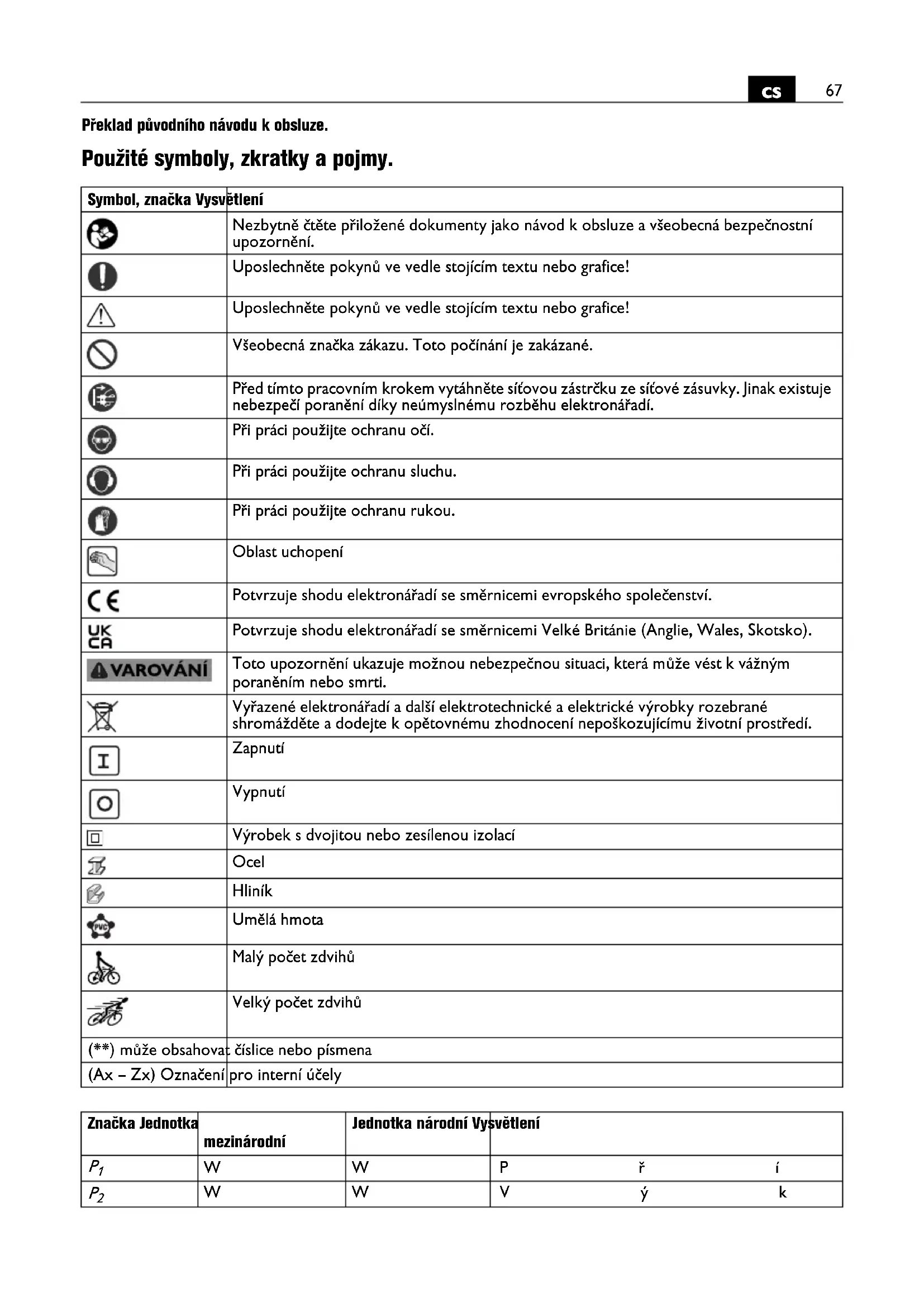 Překlad původního návodu k obsluze. Použité symboly, zkratky a pojmy. Symbol, značka Vysvětlení Nezbytně čtěte přiložené dokumenty jako návod k obsluze a všeobecná bezpečnostní upozornění. Uposlechněte pokynů ve vedle stojícím textu nebo grafice! Uposlechněte pokynů ve vedle stojícím textu nebo grafice! Všeobecná značka zákazu. Toto počínání je zakázané. Před tímto pracovním krokem vytáhněte síťovou zástrčku ze síťové zásuvky. Jinak existuje nebezpečí poranění díky neúmyslnému rozběhu elektronářadí. Při práci použijte ochranu očí. Při práci použijte ochranu sluchu. Při práci použijte ochranu rukou. Oblast uchopení Potvrzuje shodu elektronářadí se směrnicemi evropského společenství. Potvrzuje shodu elektronářadí se směrnicemi Velké Británie (Anglie, Wales, Skotsko). Toto upozornění ukazuje možnou nebezpečnou situaci, která může vést k vážným poraněním nebo smrti. Vyřazené elektronářadí a další elektrotechnické a elektrické výrobky rozebrané shromážděte a dodejte k opětovnému zhodnocení nepoškozujícímu životní prostředí. Zapnutí Vypnutí Výrobek s dvojitou nebo zesílenou izolací Ocel Hliník Umělá hmota Malý počet zdvihů Velký počet zdvihů (**) může obsahovat číslice nebo písmena (Ax – Zx) Označení pro interní účely Značka Jednotka mezinárodní Jednotka národní Vysvětlení