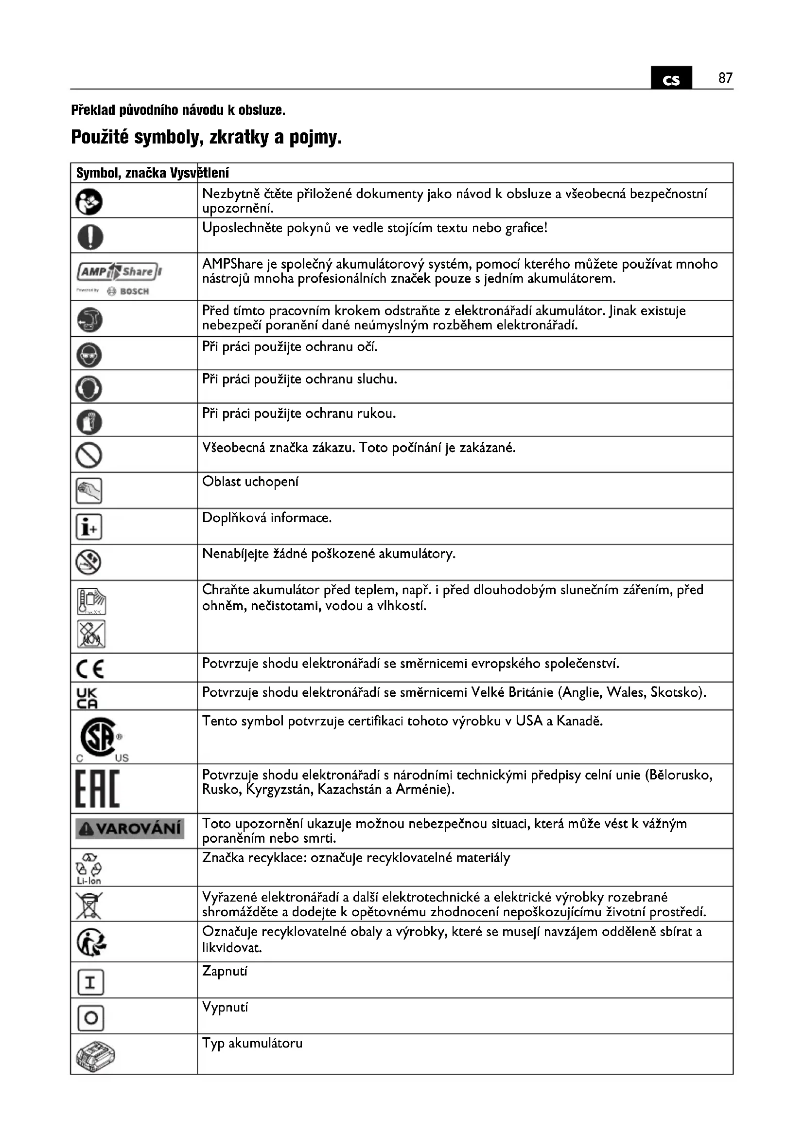 Překlad původního návodu k obsluze. Použité symboly, zkratky a pojmy. Symbol, značka Vysvětlení Nezbytně čtěte přiložené dokumenty jako návod k obsluze a všeobecná bezpečnostní upozornění. Uposlechněte pokynů ve vedle stojícím textu nebo grafice! AMPShare je společný akumulátorový systém, pomocí kterého můžete používat mnoho nástrojů mnoha profesionálních značek pouze s jedním akumulátorem. Před tímto pracovním krokem odstraňte z elektronářadí akumulátor. Jinak existuje nebezpečí poranění dané neúmyslným rozběhem elektronářadí. Při práci použijte ochranu očí. Při práci použijte ochranu sluchu. Při práci použijte ochranu rukou. Všeobecná značka zákazu. Toto počínání je zakázané. Oblast uchopení Doplňková informace. Nenabíjejte žádné poškozené akumulátory. Chraňte akumulátor před teplem, např. i před dlouhodobým slunečním zářením, před ohněm, nečistotami, vodou a vlhkostí. Potvrzuje shodu elektronářadí se směrnicemi evropského společenství. Potvrzuje shodu elektronářadí se směrnicemi Velké Británie (Anglie, Wales, Skotsko). Tento symbol potvrzuje certifikaci tohoto výrobku v USA a Kanadě. Potvrzuje shodu elektronářadí s národními technickými předpisy celní unie (Bělorusko, Rusko, Kyrgyzstán, Kazachstán a Arménie). Toto upozornění ukazuje možnou nebezpečnou situaci, která může vést k vážným poraněním nebo smrti. Značka recyklace: označuje recyklovatelné materiály Vyřazené elektronářadí a další elektrotechnické a elektrické výrobky rozebrané shromážděte a dodejte k opětovnému zhodnocení nepoškozujícímu životní prostředí. Označuje recyklovatelné obaly a výrobky, které se musejí navzájem odděleně sbírat a likvidovat. Zapnutí Vypnutí Typ akumulátoru max.50°C88
