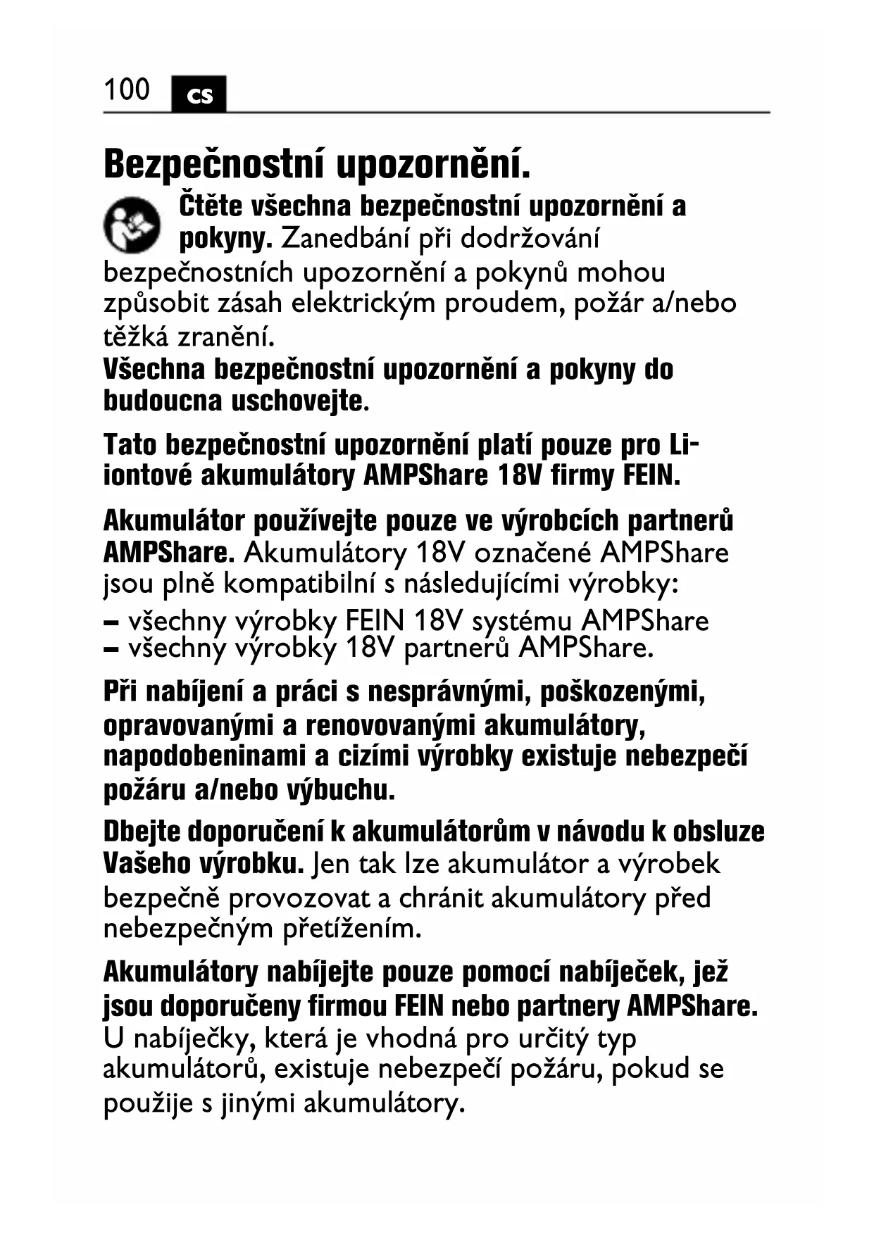 Bezpečnostní upozornění. Čtěte všechna bezpečnostní upozornění a pokyny. Zanedbání při dodržování bezpečnostních upozornění a pokynů mohou způsobit zásah elektrickým proudem, požár a/nebo těžká zranění. Všechna bezpečnostní upozornění a pokyny do budoucna uschovejte. Tato bezpečnostní upozornění platí pouze pro Li- iontové akumulátory AMPShare 18V firmy FEIN. Akumulátor používejte pouze ve výrobcích partnerů AMPShare. Akumulátory 18V označené AMPShare jsou plně kompatibilní s následujícími výrobky: – všechny výrobky FEIN 18V systému AMPShare – všechny výrobky 18V partnerů AMPShare. Při nabíjení a práci s nesprávnými, poškozenými, opravovanými a renovovanými akumulátory, napodobeninami a cizími výrobky existuje nebezpečí požáru a/nebo výbuchu. Dbejte doporučení k akumulátorům v návodu k obsluze Vašeho výrobku. Jen tak lze akumulátor a výrobek bezpečně provozovat a chránit akumulátory před nebezpečným přetížením. Akumulátory nabíjejte pouze pomocí nabíječek, jež jsou doporučeny firmou FEIN nebo partnery AMPShare. U nabíječky, která je vhodná pro určitý typ akumulátorů, existuje nebezpečí požáru, pokud se použije s jinými akumulátory.101
