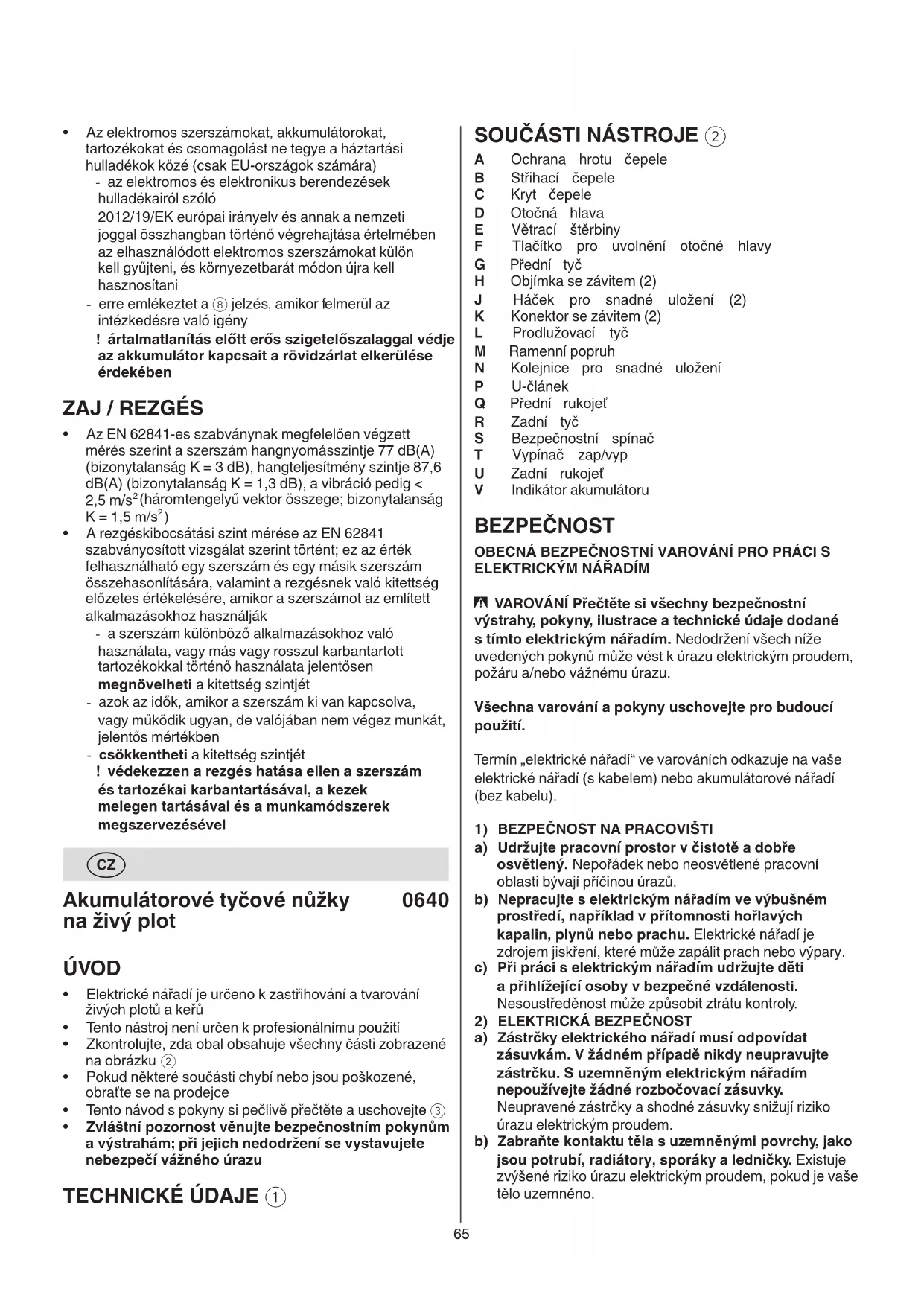 P U-článek Q Přední rukojeť R Zadní tyč S Bezpečnostní spínač T Vypínač zap/vyp U Zadní rukojeť V Indikátor akumulátoru BEZPEČNOST OBECNÁ BEZPEČNOSTNÍ VAROVÁNÍ PRO PRÁCI S