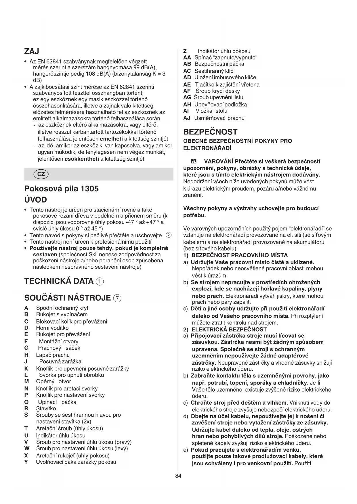 c84 Z Indikátor úhlu pokosu AA Spínač “zapnuto/vypnuto” AB Bezpečnostní páčka AC Šestihranný klíč AD Uložení imbusového klíče AE Tlačítko k zajištění vřetena AF Šroub krycí desky AG Šroub upevnění listu AH Upevňovací podložka AI Vložka stolu AJ Usměrňovač prachu BEZPEČNOST