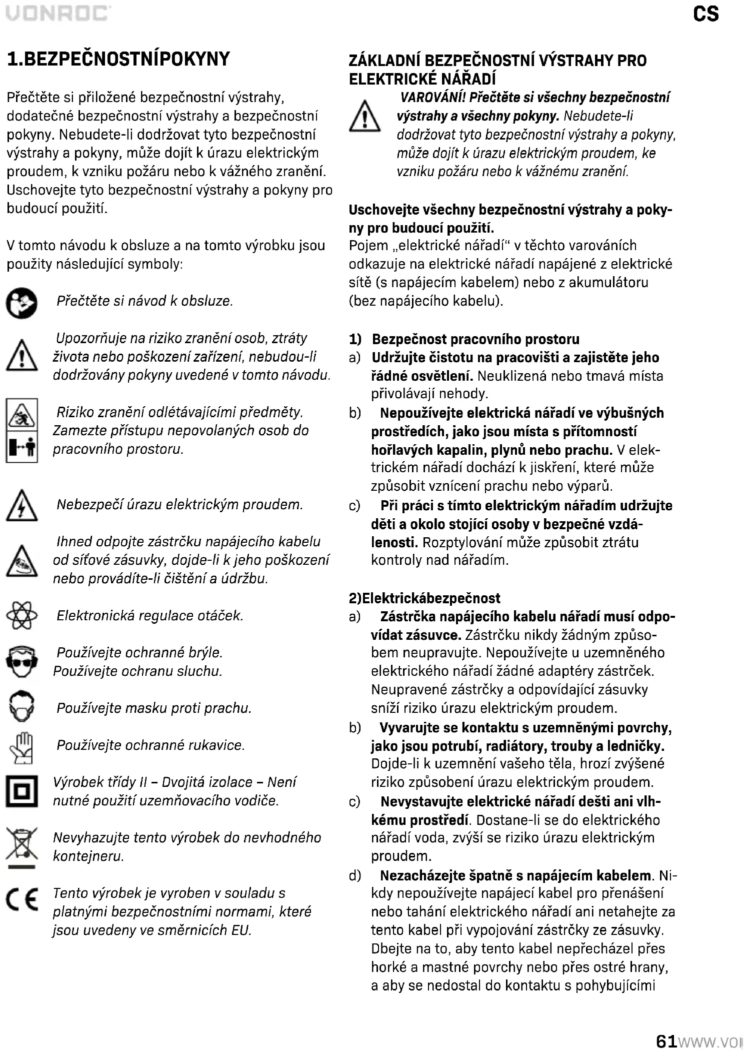 Přečtěte si přiložené bezpečnostní výstrahy, dodatečné bezpečnostní výstrahy a bezpečnostní pokyny. Nebudete-li dodržovat tyto bezpečnostní výstrahy a pokyny, může dojít k úrazu elektrickým proudem, k vzniku požáru nebo k vážného zranění. Uschovejte tyto bezpečnostní výstrahy a pokyny pro budoucí použití. V tomto návodu k obsluze a na tomto výrobku jsou použity následující symboly: Přečtěte si návod k obsluze. Upozorňuje na riziko zranění osob, ztráty života nebo poškození zařízení, nebudou-li dodržovány pokyny uvedené v tomto návodu. Riziko zranění odlétávajícími předměty. Zamezte přístupu nepovolaných osob do pracovního prostoru. Nebezpečí úrazu elektrickým proudem. Ihned odpojte zástrčku napájecího kabelu od síťové zásuvky, dojde-li k jeho poškození nebo provádíte-li čištění a údržbu. Elektronická regulace otáček. Používejte ochranné brýle. Používejte ochranu sluchu. Používejte masku proti prachu. Používejte ochranné rukavice. Výrobek třídy II – Dvojitá izolace – Není nutné použití uzemňovacího vodiče. Nevyhazujte tento výrobek do nevhodného kontejneru. Tento výrobek je vyroben v souladu s platnými bezpečnostními normami, které jsou uvedeny ve směrnicích EU. ZÁKLADNÍ BEZPEČNOSTNÍ VÝSTRAHY PRO