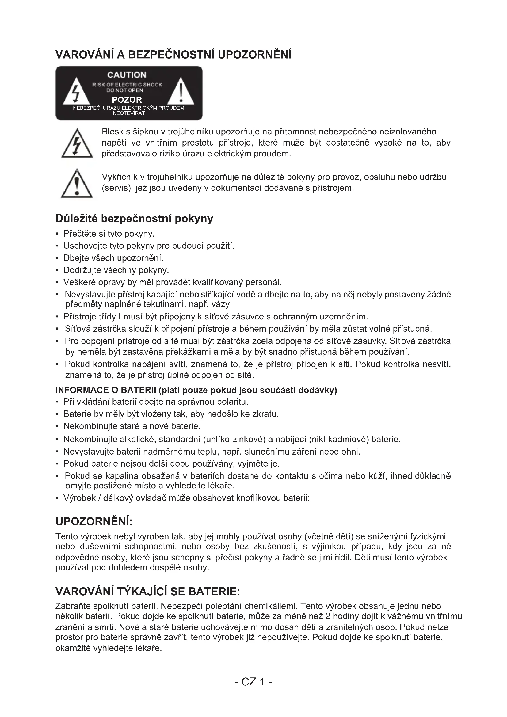 POZOR Blesk s šipkou v trojúhelníku upozorňuje na přítomnost nebezpečného neizolovaného napětí ve vnitřním prostotu přístroje, které může být dostatečně vysoké na to, aby představovalo riziko úrazu elektrickým proudem. Vykřičník v trojúhelníku upozorňuje na důležité pokyny pro provoz, obsluhu nebo údržbu (servis), jež jsou uvedeny v dokumentací dodávané s přístrojem. Důležité bezpečnostní pokyny