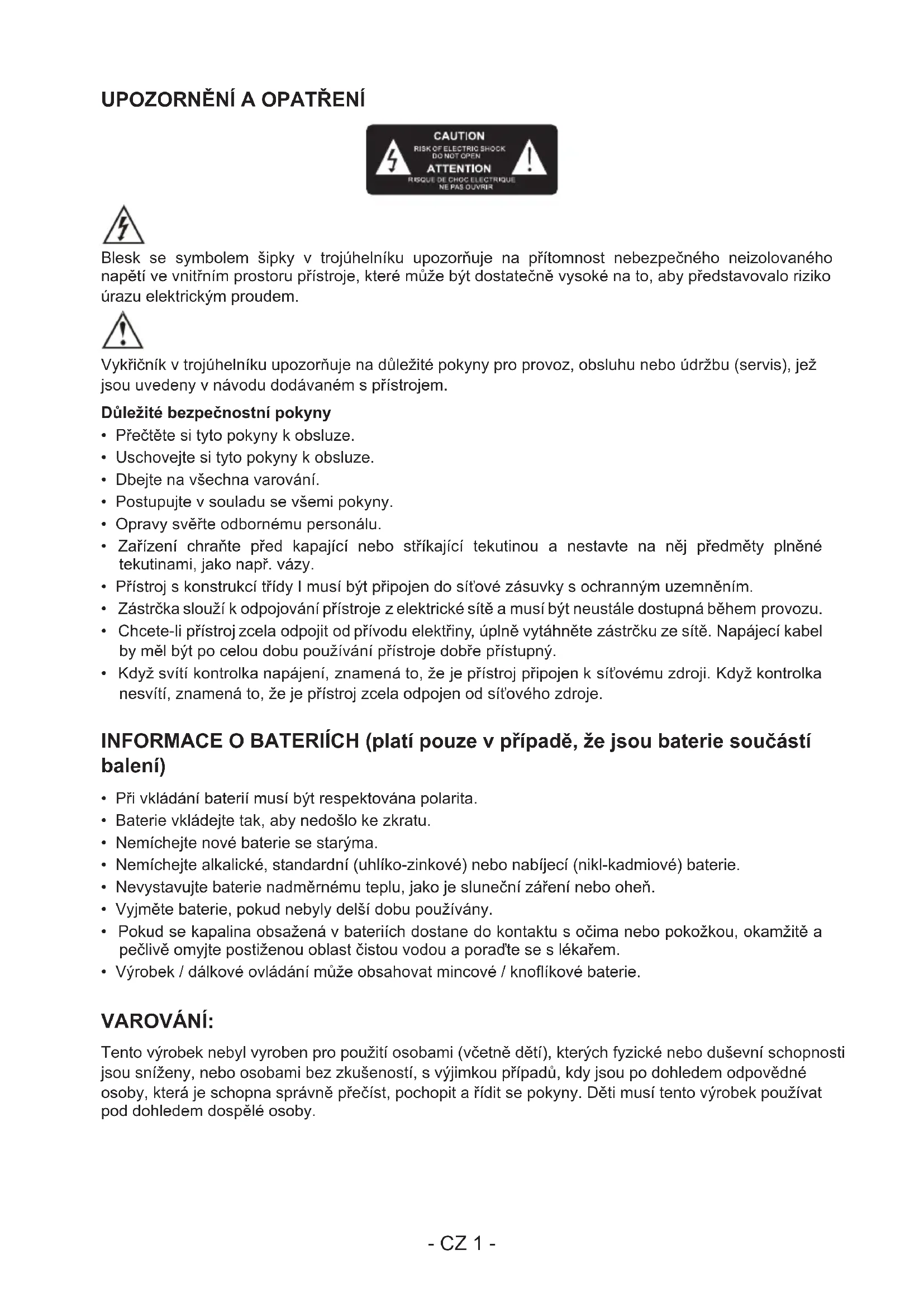- Výrobek / dálkové ovládání může obsahovat mincové / knoíkové baterie. VAROVÁNÍ: Tento výrobek nebyl vyroben pro použití osobami (včetně dětí), kterých fyzické nebo duševní schopnosti jsou sníženy, nebo osobami bez zkušeností, s výjimkou případů, kdy jsou po dohledem odpovědné osoby, která je schopna správně přečíst, pochopit a řídit se pokyny. Děti musí tento výrobek používat pod dohledem dospělé osoby.- CZ 2 - VAROVÁNÍ OHLEDNĚ BATERIÍ: Nespolkněte baterie. Riziko chemického popálení. Tento výrobek obsahuje jednu nebo několik baterií. Pokud dojde k spolknutí baterie, může během méně než 2 hodin způsobit těžké vnitřní poškození a smrt. Udržujte nové a staré baterie mimo dosah dětí a zranitelných osob. Pokud nelze baterii správně zavřít, výrobek dále nepoužívejte. Pokud dojde k spolknutí baterie, okamžitě vyhledejte lékařskou pomoc. DŮLEŽITÉ POZNÁMKY: Nebezpečí výbuchu, pokud jsou baterie nesprávně vyměněny, nebo pokud se výrobek delší dobu nepoužívá s bateriemi ponechanými uvnitř. Vyměňte staré baterie za stejné nebo podobné modely. dvojitá izolace stejnosměrný proud střídavý proud Symbol pro vnitřní použití Péče o životní prostředí Tento výrobek je navržen a vyroben z vysoce kvalitních materiálů a komponent, které lze recyklovat a znovu použít. Součástí tohoto výrobku jsou baterie, které podléhají evropské směrnici 2006/66/ES a nemohou být likvidovány společně s běžným domovním odpadem. Informujte se o místních pravidlech o odděleném sběru baterií, protože správná likvidace pomáhá předcházet negativním důsledkům pro životní prostředí a lidské zdraví. Když je tento symbol přeškrtnutého koše připojen k výrobku, znamená to, že se na výrobek vztahuje evropská směrnice 2002/96/ES. Informujte se o místním systému sběru tříděného odpadu elektrických a elektronických výrobků. Postupujte podle místních předpisů a staré výrobky nelikvidujte s běžným domovním odpadem. Správná likvidace starého výrobku přispívá ke snížení negativního vlivu na životní prostředí a na zdraví lidí. Soulad Tento výrobek splňuje požadavky na rádiové rušení Evropského společenství. Toto zařízení obsahuje tento štítek- CZ 3 - Bateriové napájení: Ujistěte se, že baterie jsou vloženy správně, aby nedošlo k poškození výrobku. Baterie vždy vyberte, když se přístroj nebude používat po delší dobu, aby se zabránilo vytečení a možnému poškození přístroje korozí. Používejte baterie stejného typu. Nikdy nepoužívejte různé typy baterií dohromady. Nevhazujte baterie do ohně nebo je nevystavujte slunci a podobně. Pokud se kapalina obsažená v bateriích dostane do kontaktu s očima nebo pokožkou, okamžitě pečlivě opláchněte postiženou oblast čistou vodou a poraďte se s lékařem. VÝSTRAHA