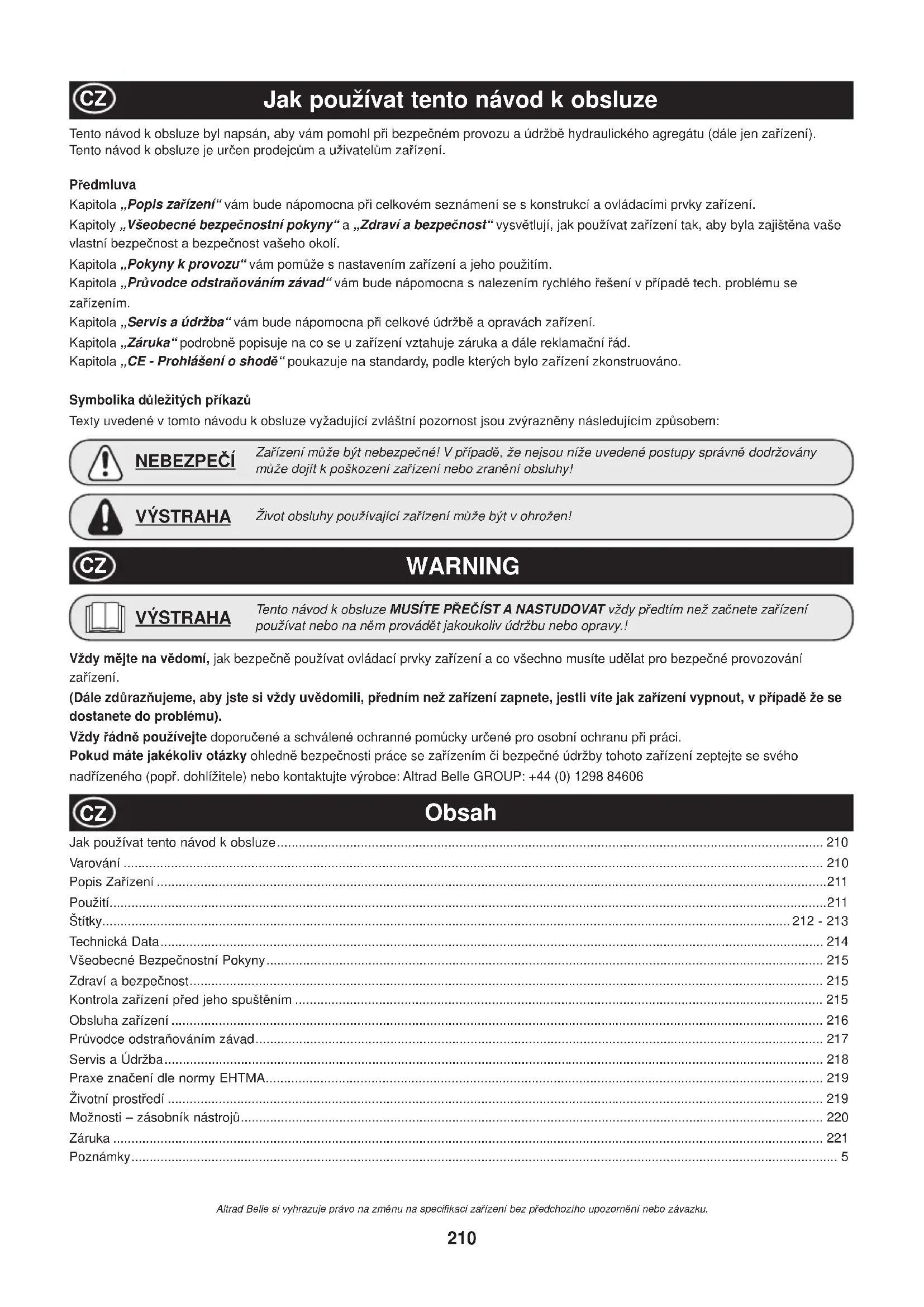 ɟɞɧɚ ɩɨ-„ɡɟɥɟɧɚ“ ɢ ɩɨ-ɟɤɨɥɨɝɨɫɴɨɛɪɚɡɧɚ ɤɨɦɩɚɧɢɹ, ɧɢɟ ɜɴɜɟɞɨɯɦɟ ɦɨɞɟɥɚ ɧɚ ɨɧɥɚɣɧ ɪɟɝɢɫɬɪɢɪɚɧɟ ɧɚ ɝɚɪɚɧɰɢɹɬɚ. Ɂɚ ɞɨɫɬɴɩ ɞɨ ɫɬɪɚɧɢɰɚɬɚ ɡɚ ɪɟɝɢɫɬɪɢɪɚɧɟ ɧɚ ɧɚɲɢɹ ɭɟɛ ɫɚɣɬ, ɦɨɥɹ, ɢɡɩɨɥɡɜɚɣɬɟ ɫɥɟɞɧɢɹ ɚɞɪɟɫ: http://www.bellegroup.com/index.php?p=warranty_registration Ɇɨɠɟɬɟ ɢ ɞɚ ɫɤɚɧɢɪɚɬɟ ɫɴɫ ɫɦɚɪɬɮɨɧɚ ɫɢ ɩɪɢɥɟɠɚɳɢɹ QR ɤɨɞ (ɤɨɞ ɡɚ ɛɴɪɡ ɨɬɝɨɜɨɪ) ɡɚ ɞɨɫɬɴɩ ɞɨ ɫɬɪɚɧɢɰɚɬɚ ɡɚ ɪɟɝɢɫɬɪɢɪɚɧɟ.210 Jak používat tento návod k obsluze Tento návod k obsluze byl napsán, aby vám pomohl pĜi bezpeþném provozu a údržbČ hydraulického agregátu (dále jen zaĜízení). Tento návod k obsluze je urþen prodejcĤm a uživatelĤm zaĜízení. PĜedmluva Kapitola „Popis zaĜízení“ vám bude nápomocna pĜi celkovém seznámení se s konstrukcí a ovládacími prvky zaĜízení. Kapitoly „Všeobecné bezpeþnostní pokyny“ a „Zdraví a bezpeþnost“ vysvČtlují, jak používat zaĜízení tak, aby byla zajištČna vaše vlastní bezpeþnost a bezpeþnost vašeho okolí. Kapitola „Pokyny k provozu“ vám pomĤže s nastavením zaĜízení a jeho použitím. Kapitola „PrĤvodce odstraĖováním závad“ vám bude nápomocna s nalezením rychlého Ĝešení v pĜípadČ tech. problému se zaĜízením. Kapitola „Servis a údržba“ vám bude nápomocna pĜi celkové údržbČ a opravách zaĜízení. Kapitola „Záruka“ podrobnČ popisuje na co se u zaĜízení vztahuje záruka a dále reklamaþní Ĝád. Kapitola „CE - Prohlášení o shodČ“ poukazuje na standardy, podle kterých bylo zaĜízení zkonstruováno. Symbolika d Ĥležitých pĜíkazĤ Texty uvedené v tomto návodu k obsluze vyžadující zvláštní pozornost jsou zvýraznČny následujícím zpĤsobem: ZaĜízení mĤže být nebezpeþné! V pĜípadČ, že nejsou níže uvedené postupy správnČ dodržovány mĤže dojít k poškození zaĜízení nebo zranČní obsluhy! NEBEZPEýÍ Život obsluhy používající zaĜízení mĤže být v ohrožen! VÝSTRAHA WARNING Obsah Vždy mČjte na vČdomí, jak bezpeþnČ používat ovládací prvky zaĜízení a co všechno musíte udČlat pro bezpeþné provozování zaĜízení. (Dále zdĤrazĖujeme, aby jste si vždy uvČdomili, pĜedním než zaĜízení zapnete, jestli víte jak zaĜízení vypnout, v pĜípadČ že se dostanete do problému). Vždy ĜádnČ používejte doporuþené a schválené ochranné pomĤcky urþené pro osobní ochranu pĜi práci. Pokud máte jakékoliv otázky ohlednČ bezpeþnosti práce se zaĜízením þi bezpeþné údržby tohoto zaĜízení zeptejte se svého nadĜízeného (popĜ. dohlížitele) nebo kontaktujte výrobce: Altrad Belle GROUP: +44 (0) 1298 84606