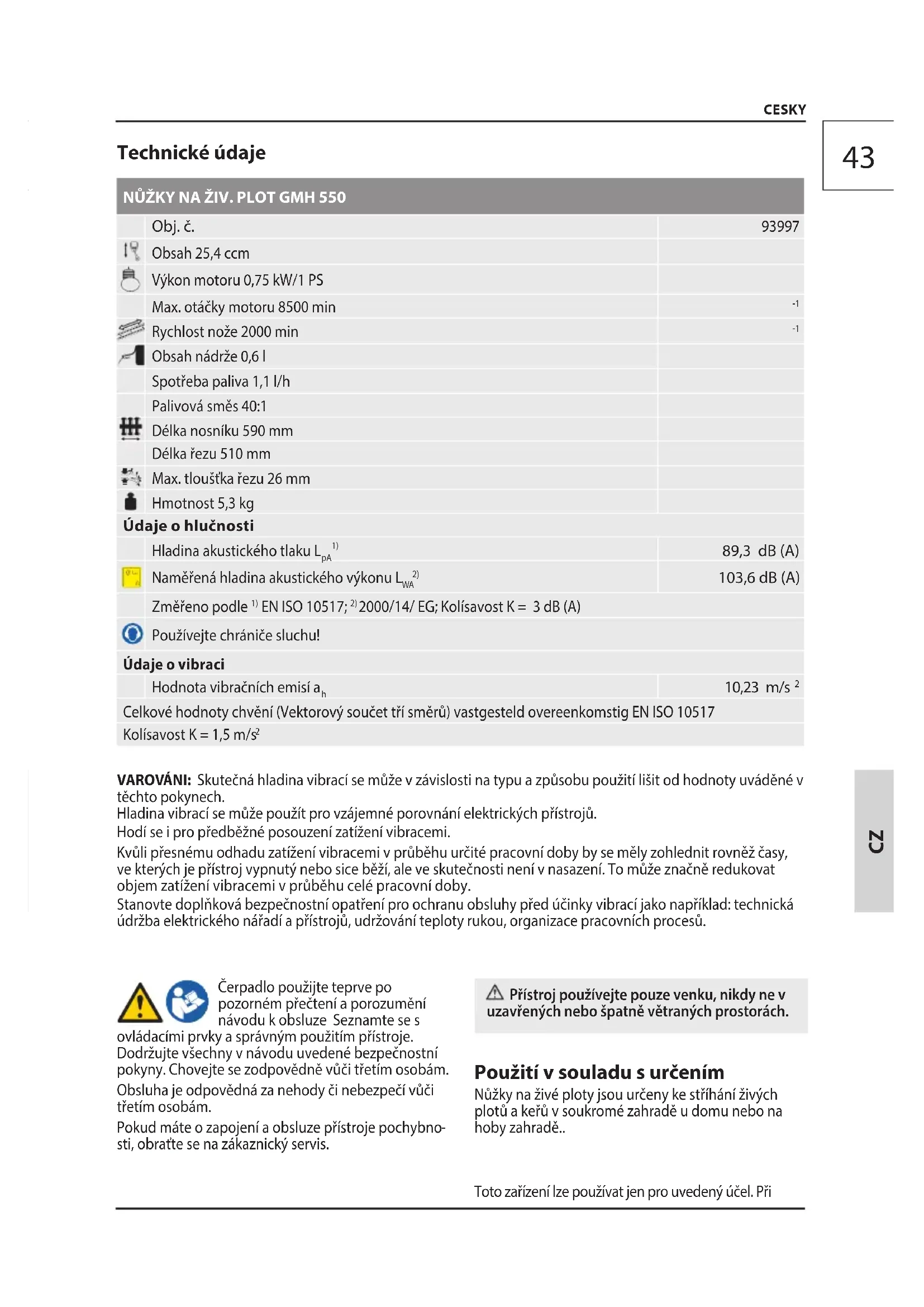 sti, obraťte se na zákaznický servis. Přístroj používejte pouze venku, nikdy ne v uzavřených nebo špatně větraných prostorách. Použití v souladu s určením Nůžky na živé ploty jsou určeny ke stříhání živých plotů a keřů v soukromé zahradě u domu nebo na hoby zahradě.. Toto zařízení lze používat jen pro uvedený účel. PřiD