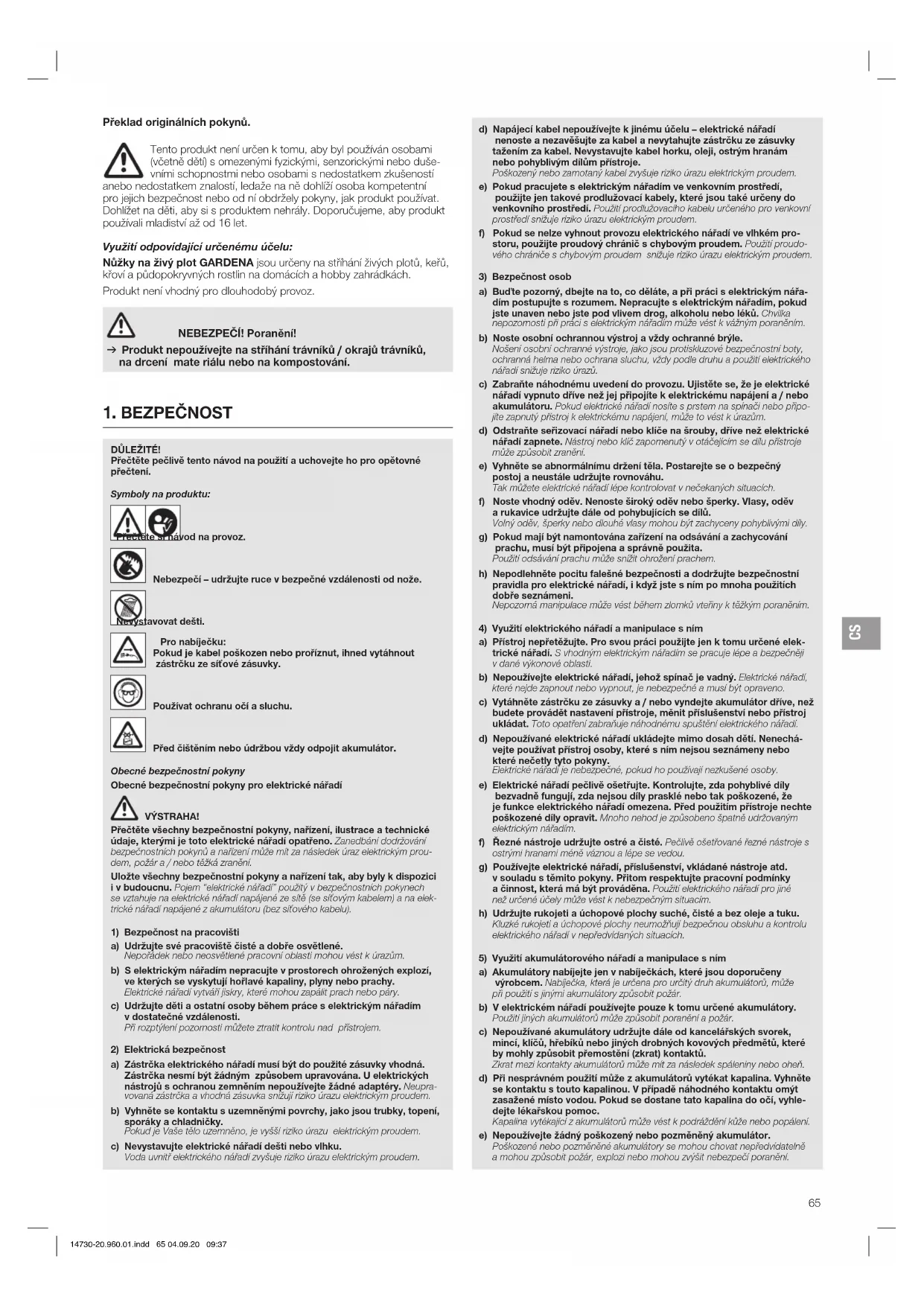 Překlad originálních pokynů. Tento produkt není určen k tomu, aby byl používán osobami (včetně dětí) s omezenými fyzickými, senzorickými nebo duše- vními schopnostmi nebo osobami s nedostatkem zkušeností anebo nedostatkem znalostí, ledaže na ně dohlíží osoba kompetentní pro jejich bezpečnost nebo od ní obdržely pokyny, jak produkt používat. Dohlížet na děti, aby si s produktem nehrály. Doporučujeme, aby produkt používali mladiství až od 16 let. Využití odpovídající určenému účelu: Nůžky na živý plot GARDENA jsou určeny na stříhání živých plotů, keřů, křoví a půdopokryvných rostlin na domácích a hobby zahrádkách. Produkt není vhodný pro dlouhodobý provoz. NEBEZPEČÍ! Poranění! v Produkt nepoužívejte na stříhání trávníků / okrajů trávníků, na drcení mate riálu nebo na kompostování. d) Napájecí kabel nepoužívejte k jinému účelu – elektrické nářadí nenoste a nezavěšujte za kabel a nevytahujte zástrčku ze zásuvky tažením za kabel. Nevystavujte kabel horku, oleji, ostrým hranám nebo pohyblivým dílům přístroje. Poškozený nebo zamotaný kabel zvyšuje riziko úrazu elektrickým proudem. e) Pokud pracujete s elektrickým nářadím ve venkovním prostředí, použijte jen takové prodlužovací kabely, které jsou také určeny do venkovního prostředí. Použití prodlužovacího kabelu určeného pro venkovní prostředí snižuje riziko úrazu elektrickým proudem. f) Pokud se nelze vyhnout provozu elektrického nářadí ve vlhkém pro- storu, použijte proudový chránič s chybovým proudem. Použití proudo- vého chrániče s chybovým proudem snižuje riziko úrazu elektrickým proudem.