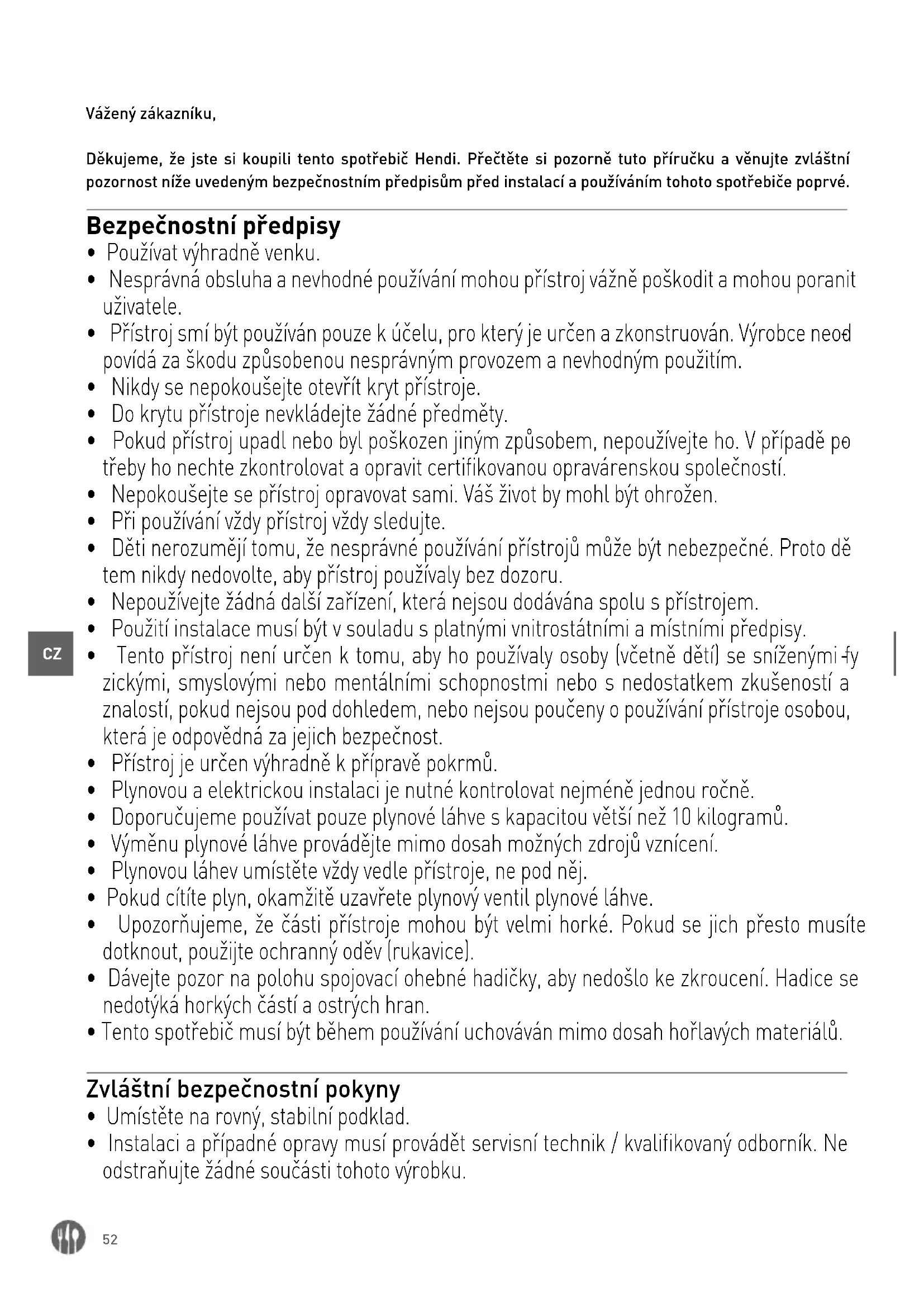 - Tento spotřebič musí být během používání uchováván mimo dosah hořlavých materiálů. Zvláštní bezpečnostní pokyny