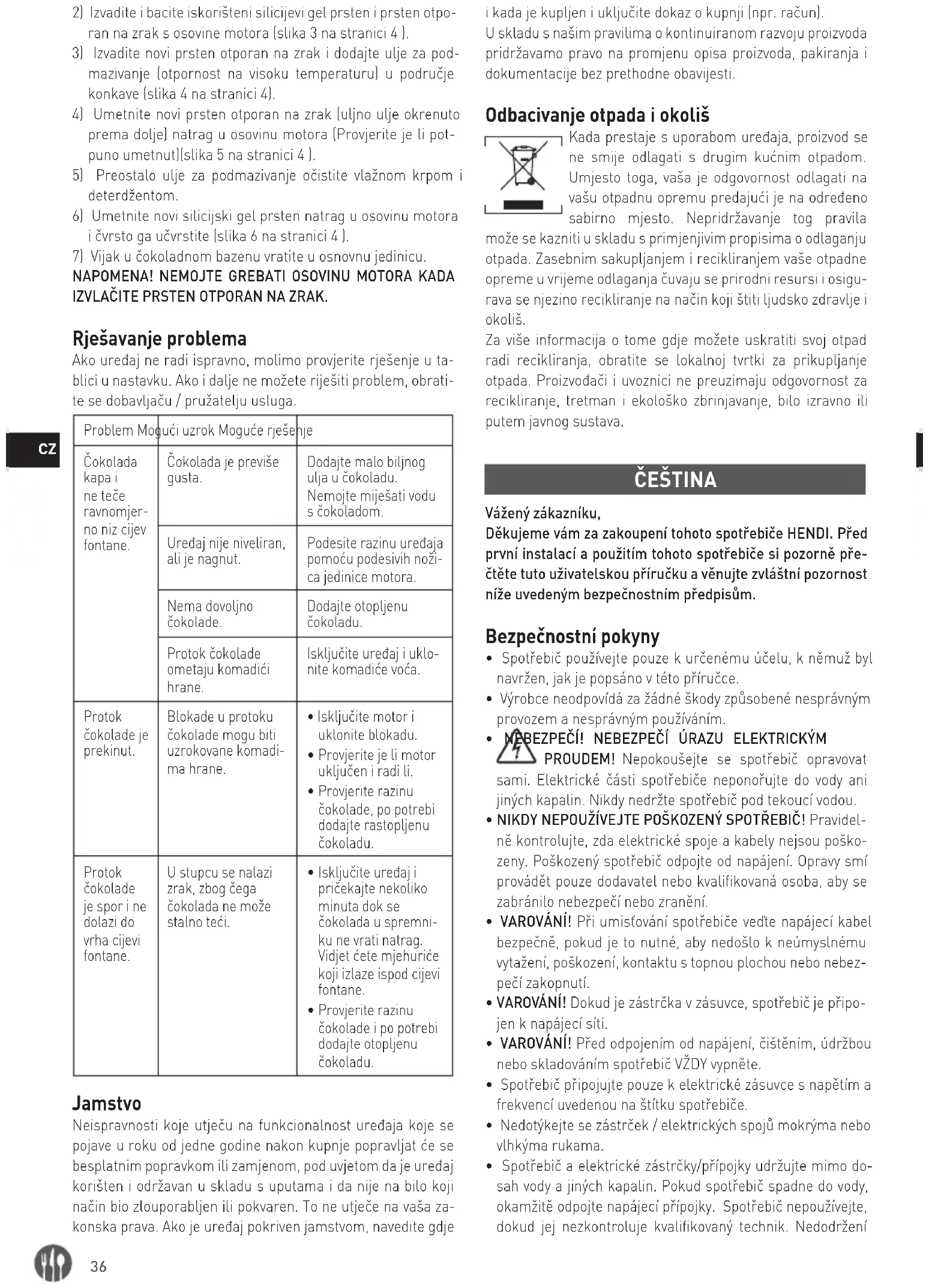 POZNÁMKA! PŘI VYJÍMÁNÍ VZDUCHOTĚSNÉHO KROUŽKU NEPOŠKRÁBEJTE OSU MOTORU. Odstraňování problémů Pokud spotřebič nefunguje správně, zkontrolujte prosím, zda je roztok v níže uvedené tabulce. Pokud problém stále nemů- žete vyřešit, obraťte se na dodavatele/poskytovatele služeb. Problém Možná příčina Možné řešení Čokoláda odkapává a nestéká rovnoměrně potrubím zásobníku. Čokoláda je příliš silná. Přidejte do čokolády trochu rostlinného oleje. Nemíchejte vodu s čokoládou! Spotřebič není vyrovnaný, ale nakloněný. Pomocí nastavitelných nožiček motorové jednotky upravte úroveň spotřebiče. Nedostatek čokolády. Přidejte trochu rozpuště- né čokolády. Tok čokolády je blokován kousky jídla. Vypněte spotřebič a vyjměte kusy ovoce. Průtok čokolády je přerušen. Ucpání toku čokolády může být způsobeno kousky jídla.